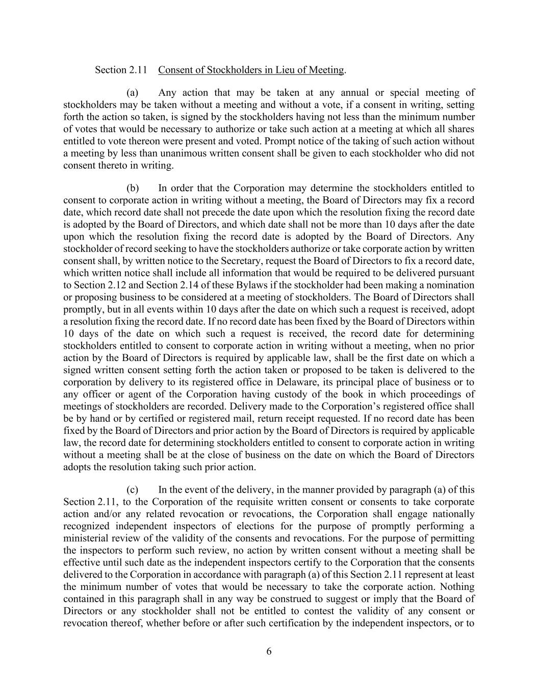 6 Section 2.11 Consent of Stockholders in Lieu of Meeting. (a) Any action that may be taken at any annual or special meeting of stockholders may be taken without a meeting and without a vote, if a consent in writing, setting forth the action so taken, is signed by the stockholders having not less than the minimum number of votes that would be necessary to authorize or take such action at a meeting at which all shares entitled to vote thereon were present and voted. Prompt notice of the taking of such action without a meeting by less than unanimous written consent shall be given to each stockholder who did not consent thereto in writing. (b) In order that the Corporation may determine the stockholders entitled to consent to corporate action in writing without a meeting, the Board of Directors may fix a record date, which record date shall not precede the date upon which the resolution fixing the record date is adopted by the Board of Directors, and which date shall not be more than 10 days after the date upon which the resolution fixing the record date is adopted by the Board of Directors. Any stockholder of record seeking to have the stockholders authorize or take corporate action by written consent shall, by written notice to the Secretary, request the Board of Directors to fix a record date, which written notice shall include all information that would be required to be delivered pursuant to Section 2.12 and Section 2.14 of these Bylaws if the stockholder had been making a nomination or proposing business to be considered at a meeting of stockholders. The Board of Directors shall promptly, but in all events within 10 days after the date on which such a request is received, adopt a resolution fixing the record date. If no record date has been fixed by the Board of Directors within 10 days of the date on which such a request is received, the record date for determining stockholders entitled to consent to corporate action in writing without a meeting, when no prior action by the Board of Directors is required by applicable law, shall be the first date on which a signed written consent setting forth the action taken or proposed to be taken is delivered to the corporation by delivery to its registered office in Delaware, its principal place of business or to any officer or agent of the Corporation having custody of the book in which proceedings of meetings of stockholders are recorded. Delivery made to the Corporation’s registered office shall be by hand or by certified or registered mail, return receipt requested. If no record date has been fixed by the Board of Directors and prior action by the Board of Directors is required by applicable law, the record date for determining stockholders entitled to consent to corporate action in writing without a meeting shall be at the close of business on the date on which the Board of Directors adopts the resolution taking such prior action. (c) In the event of the delivery, in the manner provided by paragraph (a) of this Section 2.11, to the Corporation of the requisite written consent or consents to take corporate action and/or any related revocation or revocations, the Corporation shall engage nationally recognized independent inspectors of elections for the purpose of promptly performing a ministerial review of the validity of the consents and revocations. For the purpose of permitting the inspectors to perform such review, no action by written consent without a meeting shall be effective until such date as the independent inspectors certify to the Corporation that the consents delivered to the Corporation in accordance with paragraph (a) of this Section 2.11 represent at least the minimum number of votes that would be necessary to take the corporate action. Nothing contained in this paragraph shall in any way be construed to suggest or imply that the Board of Directors or any stockholder shall not be entitled to contest the validity of any consent or revocation thereof, whether before or after such certification by the independent inspectors, or to