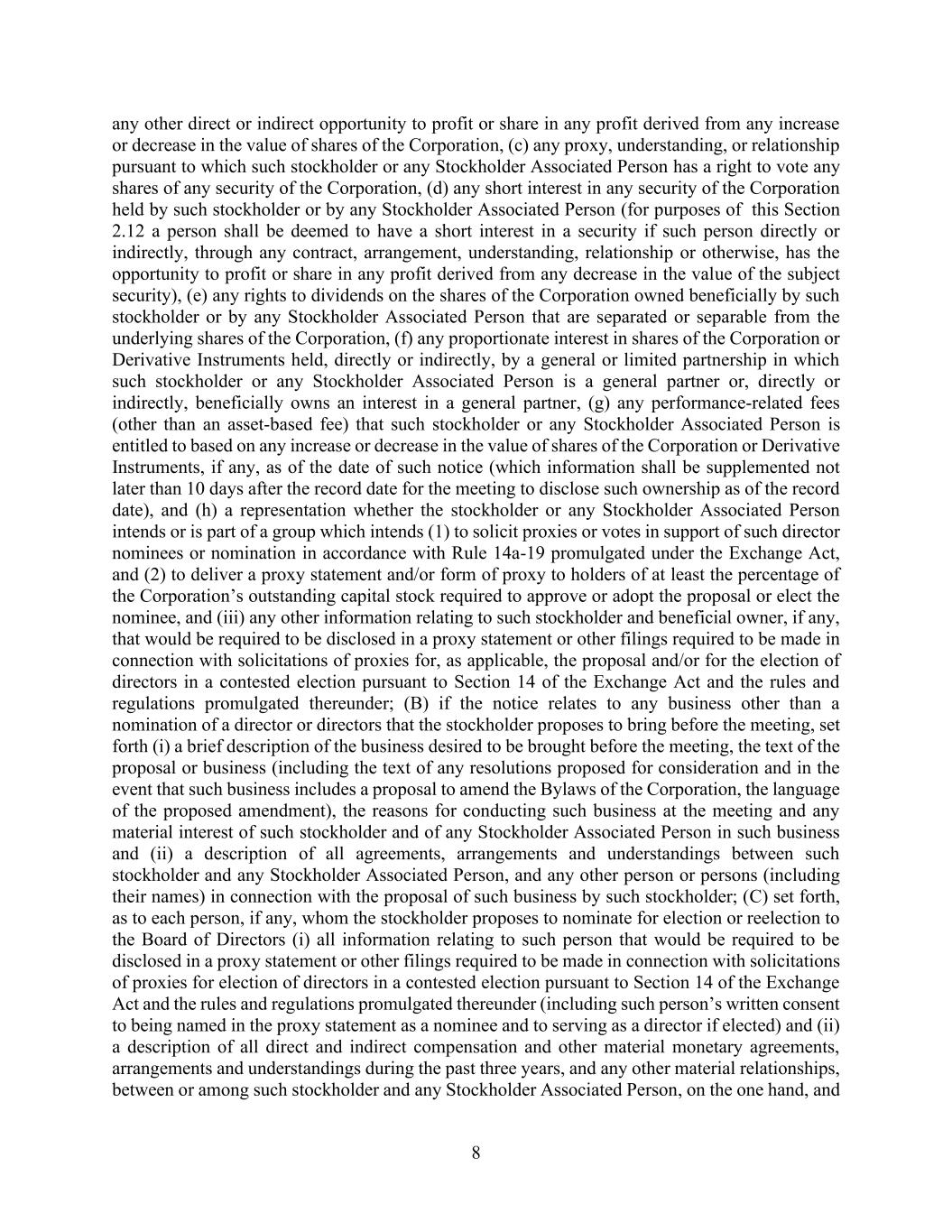 8 any other direct or indirect opportunity to profit or share in any profit derived from any increase or decrease in the value of shares of the Corporation, (c) any proxy, understanding, or relationship pursuant to which such stockholder or any Stockholder Associated Person has a right to vote any shares of any security of the Corporation, (d) any short interest in any security of the Corporation held by such stockholder or by any Stockholder Associated Person (for purposes of this Section 2.12 a person shall be deemed to have a short interest in a security if such person directly or indirectly, through any contract, arrangement, understanding, relationship or otherwise, has the opportunity to profit or share in any profit derived from any decrease in the value of the subject security), (e) any rights to dividends on the shares of the Corporation owned beneficially by such stockholder or by any Stockholder Associated Person that are separated or separable from the underlying shares of the Corporation, (f) any proportionate interest in shares of the Corporation or Derivative Instruments held, directly or indirectly, by a general or limited partnership in which such stockholder or any Stockholder Associated Person is a general partner or, directly or indirectly, beneficially owns an interest in a general partner, (g) any performance-related fees (other than an asset-based fee) that such stockholder or any Stockholder Associated Person is entitled to based on any increase or decrease in the value of shares of the Corporation or Derivative Instruments, if any, as of the date of such notice (which information shall be supplemented not later than 10 days after the record date for the meeting to disclose such ownership as of the record date), and (h) a representation whether the stockholder or any Stockholder Associated Person intends or is part of a group which intends (1) to solicit proxies or votes in support of such director nominees or nomination in accordance with Rule 14a-19 promulgated under the Exchange Act, and (2) to deliver a proxy statement and/or form of proxy to holders of at least the percentage of the Corporation’s outstanding capital stock required to approve or adopt the proposal or elect the nominee, and (iii) any other information relating to such stockholder and beneficial owner, if any, that would be required to be disclosed in a proxy statement or other filings required to be made in connection with solicitations of proxies for, as applicable, the proposal and/or for the election of directors in a contested election pursuant to Section 14 of the Exchange Act and the rules and regulations promulgated thereunder; (B) if the notice relates to any business other than a nomination of a director or directors that the stockholder proposes to bring before the meeting, set forth (i) a brief description of the business desired to be brought before the meeting, the text of the proposal or business (including the text of any resolutions proposed for consideration and in the event that such business includes a proposal to amend the Bylaws of the Corporation, the language of the proposed amendment), the reasons for conducting such business at the meeting and any material interest of such stockholder and of any Stockholder Associated Person in such business and (ii) a description of all agreements, arrangements and understandings between such stockholder and any Stockholder Associated Person, and any other person or persons (including their names) in connection with the proposal of such business by such stockholder; (C) set forth, as to each person, if any, whom the stockholder proposes to nominate for election or reelection to the Board of Directors (i) all information relating to such person that would be required to be disclosed in a proxy statement or other filings required to be made in connection with solicitations of proxies for election of directors in a contested election pursuant to Section 14 of the Exchange Act and the rules and regulations promulgated thereunder (including such person’s written consent to being named in the proxy statement as a nominee and to serving as a director if elected) and (ii) a description of all direct and indirect compensation and other material monetary agreements, arrangements and understandings during the past three years, and any other material relationships, between or among such stockholder and any Stockholder Associated Person, on the one hand, and
