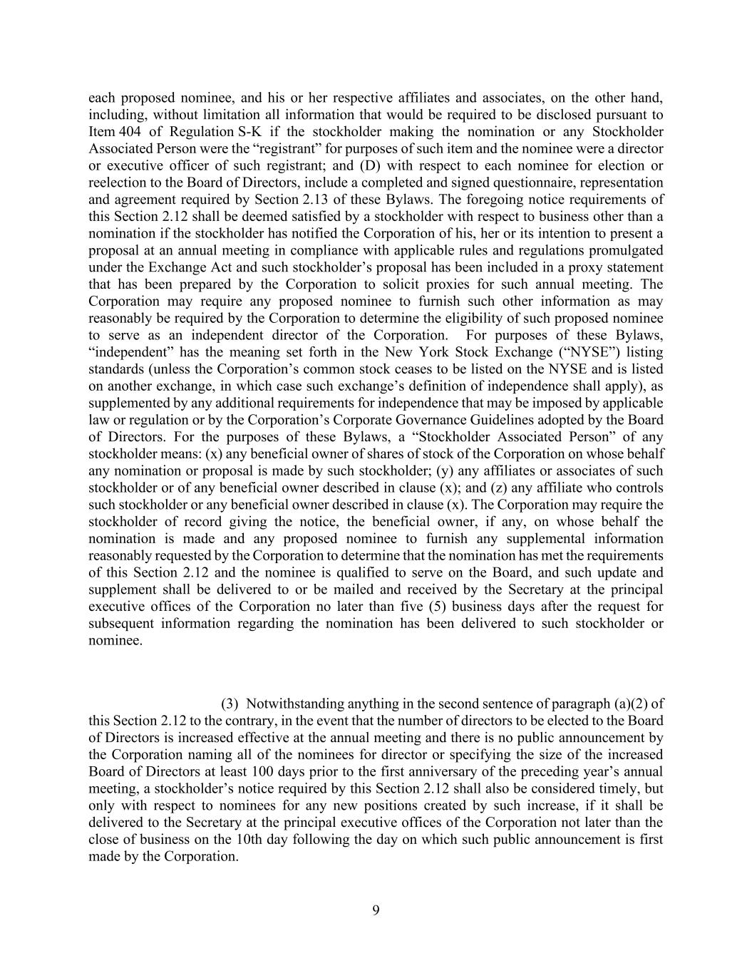 9 each proposed nominee, and his or her respective affiliates and associates, on the other hand, including, without limitation all information that would be required to be disclosed pursuant to Item 404 of Regulation S-K if the stockholder making the nomination or any Stockholder Associated Person were the “registrant” for purposes of such item and the nominee were a director or executive officer of such registrant; and (D) with respect to each nominee for election or reelection to the Board of Directors, include a completed and signed questionnaire, representation and agreement required by Section 2.13 of these Bylaws. The foregoing notice requirements of this Section 2.12 shall be deemed satisfied by a stockholder with respect to business other than a nomination if the stockholder has notified the Corporation of his, her or its intention to present a proposal at an annual meeting in compliance with applicable rules and regulations promulgated under the Exchange Act and such stockholder’s proposal has been included in a proxy statement that has been prepared by the Corporation to solicit proxies for such annual meeting. The Corporation may require any proposed nominee to furnish such other information as may reasonably be required by the Corporation to determine the eligibility of such proposed nominee to serve as an independent director of the Corporation. For purposes of these Bylaws, “independent” has the meaning set forth in the New York Stock Exchange (“NYSE”) listing standards (unless the Corporation’s common stock ceases to be listed on the NYSE and is listed on another exchange, in which case such exchange’s definition of independence shall apply), as supplemented by any additional requirements for independence that may be imposed by applicable law or regulation or by the Corporation’s Corporate Governance Guidelines adopted by the Board of Directors. For the purposes of these Bylaws, a “Stockholder Associated Person” of any stockholder means: (x) any beneficial owner of shares of stock of the Corporation on whose behalf any nomination or proposal is made by such stockholder; (y) any affiliates or associates of such stockholder or of any beneficial owner described in clause (x); and (z) any affiliate who controls such stockholder or any beneficial owner described in clause (x). The Corporation may require the stockholder of record giving the notice, the beneficial owner, if any, on whose behalf the nomination is made and any proposed nominee to furnish any supplemental information reasonably requested by the Corporation to determine that the nomination has met the requirements of this Section 2.12 and the nominee is qualified to serve on the Board, and such update and supplement shall be delivered to or be mailed and received by the Secretary at the principal executive offices of the Corporation no later than five (5) business days after the request for subsequent information regarding the nomination has been delivered to such stockholder or nominee. (3) Notwithstanding anything in the second sentence of paragraph (a)(2) of this Section 2.12 to the contrary, in the event that the number of directors to be elected to the Board of Directors is increased effective at the annual meeting and there is no public announcement by the Corporation naming all of the nominees for director or specifying the size of the increased Board of Directors at least 100 days prior to the first anniversary of the preceding year’s annual meeting, a stockholder’s notice required by this Section 2.12 shall also be considered timely, but only with respect to nominees for any new positions created by such increase, if it shall be delivered to the Secretary at the principal executive offices of the Corporation not later than the close of business on the 10th day following the day on which such public announcement is first made by the Corporation.