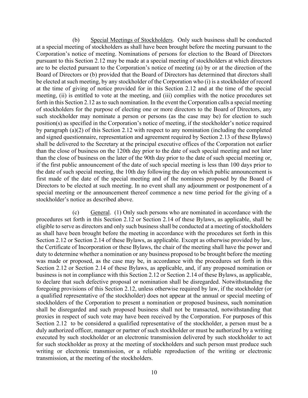 10 (b) Special Meetings of Stockholders. Only such business shall be conducted at a special meeting of stockholders as shall have been brought before the meeting pursuant to the Corporation’s notice of meeting. Nominations of persons for election to the Board of Directors pursuant to this Section 2.12 may be made at a special meeting of stockholders at which directors are to be elected pursuant to the Corporation’s notice of meeting (a) by or at the direction of the Board of Directors or (b) provided that the Board of Directors has determined that directors shall be elected at such meeting, by any stockholder of the Corporation who (i) is a stockholder of record at the time of giving of notice provided for in this Section 2.12 and at the time of the special meeting, (ii) is entitled to vote at the meeting, and (iii) complies with the notice procedures set forth in this Section 2.12 as to such nomination. In the event the Corporation calls a special meeting of stockholders for the purpose of electing one or more directors to the Board of Directors, any such stockholder may nominate a person or persons (as the case may be) for election to such position(s) as specified in the Corporation’s notice of meeting, if the stockholder’s notice required by paragraph (a)(2) of this Section 2.12 with respect to any nomination (including the completed and signed questionnaire, representation and agreement required by Section 2.13 of these Bylaws) shall be delivered to the Secretary at the principal executive offices of the Corporation not earlier than the close of business on the 120th day prior to the date of such special meeting and not later than the close of business on the later of the 90th day prior to the date of such special meeting or, if the first public announcement of the date of such special meeting is less than 100 days prior to the date of such special meeting, the 10th day following the day on which public announcement is first made of the date of the special meeting and of the nominees proposed by the Board of Directors to be elected at such meeting. In no event shall any adjournment or postponement of a special meeting or the announcement thereof commence a new time period for the giving of a stockholder’s notice as described above. (c) General. (1) Only such persons who are nominated in accordance with the procedures set forth in this Section 2.12 or Section 2.14 of these Bylaws, as applicable, shall be eligible to serve as directors and only such business shall be conducted at a meeting of stockholders as shall have been brought before the meeting in accordance with the procedures set forth in this Section 2.12 or Section 2.14 of these Bylaws, as applicable. Except as otherwise provided by law, the Certificate of Incorporation or these Bylaws, the chair of the meeting shall have the power and duty to determine whether a nomination or any business proposed to be brought before the meeting was made or proposed, as the case may be, in accordance with the procedures set forth in this Section 2.12 or Section 2.14 of these Bylaws, as applicable, and, if any proposed nomination or business is not in compliance with this Section 2.12 or Section 2.14 of these Bylaws, as applicable, to declare that such defective proposal or nomination shall be disregarded. Notwithstanding the foregoing provisions of this Section 2.12, unless otherwise required by law, if the stockholder (or a qualified representative of the stockholder) does not appear at the annual or special meeting of stockholders of the Corporation to present a nomination or proposed business, such nomination shall be disregarded and such proposed business shall not be transacted, notwithstanding that proxies in respect of such vote may have been received by the Corporation. For purposes of this Section 2.12 to be considered a qualified representative of the stockholder, a person must be a duly authorized officer, manager or partner of such stockholder or must be authorized by a writing executed by such stockholder or an electronic transmission delivered by such stockholder to act for such stockholder as proxy at the meeting of stockholders and such person must produce such writing or electronic transmission, or a reliable reproduction of the writing or electronic transmission, at the meeting of the stockholders.