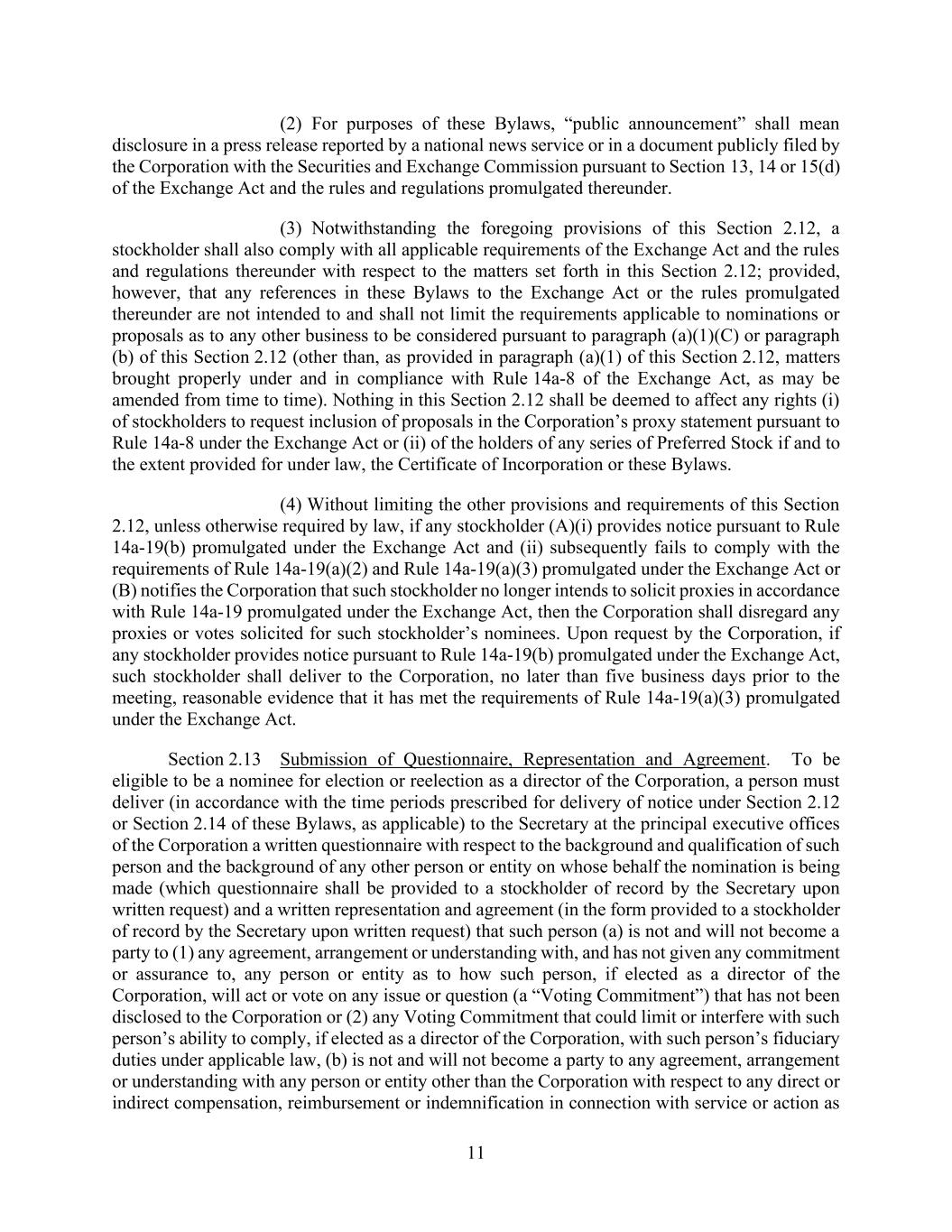 11 (2) For purposes of these Bylaws, “public announcement” shall mean disclosure in a press release reported by a national news service or in a document publicly filed by the Corporation with the Securities and Exchange Commission pursuant to Section 13, 14 or 15(d) of the Exchange Act and the rules and regulations promulgated thereunder. (3) Notwithstanding the foregoing provisions of this Section 2.12, a stockholder shall also comply with all applicable requirements of the Exchange Act and the rules and regulations thereunder with respect to the matters set forth in this Section 2.12; provided, however, that any references in these Bylaws to the Exchange Act or the rules promulgated thereunder are not intended to and shall not limit the requirements applicable to nominations or proposals as to any other business to be considered pursuant to paragraph (a)(1)(C) or paragraph (b) of this Section 2.12 (other than, as provided in paragraph (a)(1) of this Section 2.12, matters brought properly under and in compliance with Rule 14a-8 of the Exchange Act, as may be amended from time to time). Nothing in this Section 2.12 shall be deemed to affect any rights (i) of stockholders to request inclusion of proposals in the Corporation’s proxy statement pursuant to Rule 14a-8 under the Exchange Act or (ii) of the holders of any series of Preferred Stock if and to the extent provided for under law, the Certificate of Incorporation or these Bylaws. (4) Without limiting the other provisions and requirements of this Section 2.12, unless otherwise required by law, if any stockholder (A)(i) provides notice pursuant to Rule 14a-19(b) promulgated under the Exchange Act and (ii) subsequently fails to comply with the requirements of Rule 14a-19(a)(2) and Rule 14a-19(a)(3) promulgated under the Exchange Act or (B) notifies the Corporation that such stockholder no longer intends to solicit proxies in accordance with Rule 14a-19 promulgated under the Exchange Act, then the Corporation shall disregard any proxies or votes solicited for such stockholder’s nominees. Upon request by the Corporation, if any stockholder provides notice pursuant to Rule 14a-19(b) promulgated under the Exchange Act, such stockholder shall deliver to the Corporation, no later than five business days prior to the meeting, reasonable evidence that it has met the requirements of Rule 14a-19(a)(3) promulgated under the Exchange Act. Section 2.13 Submission of Questionnaire, Representation and Agreement. To be eligible to be a nominee for election or reelection as a director of the Corporation, a person must deliver (in accordance with the time periods prescribed for delivery of notice under Section 2.12 or Section 2.14 of these Bylaws, as applicable) to the Secretary at the principal executive offices of the Corporation a written questionnaire with respect to the background and qualification of such person and the background of any other person or entity on whose behalf the nomination is being made (which questionnaire shall be provided to a stockholder of record by the Secretary upon written request) and a written representation and agreement (in the form provided to a stockholder of record by the Secretary upon written request) that such person (a) is not and will not become a party to (1) any agreement, arrangement or understanding with, and has not given any commitment or assurance to, any person or entity as to how such person, if elected as a director of the Corporation, will act or vote on any issue or question (a “Voting Commitment”) that has not been disclosed to the Corporation or (2) any Voting Commitment that could limit or interfere with such person’s ability to comply, if elected as a director of the Corporation, with such person’s fiduciary duties under applicable law, (b) is not and will not become a party to any agreement, arrangement or understanding with any person or entity other than the Corporation with respect to any direct or indirect compensation, reimbursement or indemnification in connection with service or action as