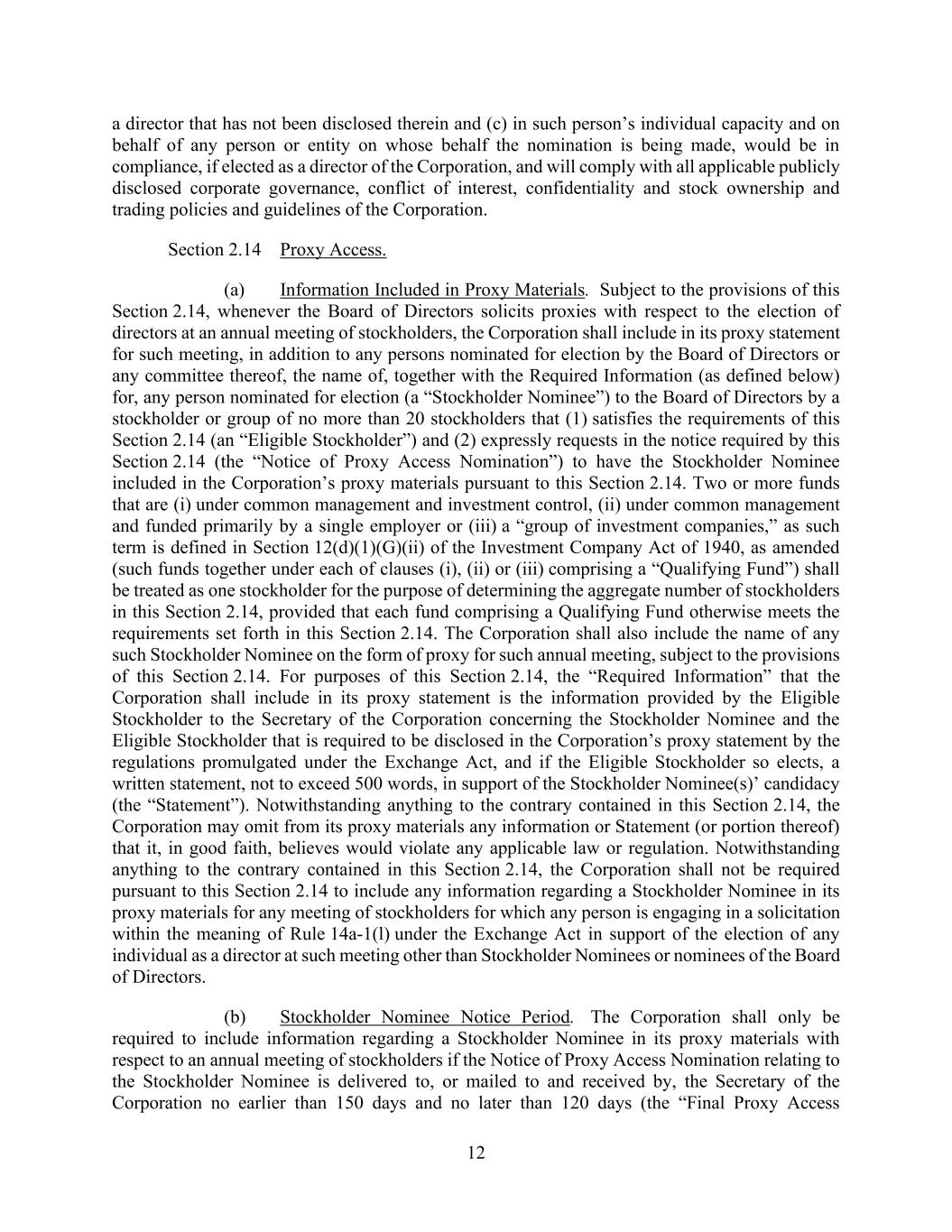 12 a director that has not been disclosed therein and (c) in such person’s individual capacity and on behalf of any person or entity on whose behalf the nomination is being made, would be in compliance, if elected as a director of the Corporation, and will comply with all applicable publicly disclosed corporate governance, conflict of interest, confidentiality and stock ownership and trading policies and guidelines of the Corporation. Section 2.14 Proxy Access. (a) Information Included in Proxy Materials. Subject to the provisions of this Section 2.14, whenever the Board of Directors solicits proxies with respect to the election of directors at an annual meeting of stockholders, the Corporation shall include in its proxy statement for such meeting, in addition to any persons nominated for election by the Board of Directors or any committee thereof, the name of, together with the Required Information (as defined below) for, any person nominated for election (a “Stockholder Nominee”) to the Board of Directors by a stockholder or group of no more than 20 stockholders that (1) satisfies the requirements of this Section 2.14 (an “Eligible Stockholder”) and (2) expressly requests in the notice required by this Section 2.14 (the “Notice of Proxy Access Nomination”) to have the Stockholder Nominee included in the Corporation’s proxy materials pursuant to this Section 2.14. Two or more funds that are (i) under common management and investment control, (ii) under common management and funded primarily by a single employer or (iii) a “group of investment companies,” as such term is defined in Section 12(d)(1)(G)(ii) of the Investment Company Act of 1940, as amended (such funds together under each of clauses (i), (ii) or (iii) comprising a “Qualifying Fund”) shall be treated as one stockholder for the purpose of determining the aggregate number of stockholders in this Section 2.14, provided that each fund comprising a Qualifying Fund otherwise meets the requirements set forth in this Section 2.14. The Corporation shall also include the name of any such Stockholder Nominee on the form of proxy for such annual meeting, subject to the provisions of this Section 2.14. For purposes of this Section 2.14, the “Required Information” that the Corporation shall include in its proxy statement is the information provided by the Eligible Stockholder to the Secretary of the Corporation concerning the Stockholder Nominee and the Eligible Stockholder that is required to be disclosed in the Corporation’s proxy statement by the regulations promulgated under the Exchange Act, and if the Eligible Stockholder so elects, a written statement, not to exceed 500 words, in support of the Stockholder Nominee(s)’ candidacy (the “Statement”). Notwithstanding anything to the contrary contained in this Section 2.14, the Corporation may omit from its proxy materials any information or Statement (or portion thereof) that it, in good faith, believes would violate any applicable law or regulation. Notwithstanding anything to the contrary contained in this Section 2.14, the Corporation shall not be required pursuant to this Section 2.14 to include any information regarding a Stockholder Nominee in its proxy materials for any meeting of stockholders for which any person is engaging in a solicitation within the meaning of Rule 14a-1(l) under the Exchange Act in support of the election of any individual as a director at such meeting other than Stockholder Nominees or nominees of the Board of Directors. (b) Stockholder Nominee Notice Period. The Corporation shall only be required to include information regarding a Stockholder Nominee in its proxy materials with respect to an annual meeting of stockholders if the Notice of Proxy Access Nomination relating to the Stockholder Nominee is delivered to, or mailed to and received by, the Secretary of the Corporation no earlier than 150 days and no later than 120 days (the “Final Proxy Access