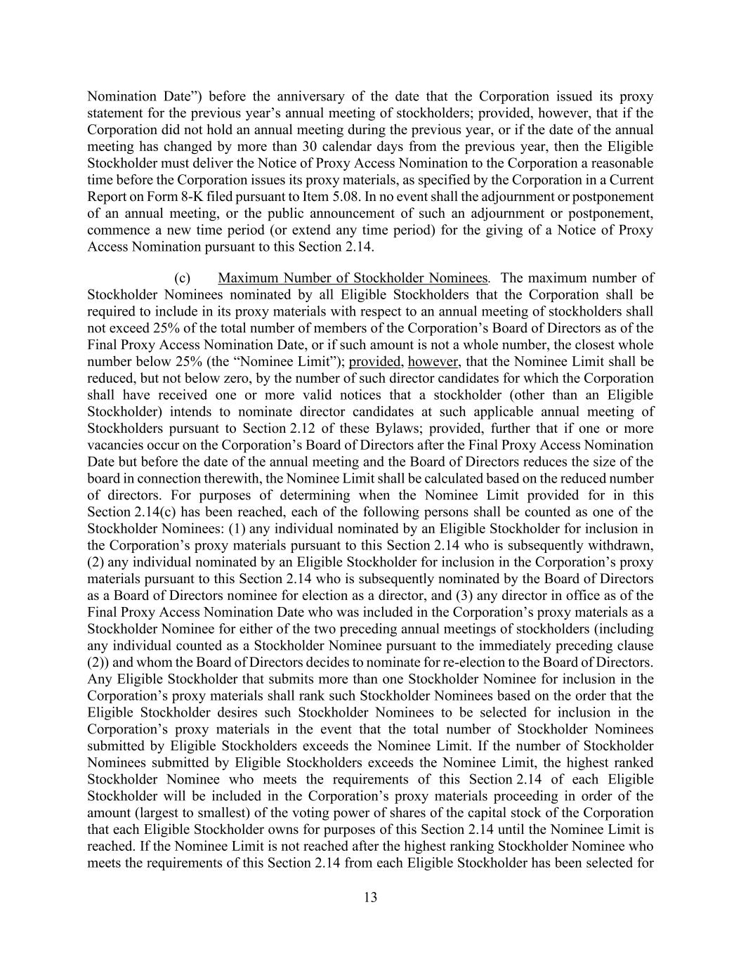 13 Nomination Date”) before the anniversary of the date that the Corporation issued its proxy statement for the previous year’s annual meeting of stockholders; provided, however, that if the Corporation did not hold an annual meeting during the previous year, or if the date of the annual meeting has changed by more than 30 calendar days from the previous year, then the Eligible Stockholder must deliver the Notice of Proxy Access Nomination to the Corporation a reasonable time before the Corporation issues its proxy materials, as specified by the Corporation in a Current Report on Form 8-K filed pursuant to Item 5.08. In no event shall the adjournment or postponement of an annual meeting, or the public announcement of such an adjournment or postponement, commence a new time period (or extend any time period) for the giving of a Notice of Proxy Access Nomination pursuant to this Section 2.14. (c) Maximum Number of Stockholder Nominees. The maximum number of Stockholder Nominees nominated by all Eligible Stockholders that the Corporation shall be required to include in its proxy materials with respect to an annual meeting of stockholders shall not exceed 25% of the total number of members of the Corporation’s Board of Directors as of the Final Proxy Access Nomination Date, or if such amount is not a whole number, the closest whole number below 25% (the “Nominee Limit”); provided, however, that the Nominee Limit shall be reduced, but not below zero, by the number of such director candidates for which the Corporation shall have received one or more valid notices that a stockholder (other than an Eligible Stockholder) intends to nominate director candidates at such applicable annual meeting of Stockholders pursuant to Section 2.12 of these Bylaws; provided, further that if one or more vacancies occur on the Corporation’s Board of Directors after the Final Proxy Access Nomination Date but before the date of the annual meeting and the Board of Directors reduces the size of the board in connection therewith, the Nominee Limit shall be calculated based on the reduced number of directors. For purposes of determining when the Nominee Limit provided for in this Section 2.14(c) has been reached, each of the following persons shall be counted as one of the Stockholder Nominees: (1) any individual nominated by an Eligible Stockholder for inclusion in the Corporation’s proxy materials pursuant to this Section 2.14 who is subsequently withdrawn, (2) any individual nominated by an Eligible Stockholder for inclusion in the Corporation’s proxy materials pursuant to this Section 2.14 who is subsequently nominated by the Board of Directors as a Board of Directors nominee for election as a director, and (3) any director in office as of the Final Proxy Access Nomination Date who was included in the Corporation’s proxy materials as a Stockholder Nominee for either of the two preceding annual meetings of stockholders (including any individual counted as a Stockholder Nominee pursuant to the immediately preceding clause (2)) and whom the Board of Directors decides to nominate for re-election to the Board of Directors. Any Eligible Stockholder that submits more than one Stockholder Nominee for inclusion in the Corporation’s proxy materials shall rank such Stockholder Nominees based on the order that the Eligible Stockholder desires such Stockholder Nominees to be selected for inclusion in the Corporation’s proxy materials in the event that the total number of Stockholder Nominees submitted by Eligible Stockholders exceeds the Nominee Limit. If the number of Stockholder Nominees submitted by Eligible Stockholders exceeds the Nominee Limit, the highest ranked Stockholder Nominee who meets the requirements of this Section 2.14 of each Eligible Stockholder will be included in the Corporation’s proxy materials proceeding in order of the amount (largest to smallest) of the voting power of shares of the capital stock of the Corporation that each Eligible Stockholder owns for purposes of this Section 2.14 until the Nominee Limit is reached. If the Nominee Limit is not reached after the highest ranking Stockholder Nominee who meets the requirements of this Section 2.14 from each Eligible Stockholder has been selected for