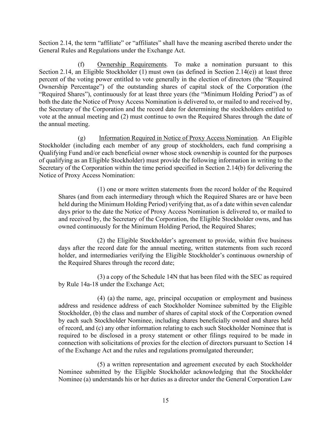 15 Section 2.14, the term “affiliate” or “affiliates” shall have the meaning ascribed thereto under the General Rules and Regulations under the Exchange Act. (f) Ownership Requirements. To make a nomination pursuant to this Section 2.14, an Eligible Stockholder (1) must own (as defined in Section 2.14(e)) at least three percent of the voting power entitled to vote generally in the election of directors (the “Required Ownership Percentage”) of the outstanding shares of capital stock of the Corporation (the “Required Shares”), continuously for at least three years (the “Minimum Holding Period”) as of both the date the Notice of Proxy Access Nomination is delivered to, or mailed to and received by, the Secretary of the Corporation and the record date for determining the stockholders entitled to vote at the annual meeting and (2) must continue to own the Required Shares through the date of the annual meeting. (g) Information Required in Notice of Proxy Access Nomination. An Eligible Stockholder (including each member of any group of stockholders, each fund comprising a Qualifying Fund and/or each beneficial owner whose stock ownership is counted for the purposes of qualifying as an Eligible Stockholder) must provide the following information in writing to the Secretary of the Corporation within the time period specified in Section 2.14(b) for delivering the Notice of Proxy Access Nomination: (1) one or more written statements from the record holder of the Required Shares (and from each intermediary through which the Required Shares are or have been held during the Minimum Holding Period) verifying that, as of a date within seven calendar days prior to the date the Notice of Proxy Access Nomination is delivered to, or mailed to and received by, the Secretary of the Corporation, the Eligible Stockholder owns, and has owned continuously for the Minimum Holding Period, the Required Shares; (2) the Eligible Stockholder’s agreement to provide, within five business days after the record date for the annual meeting, written statements from such record holder, and intermediaries verifying the Eligible Stockholder’s continuous ownership of the Required Shares through the record date; (3) a copy of the Schedule 14N that has been filed with the SEC as required by Rule 14a-18 under the Exchange Act; (4) (a) the name, age, principal occupation or employment and business address and residence address of each Stockholder Nominee submitted by the Eligible Stockholder, (b) the class and number of shares of capital stock of the Corporation owned by each such Stockholder Nominee, including shares beneficially owned and shares held of record, and (c) any other information relating to each such Stockholder Nominee that is required to be disclosed in a proxy statement or other filings required to be made in connection with solicitations of proxies for the election of directors pursuant to Section 14 of the Exchange Act and the rules and regulations promulgated thereunder; (5) a written representation and agreement executed by each Stockholder Nominee submitted by the Eligible Stockholder acknowledging that the Stockholder Nominee (a) understands his or her duties as a director under the General Corporation Law