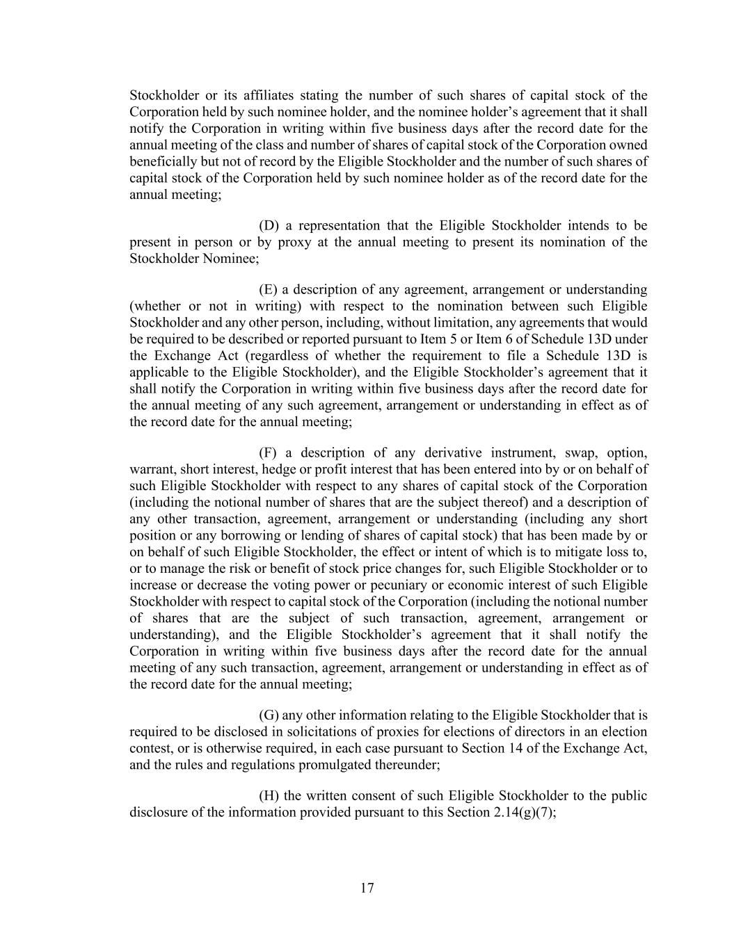 17 Stockholder or its affiliates stating the number of such shares of capital stock of the Corporation held by such nominee holder, and the nominee holder’s agreement that it shall notify the Corporation in writing within five business days after the record date for the annual meeting of the class and number of shares of capital stock of the Corporation owned beneficially but not of record by the Eligible Stockholder and the number of such shares of capital stock of the Corporation held by such nominee holder as of the record date for the annual meeting; (D) a representation that the Eligible Stockholder intends to be present in person or by proxy at the annual meeting to present its nomination of the Stockholder Nominee; (E) a description of any agreement, arrangement or understanding (whether or not in writing) with respect to the nomination between such Eligible Stockholder and any other person, including, without limitation, any agreements that would be required to be described or reported pursuant to Item 5 or Item 6 of Schedule 13D under the Exchange Act (regardless of whether the requirement to file a Schedule 13D is applicable to the Eligible Stockholder), and the Eligible Stockholder’s agreement that it shall notify the Corporation in writing within five business days after the record date for the annual meeting of any such agreement, arrangement or understanding in effect as of the record date for the annual meeting; (F) a description of any derivative instrument, swap, option, warrant, short interest, hedge or profit interest that has been entered into by or on behalf of such Eligible Stockholder with respect to any shares of capital stock of the Corporation (including the notional number of shares that are the subject thereof) and a description of any other transaction, agreement, arrangement or understanding (including any short position or any borrowing or lending of shares of capital stock) that has been made by or on behalf of such Eligible Stockholder, the effect or intent of which is to mitigate loss to, or to manage the risk or benefit of stock price changes for, such Eligible Stockholder or to increase or decrease the voting power or pecuniary or economic interest of such Eligible Stockholder with respect to capital stock of the Corporation (including the notional number of shares that are the subject of such transaction, agreement, arrangement or understanding), and the Eligible Stockholder’s agreement that it shall notify the Corporation in writing within five business days after the record date for the annual meeting of any such transaction, agreement, arrangement or understanding in effect as of the record date for the annual meeting; (G) any other information relating to the Eligible Stockholder that is required to be disclosed in solicitations of proxies for elections of directors in an election contest, or is otherwise required, in each case pursuant to Section 14 of the Exchange Act, and the rules and regulations promulgated thereunder; (H) the written consent of such Eligible Stockholder to the public disclosure of the information provided pursuant to this Section 2.14(g)(7);
