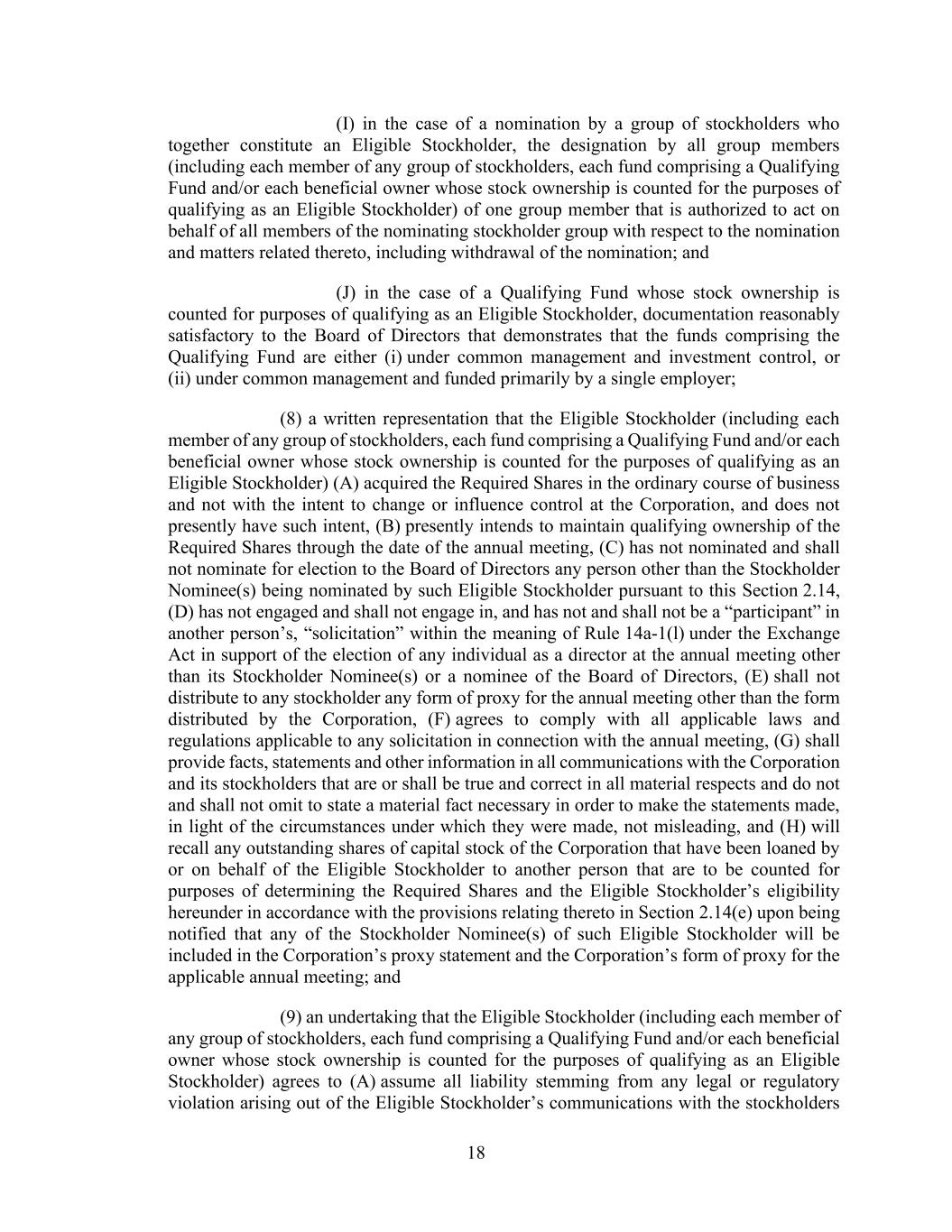 18 (I) in the case of a nomination by a group of stockholders who together constitute an Eligible Stockholder, the designation by all group members (including each member of any group of stockholders, each fund comprising a Qualifying Fund and/or each beneficial owner whose stock ownership is counted for the purposes of qualifying as an Eligible Stockholder) of one group member that is authorized to act on behalf of all members of the nominating stockholder group with respect to the nomination and matters related thereto, including withdrawal of the nomination; and (J) in the case of a Qualifying Fund whose stock ownership is counted for purposes of qualifying as an Eligible Stockholder, documentation reasonably satisfactory to the Board of Directors that demonstrates that the funds comprising the Qualifying Fund are either (i) under common management and investment control, or (ii) under common management and funded primarily by a single employer; (8) a written representation that the Eligible Stockholder (including each member of any group of stockholders, each fund comprising a Qualifying Fund and/or each beneficial owner whose stock ownership is counted for the purposes of qualifying as an Eligible Stockholder) (A) acquired the Required Shares in the ordinary course of business and not with the intent to change or influence control at the Corporation, and does not presently have such intent, (B) presently intends to maintain qualifying ownership of the Required Shares through the date of the annual meeting, (C) has not nominated and shall not nominate for election to the Board of Directors any person other than the Stockholder Nominee(s) being nominated by such Eligible Stockholder pursuant to this Section 2.14, (D) has not engaged and shall not engage in, and has not and shall not be a “participant” in another person’s, “solicitation” within the meaning of Rule 14a-1(l) under the Exchange Act in support of the election of any individual as a director at the annual meeting other than its Stockholder Nominee(s) or a nominee of the Board of Directors, (E) shall not distribute to any stockholder any form of proxy for the annual meeting other than the form distributed by the Corporation, (F) agrees to comply with all applicable laws and regulations applicable to any solicitation in connection with the annual meeting, (G) shall provide facts, statements and other information in all communications with the Corporation and its stockholders that are or shall be true and correct in all material respects and do not and shall not omit to state a material fact necessary in order to make the statements made, in light of the circumstances under which they were made, not misleading, and (H) will recall any outstanding shares of capital stock of the Corporation that have been loaned by or on behalf of the Eligible Stockholder to another person that are to be counted for purposes of determining the Required Shares and the Eligible Stockholder’s eligibility hereunder in accordance with the provisions relating thereto in Section 2.14(e) upon being notified that any of the Stockholder Nominee(s) of such Eligible Stockholder will be included in the Corporation’s proxy statement and the Corporation’s form of proxy for the applicable annual meeting; and (9) an undertaking that the Eligible Stockholder (including each member of any group of stockholders, each fund comprising a Qualifying Fund and/or each beneficial owner whose stock ownership is counted for the purposes of qualifying as an Eligible Stockholder) agrees to (A) assume all liability stemming from any legal or regulatory violation arising out of the Eligible Stockholder’s communications with the stockholders