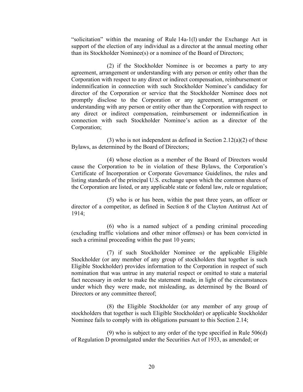 20 “solicitation” within the meaning of Rule 14a-1(l) under the Exchange Act in support of the election of any individual as a director at the annual meeting other than its Stockholder Nominee(s) or a nominee of the Board of Directors; (2) if the Stockholder Nominee is or becomes a party to any agreement, arrangement or understanding with any person or entity other than the Corporation with respect to any direct or indirect compensation, reimbursement or indemnification in connection with such Stockholder Nominee’s candidacy for director of the Corporation or service that the Stockholder Nominee does not promptly disclose to the Corporation or any agreement, arrangement or understanding with any person or entity other than the Corporation with respect to any direct or indirect compensation, reimbursement or indemnification in connection with such Stockholder Nominee’s action as a director of the Corporation; (3) who is not independent as defined in Section 2.12(a)(2) of these Bylaws, as determined by the Board of Directors; (4) whose election as a member of the Board of Directors would cause the Corporation to be in violation of these Bylaws, the Corporation’s Certificate of Incorporation or Corporate Governance Guidelines, the rules and listing standards of the principal U.S. exchange upon which the common shares of the Corporation are listed, or any applicable state or federal law, rule or regulation; (5) who is or has been, within the past three years, an officer or director of a competitor, as defined in Section 8 of the Clayton Antitrust Act of 1914; (6) who is a named subject of a pending criminal proceeding (excluding traffic violations and other minor offenses) or has been convicted in such a criminal proceeding within the past 10 years; (7) if such Stockholder Nominee or the applicable Eligible Stockholder (or any member of any group of stockholders that together is such Eligible Stockholder) provides information to the Corporation in respect of such nomination that was untrue in any material respect or omitted to state a material fact necessary in order to make the statement made, in light of the circumstances under which they were made, not misleading, as determined by the Board of Directors or any committee thereof; (8) the Eligible Stockholder (or any member of any group of stockholders that together is such Eligible Stockholder) or applicable Stockholder Nominee fails to comply with its obligations pursuant to this Section 2.14; (9) who is subject to any order of the type specified in Rule 506(d) of Regulation D promulgated under the Securities Act of 1933, as amended; or