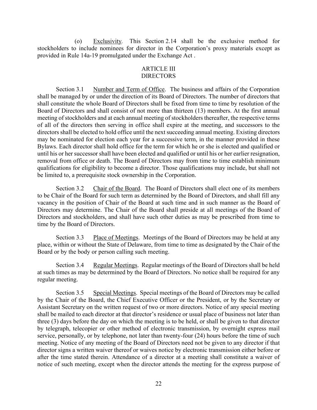 22 (o) Exclusivity. This Section 2.14 shall be the exclusive method for stockholders to include nominees for director in the Corporation’s proxy materials except as provided in Rule 14a-19 promulgated under the Exchange Act . ARTICLE III DIRECTORS Section 3.1 Number and Term of Office. The business and affairs of the Corporation shall be managed by or under the direction of its Board of Directors. The number of directors that shall constitute the whole Board of Directors shall be fixed from time to time by resolution of the Board of Directors and shall consist of not more than thirteen (13) members. At the first annual meeting of stockholders and at each annual meeting of stockholders thereafter, the respective terms of all of the directors then serving in office shall expire at the meeting, and successors to the directors shall be elected to hold office until the next succeeding annual meeting. Existing directors may be nominated for election each year for a successive term, in the manner provided in these Bylaws. Each director shall hold office for the term for which he or she is elected and qualified or until his or her successor shall have been elected and qualified or until his or her earlier resignation, removal from office or death. The Board of Directors may from time to time establish minimum qualifications for eligibility to become a director. Those qualifications may include, but shall not be limited to, a prerequisite stock ownership in the Corporation. Section 3.2 Chair of the Board. The Board of Directors shall elect one of its members to be Chair of the Board for such term as determined by the Board of Directors, and shall fill any vacancy in the position of Chair of the Board at such time and in such manner as the Board of Directors may determine. The Chair of the Board shall preside at all meetings of the Board of Directors and stockholders, and shall have such other duties as may be prescribed from time to time by the Board of Directors. Section 3.3 Place of Meetings. Meetings of the Board of Directors may be held at any place, within or without the State of Delaware, from time to time as designated by the Chair of the Board or by the body or person calling such meeting. Section 3.4 Regular Meetings. Regular meetings of the Board of Directors shall be held at such times as may be determined by the Board of Directors. No notice shall be required for any regular meeting. Section 3.5 Special Meetings. Special meetings of the Board of Directors may be called by the Chair of the Board, the Chief Executive Officer or the President, or by the Secretary or Assistant Secretary on the written request of two or more directors. Notice of any special meeting shall be mailed to each director at that director’s residence or usual place of business not later than three (3) days before the day on which the meeting is to be held, or shall be given to that director by telegraph, telecopier or other method of electronic transmission, by overnight express mail service, personally, or by telephone, not later than twenty-four (24) hours before the time of such meeting. Notice of any meeting of the Board of Directors need not be given to any director if that director signs a written waiver thereof or waives notice by electronic transmission either before or after the time stated therein. Attendance of a director at a meeting shall constitute a waiver of notice of such meeting, except when the director attends the meeting for the express purpose of