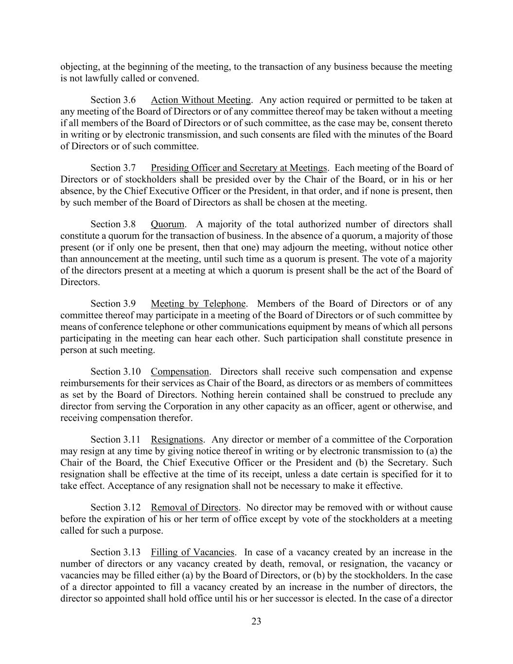 23 objecting, at the beginning of the meeting, to the transaction of any business because the meeting is not lawfully called or convened. Section 3.6 Action Without Meeting. Any action required or permitted to be taken at any meeting of the Board of Directors or of any committee thereof may be taken without a meeting if all members of the Board of Directors or of such committee, as the case may be, consent thereto in writing or by electronic transmission, and such consents are filed with the minutes of the Board of Directors or of such committee. Section 3.7 Presiding Officer and Secretary at Meetings. Each meeting of the Board of Directors or of stockholders shall be presided over by the Chair of the Board, or in his or her absence, by the Chief Executive Officer or the President, in that order, and if none is present, then by such member of the Board of Directors as shall be chosen at the meeting. Section 3.8 Quorum. A majority of the total authorized number of directors shall constitute a quorum for the transaction of business. In the absence of a quorum, a majority of those present (or if only one be present, then that one) may adjourn the meeting, without notice other than announcement at the meeting, until such time as a quorum is present. The vote of a majority of the directors present at a meeting at which a quorum is present shall be the act of the Board of Directors. Section 3.9 Meeting by Telephone. Members of the Board of Directors or of any committee thereof may participate in a meeting of the Board of Directors or of such committee by means of conference telephone or other communications equipment by means of which all persons participating in the meeting can hear each other. Such participation shall constitute presence in person at such meeting. Section 3.10 Compensation. Directors shall receive such compensation and expense reimbursements for their services as Chair of the Board, as directors or as members of committees as set by the Board of Directors. Nothing herein contained shall be construed to preclude any director from serving the Corporation in any other capacity as an officer, agent or otherwise, and receiving compensation therefor. Section 3.11 Resignations. Any director or member of a committee of the Corporation may resign at any time by giving notice thereof in writing or by electronic transmission to (a) the Chair of the Board, the Chief Executive Officer or the President and (b) the Secretary. Such resignation shall be effective at the time of its receipt, unless a date certain is specified for it to take effect. Acceptance of any resignation shall not be necessary to make it effective. Section 3.12 Removal of Directors. No director may be removed with or without cause before the expiration of his or her term of office except by vote of the stockholders at a meeting called for such a purpose. Section 3.13 Filling of Vacancies. In case of a vacancy created by an increase in the number of directors or any vacancy created by death, removal, or resignation, the vacancy or vacancies may be filled either (a) by the Board of Directors, or (b) by the stockholders. In the case of a director appointed to fill a vacancy created by an increase in the number of directors, the director so appointed shall hold office until his or her successor is elected. In the case of a director