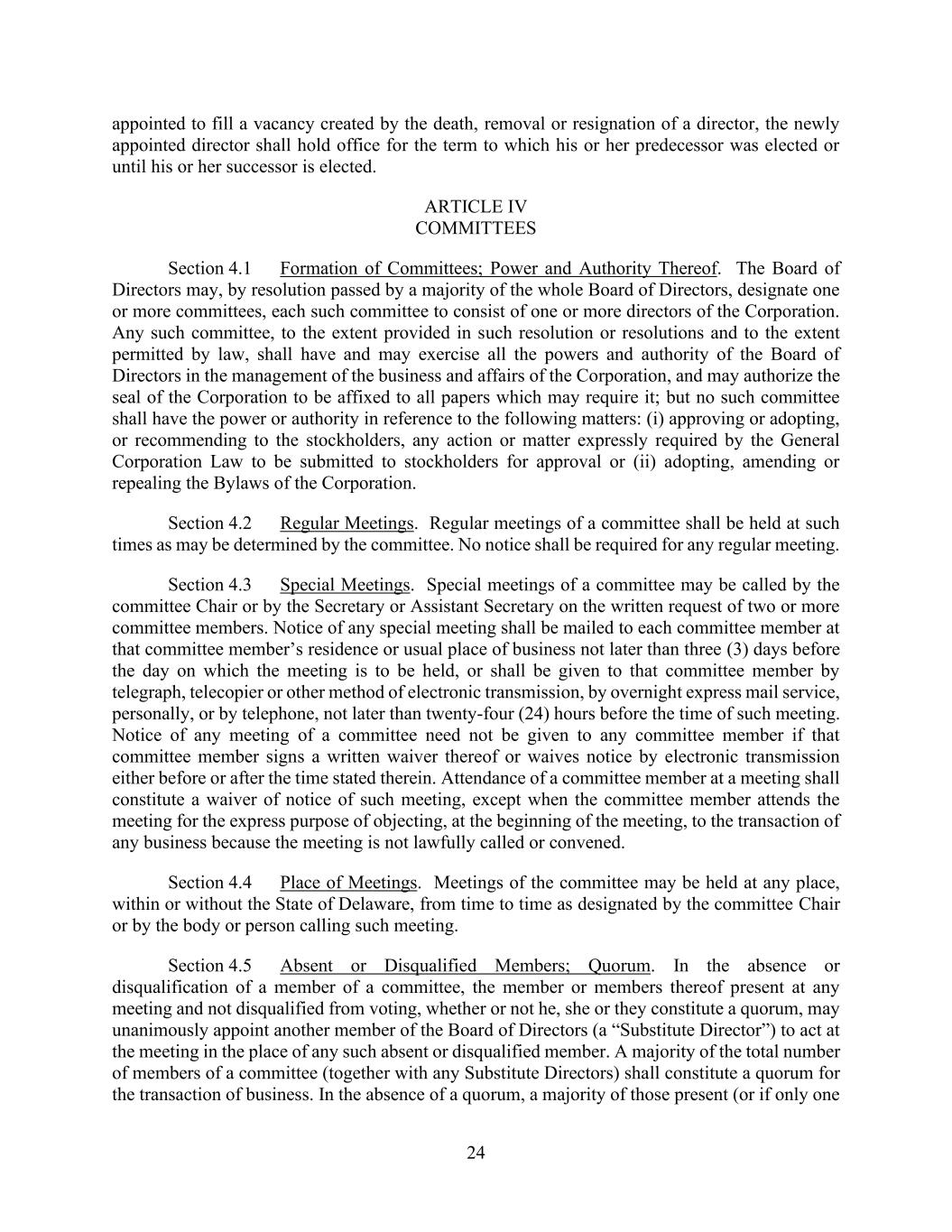 24 appointed to fill a vacancy created by the death, removal or resignation of a director, the newly appointed director shall hold office for the term to which his or her predecessor was elected or until his or her successor is elected. ARTICLE IV COMMITTEES Section 4.1 Formation of Committees; Power and Authority Thereof. The Board of Directors may, by resolution passed by a majority of the whole Board of Directors, designate one or more committees, each such committee to consist of one or more directors of the Corporation. Any such committee, to the extent provided in such resolution or resolutions and to the extent permitted by law, shall have and may exercise all the powers and authority of the Board of Directors in the management of the business and affairs of the Corporation, and may authorize the seal of the Corporation to be affixed to all papers which may require it; but no such committee shall have the power or authority in reference to the following matters: (i) approving or adopting, or recommending to the stockholders, any action or matter expressly required by the General Corporation Law to be submitted to stockholders for approval or (ii) adopting, amending or repealing the Bylaws of the Corporation. Section 4.2 Regular Meetings. Regular meetings of a committee shall be held at such times as may be determined by the committee. No notice shall be required for any regular meeting. Section 4.3 Special Meetings. Special meetings of a committee may be called by the committee Chair or by the Secretary or Assistant Secretary on the written request of two or more committee members. Notice of any special meeting shall be mailed to each committee member at that committee member’s residence or usual place of business not later than three (3) days before the day on which the meeting is to be held, or shall be given to that committee member by telegraph, telecopier or other method of electronic transmission, by overnight express mail service, personally, or by telephone, not later than twenty-four (24) hours before the time of such meeting. Notice of any meeting of a committee need not be given to any committee member if that committee member signs a written waiver thereof or waives notice by electronic transmission either before or after the time stated therein. Attendance of a committee member at a meeting shall constitute a waiver of notice of such meeting, except when the committee member attends the meeting for the express purpose of objecting, at the beginning of the meeting, to the transaction of any business because the meeting is not lawfully called or convened. Section 4.4 Place of Meetings. Meetings of the committee may be held at any place, within or without the State of Delaware, from time to time as designated by the committee Chair or by the body or person calling such meeting. Section 4.5 Absent or Disqualified Members; Quorum. In the absence or disqualification of a member of a committee, the member or members thereof present at any meeting and not disqualified from voting, whether or not he, she or they constitute a quorum, may unanimously appoint another member of the Board of Directors (a “Substitute Director”) to act at the meeting in the place of any such absent or disqualified member. A majority of the total number of members of a committee (together with any Substitute Directors) shall constitute a quorum for the transaction of business. In the absence of a quorum, a majority of those present (or if only one