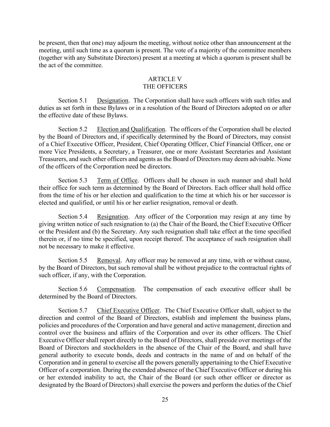 25 be present, then that one) may adjourn the meeting, without notice other than announcement at the meeting, until such time as a quorum is present. The vote of a majority of the committee members (together with any Substitute Directors) present at a meeting at which a quorum is present shall be the act of the committee. ARTICLE V THE OFFICERS Section 5.1 Designation. The Corporation shall have such officers with such titles and duties as set forth in these Bylaws or in a resolution of the Board of Directors adopted on or after the effective date of these Bylaws. Section 5.2 Election and Qualification. The officers of the Corporation shall be elected by the Board of Directors and, if specifically determined by the Board of Directors, may consist of a Chief Executive Officer, President, Chief Operating Officer, Chief Financial Officer, one or more Vice Presidents, a Secretary, a Treasurer, one or more Assistant Secretaries and Assistant Treasurers, and such other officers and agents as the Board of Directors may deem advisable. None of the officers of the Corporation need be directors. Section 5.3 Term of Office. Officers shall be chosen in such manner and shall hold their office for such term as determined by the Board of Directors. Each officer shall hold office from the time of his or her election and qualification to the time at which his or her successor is elected and qualified, or until his or her earlier resignation, removal or death. Section 5.4 Resignation. Any officer of the Corporation may resign at any time by giving written notice of such resignation to (a) the Chair of the Board, the Chief Executive Officer or the President and (b) the Secretary. Any such resignation shall take effect at the time specified therein or, if no time be specified, upon receipt thereof. The acceptance of such resignation shall not be necessary to make it effective. Section 5.5 Removal. Any officer may be removed at any time, with or without cause, by the Board of Directors, but such removal shall be without prejudice to the contractual rights of such officer, if any, with the Corporation. Section 5.6 Compensation. The compensation of each executive officer shall be determined by the Board of Directors. Section 5.7 Chief Executive Officer. The Chief Executive Officer shall, subject to the direction and control of the Board of Directors, establish and implement the business plans, policies and procedures of the Corporation and have general and active management, direction and control over the business and affairs of the Corporation and over its other officers. The Chief Executive Officer shall report directly to the Board of Directors, shall preside over meetings of the Board of Directors and stockholders in the absence of the Chair of the Board, and shall have general authority to execute bonds, deeds and contracts in the name of and on behalf of the Corporation and in general to exercise all the powers generally appertaining to the Chief Executive Officer of a corporation. During the extended absence of the Chief Executive Officer or during his or her extended inability to act, the Chair of the Board (or such other officer or director as designated by the Board of Directors) shall exercise the powers and perform the duties of the Chief