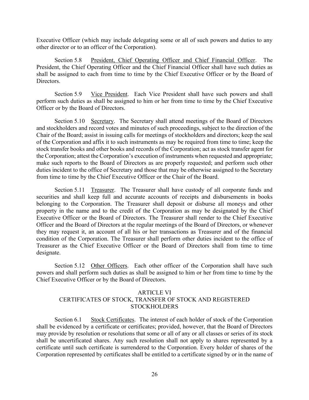 26 Executive Officer (which may include delegating some or all of such powers and duties to any other director or to an officer of the Corporation). Section 5.8 President, Chief Operating Officer and Chief Financial Officer. The President, the Chief Operating Officer and the Chief Financial Officer shall have such duties as shall be assigned to each from time to time by the Chief Executive Officer or by the Board of Directors. Section 5.9 Vice President. Each Vice President shall have such powers and shall perform such duties as shall be assigned to him or her from time to time by the Chief Executive Officer or by the Board of Directors. Section 5.10 Secretary. The Secretary shall attend meetings of the Board of Directors and stockholders and record votes and minutes of such proceedings, subject to the direction of the Chair of the Board; assist in issuing calls for meetings of stockholders and directors; keep the seal of the Corporation and affix it to such instruments as may be required from time to time; keep the stock transfer books and other books and records of the Corporation; act as stock transfer agent for the Corporation; attest the Corporation’s execution of instruments when requested and appropriate; make such reports to the Board of Directors as are properly requested; and perform such other duties incident to the office of Secretary and those that may be otherwise assigned to the Secretary from time to time by the Chief Executive Officer or the Chair of the Board. Section 5.11 Treasurer. The Treasurer shall have custody of all corporate funds and securities and shall keep full and accurate accounts of receipts and disbursements in books belonging to the Corporation. The Treasurer shall deposit or disburse all moneys and other property in the name and to the credit of the Corporation as may be designated by the Chief Executive Officer or the Board of Directors. The Treasurer shall render to the Chief Executive Officer and the Board of Directors at the regular meetings of the Board of Directors, or whenever they may request it, an account of all his or her transactions as Treasurer and of the financial condition of the Corporation. The Treasurer shall perform other duties incident to the office of Treasurer as the Chief Executive Officer or the Board of Directors shall from time to time designate. Section 5.12 Other Officers. Each other officer of the Corporation shall have such powers and shall perform such duties as shall be assigned to him or her from time to time by the Chief Executive Officer or by the Board of Directors. ARTICLE VI CERTIFICATES OF STOCK, TRANSFER OF STOCK AND REGISTERED STOCKHOLDERS Section 6.1 Stock Certificates. The interest of each holder of stock of the Corporation shall be evidenced by a certificate or certificates; provided, however, that the Board of Directors may provide by resolution or resolutions that some or all of any or all classes or series of its stock shall be uncertificated shares. Any such resolution shall not apply to shares represented by a certificate until such certificate is surrendered to the Corporation. Every holder of shares of the Corporation represented by certificates shall be entitled to a certificate signed by or in the name of