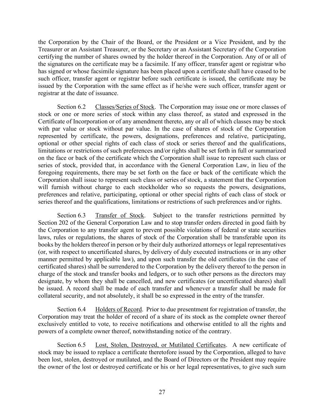 27 the Corporation by the Chair of the Board, or the President or a Vice President, and by the Treasurer or an Assistant Treasurer, or the Secretary or an Assistant Secretary of the Corporation certifying the number of shares owned by the holder thereof in the Corporation. Any of or all of the signatures on the certificate may be a facsimile. If any officer, transfer agent or registrar who has signed or whose facsimile signature has been placed upon a certificate shall have ceased to be such officer, transfer agent or registrar before such certificate is issued, the certificate may be issued by the Corporation with the same effect as if he/she were such officer, transfer agent or registrar at the date of issuance. Section 6.2 Classes/Series of Stock. The Corporation may issue one or more classes of stock or one or more series of stock within any class thereof, as stated and expressed in the Certificate of Incorporation or of any amendment thereto, any or all of which classes may be stock with par value or stock without par value. In the case of shares of stock of the Corporation represented by certificate, the powers, designations, preferences and relative, participating, optional or other special rights of each class of stock or series thereof and the qualifications, limitations or restrictions of such preferences and/or rights shall be set forth in full or summarized on the face or back of the certificate which the Corporation shall issue to represent such class or series of stock, provided that, in accordance with the General Corporation Law, in lieu of the foregoing requirements, there may be set forth on the face or back of the certificate which the Corporation shall issue to represent such class or series of stock, a statement that the Corporation will furnish without charge to each stockholder who so requests the powers, designations, preferences and relative, participating, optional or other special rights of each class of stock or series thereof and the qualifications, limitations or restrictions of such preferences and/or rights. Section 6.3 Transfer of Stock. Subject to the transfer restrictions permitted by Section 202 of the General Corporation Law and to stop transfer orders directed in good faith by the Corporation to any transfer agent to prevent possible violations of federal or state securities laws, rules or regulations, the shares of stock of the Corporation shall be transferable upon its books by the holders thereof in person or by their duly authorized attorneys or legal representatives (or, with respect to uncertificated shares, by delivery of duly executed instructions or in any other manner permitted by applicable law), and upon such transfer the old certificates (in the case of certificated shares) shall be surrendered to the Corporation by the delivery thereof to the person in charge of the stock and transfer books and ledgers, or to such other persons as the directors may designate, by whom they shall be cancelled, and new certificates (or uncertificated shares) shall be issued. A record shall be made of each transfer and whenever a transfer shall be made for collateral security, and not absolutely, it shall be so expressed in the entry of the transfer. Section 6.4 Holders of Record. Prior to due presentment for registration of transfer, the Corporation may treat the holder of record of a share of its stock as the complete owner thereof exclusively entitled to vote, to receive notifications and otherwise entitled to all the rights and powers of a complete owner thereof, notwithstanding notice of the contrary. Section 6.5 Lost, Stolen, Destroyed, or Mutilated Certificates. A new certificate of stock may be issued to replace a certificate theretofore issued by the Corporation, alleged to have been lost, stolen, destroyed or mutilated, and the Board of Directors or the President may require the owner of the lost or destroyed certificate or his or her legal representatives, to give such sum