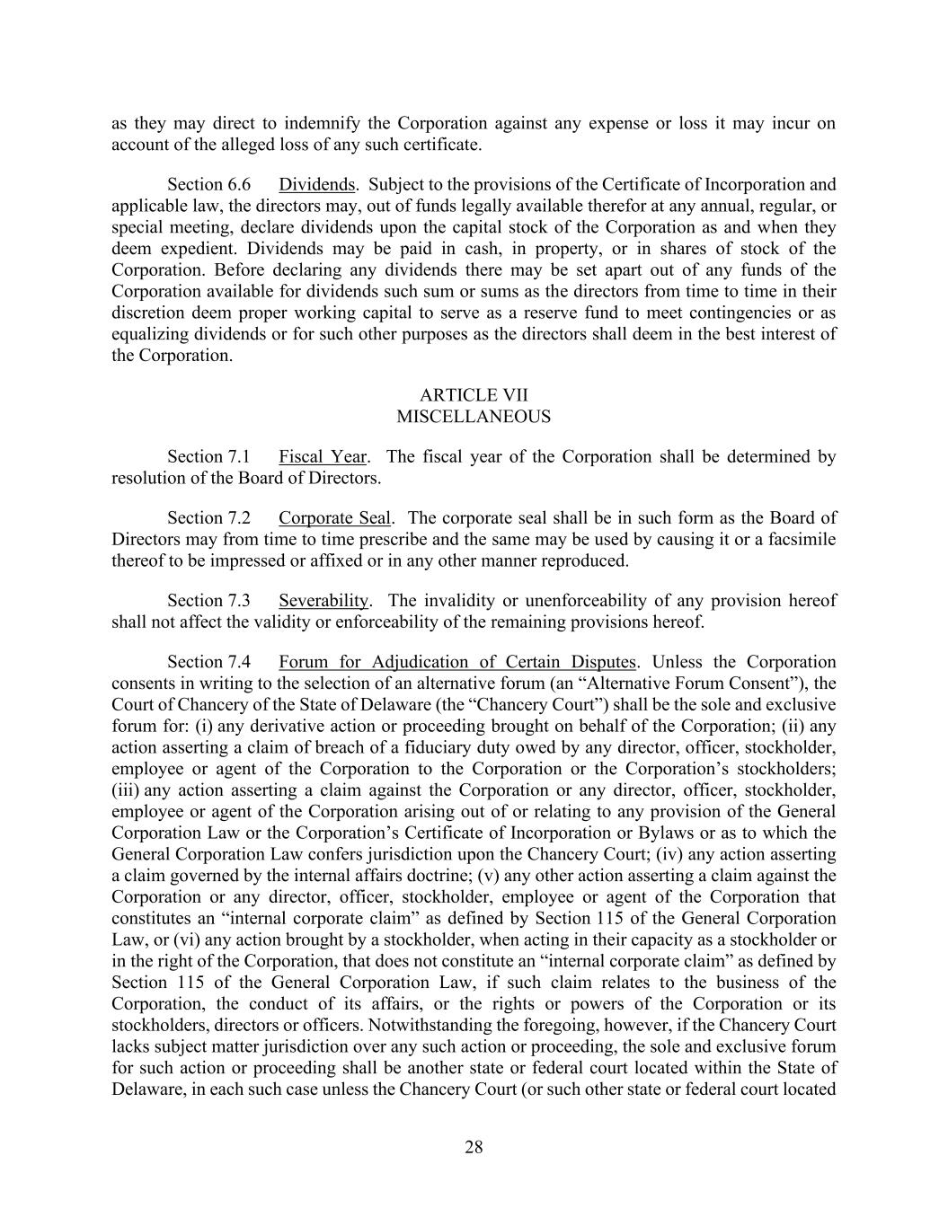 28 as they may direct to indemnify the Corporation against any expense or loss it may incur on account of the alleged loss of any such certificate. Section 6.6 Dividends. Subject to the provisions of the Certificate of Incorporation and applicable law, the directors may, out of funds legally available therefor at any annual, regular, or special meeting, declare dividends upon the capital stock of the Corporation as and when they deem expedient. Dividends may be paid in cash, in property, or in shares of stock of the Corporation. Before declaring any dividends there may be set apart out of any funds of the Corporation available for dividends such sum or sums as the directors from time to time in their discretion deem proper working capital to serve as a reserve fund to meet contingencies or as equalizing dividends or for such other purposes as the directors shall deem in the best interest of the Corporation. ARTICLE VII MISCELLANEOUS Section 7.1 Fiscal Year. The fiscal year of the Corporation shall be determined by resolution of the Board of Directors. Section 7.2 Corporate Seal. The corporate seal shall be in such form as the Board of Directors may from time to time prescribe and the same may be used by causing it or a facsimile thereof to be impressed or affixed or in any other manner reproduced. Section 7.3 Severability. The invalidity or unenforceability of any provision hereof shall not affect the validity or enforceability of the remaining provisions hereof. Section 7.4 Forum for Adjudication of Certain Disputes. Unless the Corporation consents in writing to the selection of an alternative forum (an “Alternative Forum Consent”), the Court of Chancery of the State of Delaware (the “Chancery Court”) shall be the sole and exclusive forum for: (i) any derivative action or proceeding brought on behalf of the Corporation; (ii) any action asserting a claim of breach of a fiduciary duty owed by any director, officer, stockholder, employee or agent of the Corporation to the Corporation or the Corporation’s stockholders; (iii) any action asserting a claim against the Corporation or any director, officer, stockholder, employee or agent of the Corporation arising out of or relating to any provision of the General Corporation Law or the Corporation’s Certificate of Incorporation or Bylaws or as to which the General Corporation Law confers jurisdiction upon the Chancery Court; (iv) any action asserting a claim governed by the internal affairs doctrine; (v) any other action asserting a claim against the Corporation or any director, officer, stockholder, employee or agent of the Corporation that constitutes an “internal corporate claim” as defined by Section 115 of the General Corporation Law, or (vi) any action brought by a stockholder, when acting in their capacity as a stockholder or in the right of the Corporation, that does not constitute an “internal corporate claim” as defined by Section 115 of the General Corporation Law, if such claim relates to the business of the Corporation, the conduct of its affairs, or the rights or powers of the Corporation or its stockholders, directors or officers. Notwithstanding the foregoing, however, if the Chancery Court lacks subject matter jurisdiction over any such action or proceeding, the sole and exclusive forum for such action or proceeding shall be another state or federal court located within the State of Delaware, in each such case unless the Chancery Court (or such other state or federal court located
