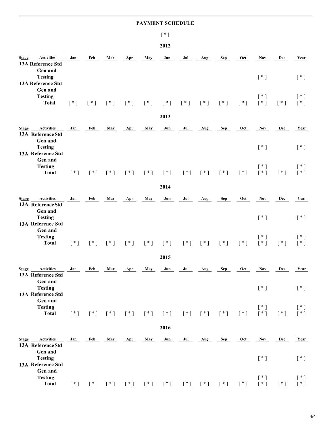 4/4       PAYMENT SCHEDULE    [ * ]  2012  S tage Activities Jan Feb Mar Apr May Jun Jul Aug Sep Oct Nov Dec Year                 13A Reference Std  Gen and  Testing [ * ] [ * ]  13A Reference Std  Gen and  Testing [ * ] [ * ]  Total [ * ] [ * ] [ * ] [ * ] [ * ] [ * ] [ * ] [ * ] [ * ] [ * ] [ * ] [ * ] [ * ]    2013    S tage  13A      13A                    2014    S tage  13A      13A                    2015    S tage  13A      13A                    2016    S tage  13A      13A          Activities  Jan  Feb  Mar  Apr  May  Jun  Jul  Aug  Sep  Oct  Nov  Dec  Year  Reference Std  Gen and  Testing                          [ * ]         [ * ]  Reference Std                            Gen and                            Testing                      [ * ]    [ * ]  Total  [ * ]  [ * ]  [ * ]  [ * ]  [ * ]  [ * ]  [ * ]  [ * ]  [ * ]  [ * ]  [ * ]  [ * ]  [ * ]    Activities  Jan  Feb  Mar  Apr  May  Jun  Jul  Aug  Sep  Oct  Nov  Dec  Year  Reference Std  Gen and  Testing                          [ * ]         [ * ]  Reference Std                            Gen and                            Testing                      [ * ]    [ * ]  Total  [ * ]  [ * ]  [ * ]  [ * ]  [ * ]  [ * ]  [ * ]  [ * ]  [ * ]  [ * ]  [ * ]  [ * ]  [ * ]    Activities  Jan  Feb  Mar  Apr  May  Jun  Jul  Aug  Sep  Oct  Nov  Dec  Year  Reference Std  Gen and  Testing                          [ * ]         [ * ]  Reference Std                            Gen and                            Testing                      [ * ]    [ * ]  Total  [ * ]  [ * ]  [ * ]  [ * ]  [ * ]  [ * ]  [ * ]  [ * ]  [ * ]  [ * ]  [ * ]  [ * ]  [ * ]    Activities  Jan  Feb  Mar  Apr  May  Jun  Jul  Aug  Sep  Oct  Nov  Dec  Year  Reference Std  Gen and  Testing                           [ * ]         [ * ]  Reference Std                            Gen and                            Testing                      [ * ]    [ * ]  Total  [ * ]  [ * ]  [ * ]  [ * ]  [ * ]  [ * ]  [ * ]  [ * ]  [ * ]  [ * ]  [ * ]  [ * ]  [ * ]