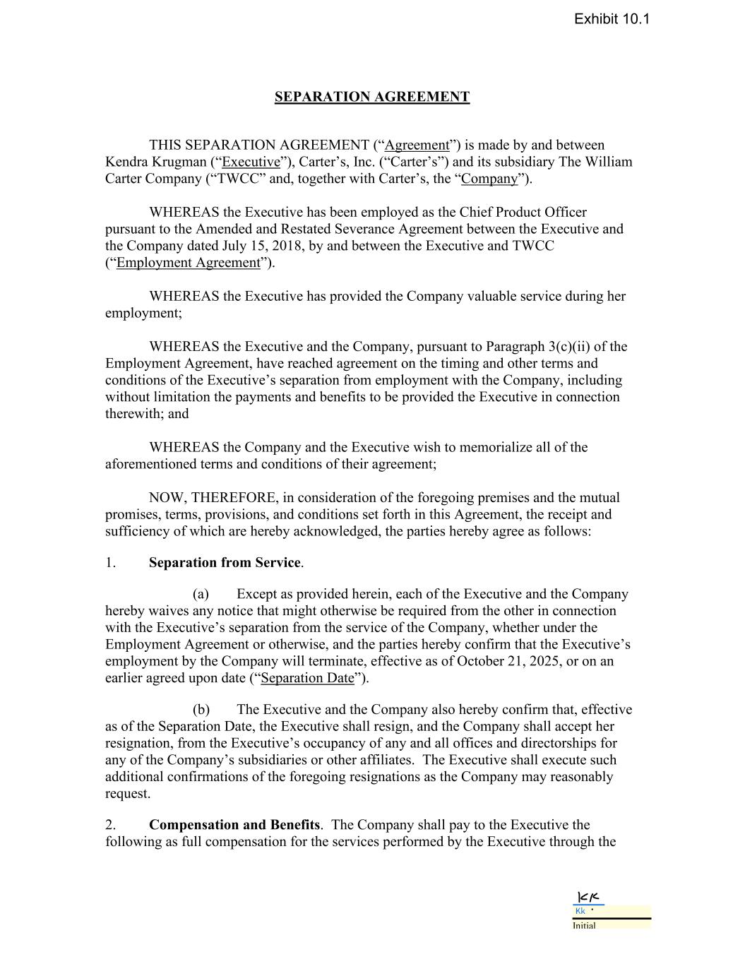 Initial SEPARATION AGREEMENT THIS SEPARATION AGREEMENT (“Agreement”) is made by and between Kendra Krugman (“Executive”), Carter’s, Inc. (“Carter’s”) and its subsidiary The William Carter Company (“TWCC” and, together with Carter’s, the “Company”). WHEREAS the Executive has been employed as the Chief Product Officer pursuant to the Amended and Restated Severance Agreement between the Executive and the Company dated July 15, 2018, by and between the Executive and TWCC (“Employment Agreement”). WHEREAS the Executive has provided the Company valuable service during her employment; WHEREAS the Executive and the Company, pursuant to Paragraph 3(c)(ii) of the Employment Agreement, have reached agreement on the timing and other terms and conditions of the Executive’s separation from employment with the Company, including without limitation the payments and benefits to be provided the Executive in connection therewith; and WHEREAS the Company and the Executive wish to memorialize all of the aforementioned terms and conditions of their agreement; NOW, THEREFORE, in consideration of the foregoing premises and the mutual promises, terms, provisions, and conditions set forth in this Agreement, the receipt and sufficiency of which are hereby acknowledged, the parties hereby agree as follows: 1. Separation from Service. (a) Except as provided herein, each of the Executive and the Company hereby waives any notice that might otherwise be required from the other in connection with the Executive’s separation from the service of the Company, whether under the Employment Agreement or otherwise, and the parties hereby confirm that the Executive’s employment by the Company will terminate, effective as of October 21, 2025, or on an earlier agreed upon date (“Separation Date”). (b) The Executive and the Company also hereby confirm that, effective as of the Separation Date, the Executive shall resign, and the Company shall accept her resignation, from the Executive’s occupancy of any and all offices and directorships for any of the Company’s subsidiaries or other affiliates. The Executive shall execute such additional confirmations of the foregoing resignations as the Company may reasonably request. 2. Compensation and Benefits. The Company shall pay to the Executive the following as full compensation for the services performed by the Executive through the Exhibit 10.1