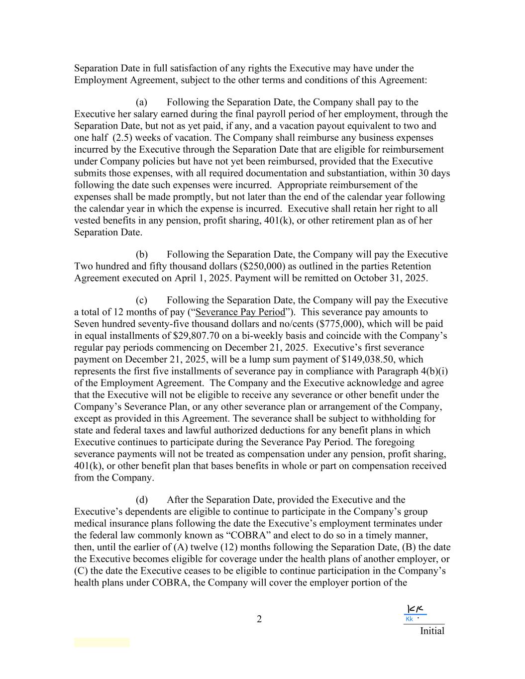 2 ________ Initial Separation Date in full satisfaction of any rights the Executive may have under the Employment Agreement, subject to the other terms and conditions of this Agreement: (a) Following the Separation Date, the Company shall pay to the Executive her salary earned during the final payroll period of her employment, through the Separation Date, but not as yet paid, if any, and a vacation payout equivalent to two and one half (2.5) weeks of vacation. The Company shall reimburse any business expenses incurred by the Executive through the Separation Date that are eligible for reimbursement under Company policies but have not yet been reimbursed, provided that the Executive submits those expenses, with all required documentation and substantiation, within 30 days following the date such expenses were incurred. Appropriate reimbursement of the expenses shall be made promptly, but not later than the end of the calendar year following the calendar year in which the expense is incurred. Executive shall retain her right to all vested benefits in any pension, profit sharing, 401(k), or other retirement plan as of her Separation Date. (b) Following the Separation Date, the Company will pay the Executive Two hundred and fifty thousand dollars ($250,000) as outlined in the parties Retention Agreement executed on April 1, 2025. Payment will be remitted on October 31, 2025. (c) Following the Separation Date, the Company will pay the Executive a total of 12 months of pay (“Severance Pay Period”). This severance pay amounts to Seven hundred seventy-five thousand dollars and no/cents ($775,000), which will be paid in equal installments of $29,807.70 on a bi-weekly basis and coincide with the Company’s regular pay periods commencing on December 21, 2025. Executive’s first severance payment on December 21, 2025, will be a lump sum payment of $149,038.50, which represents the first five installments of severance pay in compliance with Paragraph 4(b)(i) of the Employment Agreement. The Company and the Executive acknowledge and agree that the Executive will not be eligible to receive any severance or other benefit under the Company’s Severance Plan, or any other severance plan or arrangement of the Company, except as provided in this Agreement. The severance shall be subject to withholding for state and federal taxes and lawful authorized deductions for any benefit plans in which Executive continues to participate during the Severance Pay Period. The foregoing severance payments will not be treated as compensation under any pension, profit sharing, 401(k), or other benefit plan that bases benefits in whole or part on compensation received from the Company. (d) After the Separation Date, provided the Executive and the Executive’s dependents are eligible to continue to participate in the Company’s group medical insurance plans following the date the Executive’s employment terminates under the federal law commonly known as “COBRA” and elect to do so in a timely manner, then, until the earlier of (A) twelve (12) months following the Separation Date, (B) the date the Executive becomes eligible for coverage under the health plans of another employer, or (C) the date the Executive ceases to be eligible to continue participation in the Company’s health plans under COBRA, the Company will cover the employer portion of the