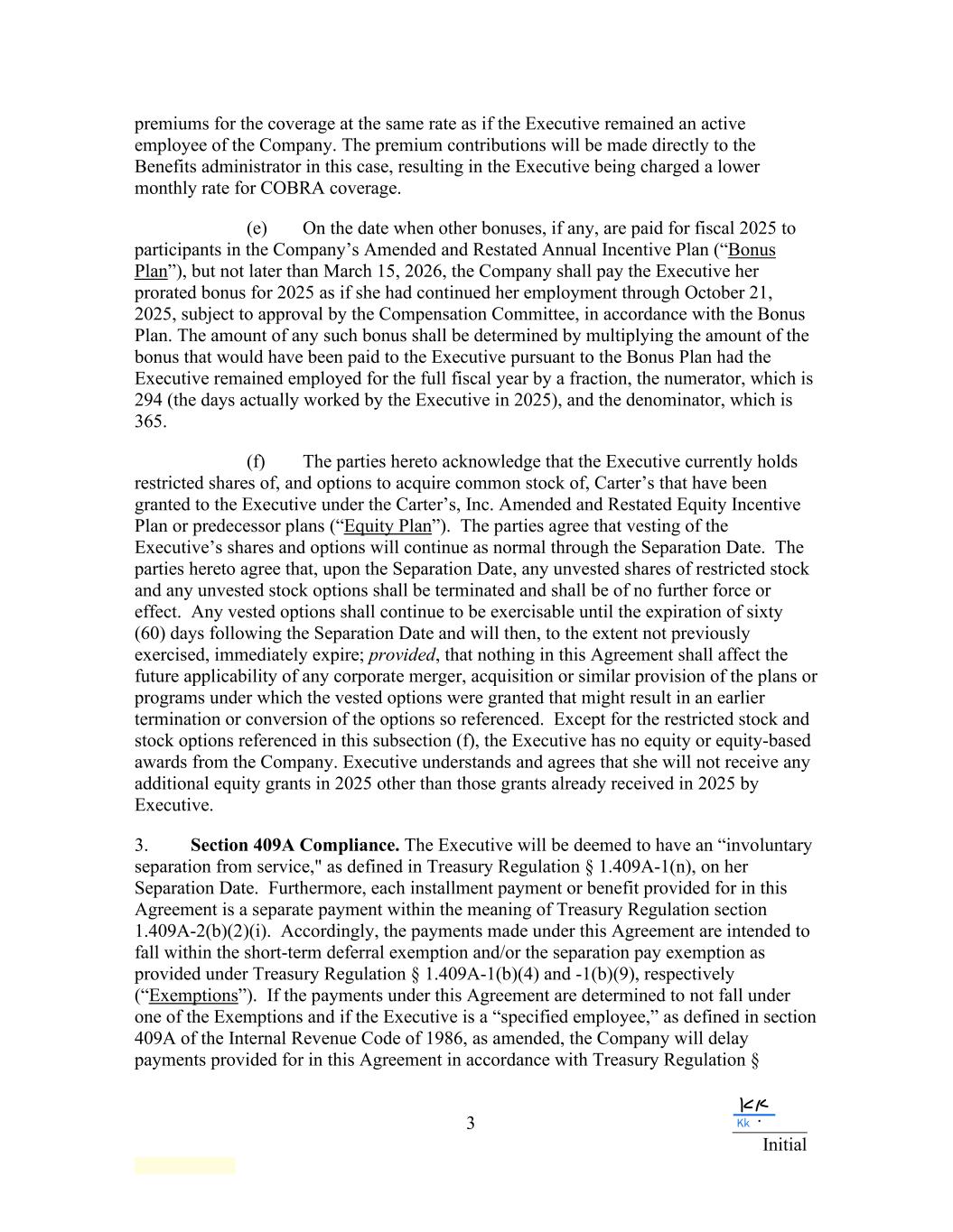 3 ________ Initial premiums for the coverage at the same rate as if the Executive remained an active employee of the Company. The premium contributions will be made directly to the Benefits administrator in this case, resulting in the Executive being charged a lower monthly rate for COBRA coverage. (e) On the date when other bonuses, if any, are paid for fiscal 2025 to participants in the Company’s Amended and Restated Annual Incentive Plan (“Bonus Plan”), but not later than March 15, 2026, the Company shall pay the Executive her prorated bonus for 2025 as if she had continued her employment through October 21, 2025, subject to approval by the Compensation Committee, in accordance with the Bonus Plan. The amount of any such bonus shall be determined by multiplying the amount of the bonus that would have been paid to the Executive pursuant to the Bonus Plan had the Executive remained employed for the full fiscal year by a fraction, the numerator, which is 294 (the days actually worked by the Executive in 2025), and the denominator, which is 365. (f) The parties hereto acknowledge that the Executive currently holds restricted shares of, and options to acquire common stock of, Carter’s that have been granted to the Executive under the Carter’s, Inc. Amended and Restated Equity Incentive Plan or predecessor plans (“Equity Plan”). The parties agree that vesting of the Executive’s shares and options will continue as normal through the Separation Date. The parties hereto agree that, upon the Separation Date, any unvested shares of restricted stock and any unvested stock options shall be terminated and shall be of no further force or effect. Any vested options shall continue to be exercisable until the expiration of sixty (60) days following the Separation Date and will then, to the extent not previously exercised, immediately expire; provided, that nothing in this Agreement shall affect the future applicability of any corporate merger, acquisition or similar provision of the plans or programs under which the vested options were granted that might result in an earlier termination or conversion of the options so referenced. Except for the restricted stock and stock options referenced in this subsection (f), the Executive has no equity or equity-based awards from the Company. Executive understands and agrees that she will not receive any additional equity grants in 2025 other than those grants already received in 2025 by Executive. 3. Section 409A Compliance. The Executive will be deemed to have an “involuntary separation from service," as defined in Treasury Regulation § 1.409A-1(n), on her Separation Date. Furthermore, each installment payment or benefit provided for in this Agreement is a separate payment within the meaning of Treasury Regulation section 1.409A-2(b)(2)(i). Accordingly, the payments made under this Agreement are intended to fall within the short-term deferral exemption and/or the separation pay exemption as provided under Treasury Regulation § 1.409A-1(b)(4) and -1(b)(9), respectively (“Exemptions”). If the payments under this Agreement are determined to not fall under one of the Exemptions and if the Executive is a “specified employee,” as defined in section 409A of the Internal Revenue Code of 1986, as amended, the Company will delay payments provided for in this Agreement in accordance with Treasury Regulation §