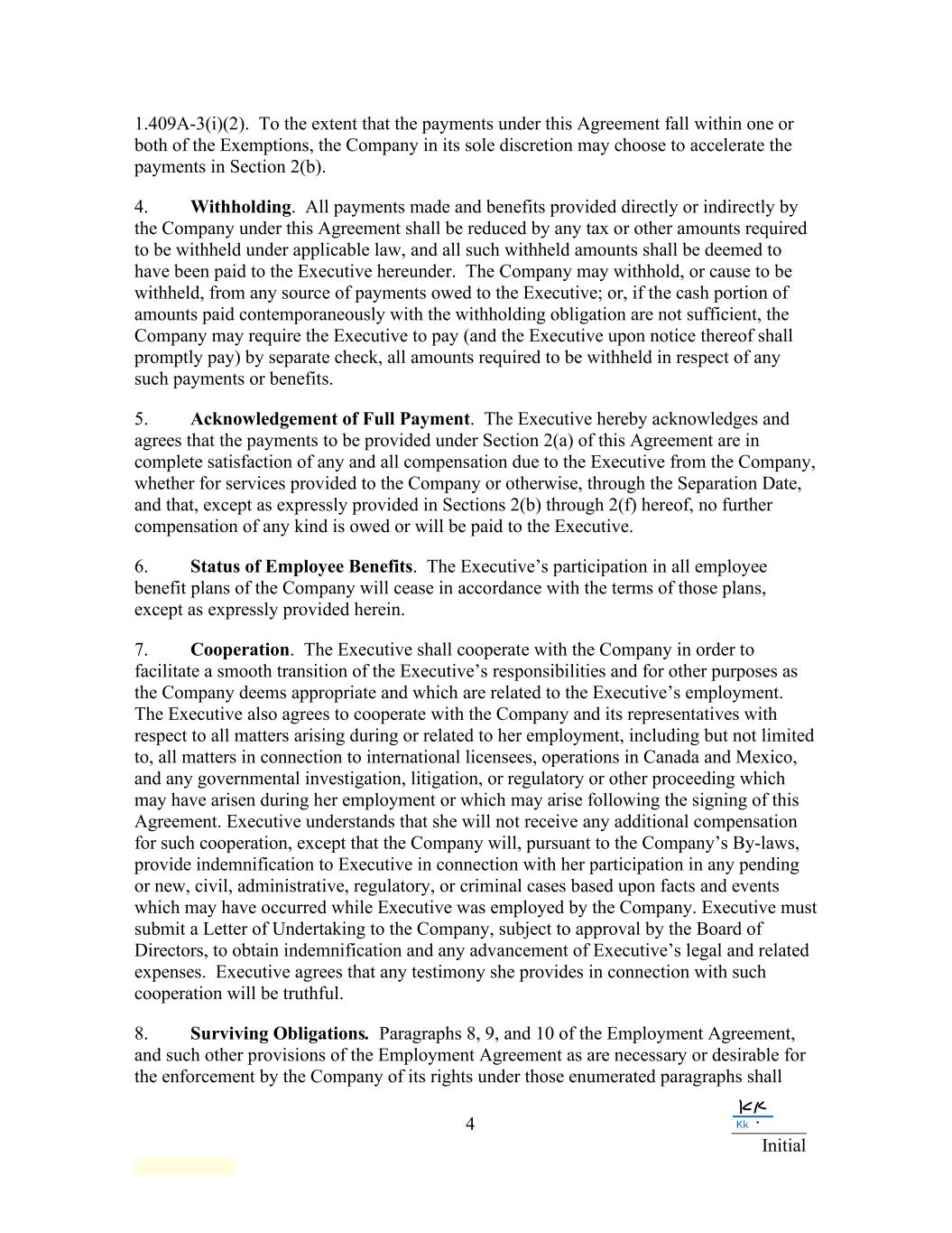 4 ________ Initial 1.409A-3(i)(2). To the extent that the payments under this Agreement fall within one or both of the Exemptions, the Company in its sole discretion may choose to accelerate the payments in Section 2(b). 4. Withholding. All payments made and benefits provided directly or indirectly by the Company under this Agreement shall be reduced by any tax or other amounts required to be withheld under applicable law, and all such withheld amounts shall be deemed to have been paid to the Executive hereunder. The Company may withhold, or cause to be withheld, from any source of payments owed to the Executive; or, if the cash portion of amounts paid contemporaneously with the withholding obligation are not sufficient, the Company may require the Executive to pay (and the Executive upon notice thereof shall promptly pay) by separate check, all amounts required to be withheld in respect of any such payments or benefits. 5. Acknowledgement of Full Payment. The Executive hereby acknowledges and agrees that the payments to be provided under Section 2(a) of this Agreement are in complete satisfaction of any and all compensation due to the Executive from the Company, whether for services provided to the Company or otherwise, through the Separation Date, and that, except as expressly provided in Sections 2(b) through 2(f) hereof, no further compensation of any kind is owed or will be paid to the Executive. 6. Status of Employee Benefits. The Executive’s participation in all employee benefit plans of the Company will cease in accordance with the terms of those plans, except as expressly provided herein. 7. Cooperation. The Executive shall cooperate with the Company in order to facilitate a smooth transition of the Executive’s responsibilities and for other purposes as the Company deems appropriate and which are related to the Executive’s employment. The Executive also agrees to cooperate with the Company and its representatives with respect to all matters arising during or related to her employment, including but not limited to, all matters in connection to international licensees, operations in Canada and Mexico, and any governmental investigation, litigation, or regulatory or other proceeding which may have arisen during her employment or which may arise following the signing of this Agreement. Executive understands that she will not receive any additional compensation for such cooperation, except that the Company will, pursuant to the Company’s By-laws, provide indemnification to Executive in connection with her participation in any pending or new, civil, administrative, regulatory, or criminal cases based upon facts and events which may have occurred while Executive was employed by the Company. Executive must submit a Letter of Undertaking to the Company, subject to approval by the Board of Directors, to obtain indemnification and any advancement of Executive’s legal and related expenses. Executive agrees that any testimony she provides in connection with such cooperation will be truthful. 8. Surviving Obligations. Paragraphs 8, 9, and 10 of the Employment Agreement, and such other provisions of the Employment Agreement as are necessary or desirable for the enforcement by the Company of its rights under those enumerated paragraphs shall