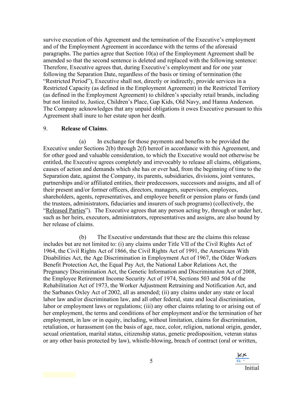 5 ________ Initial survive execution of this Agreement and the termination of the Executive’s employment and of the Employment Agreement in accordance with the terms of the aforesaid paragraphs. The parties agree that Section 10(a) of the Employment Agreement shall be amended so that the second sentence is deleted and replaced with the following sentence: Therefore, Executive agrees that, during Executive’s employment and for one year following the Separation Date, regardless of the basis or timing of termination (the “Restricted Period”), Executive shall not, directly or indirectly, provide services in a Restricted Capacity (as defined in the Employment Agreement) in the Restricted Territory (as defined in the Employment Agreement) to children’s specialty retail brands, including but not limited to, Justice, Children’s Place, Gap Kids, Old Navy, and Hanna Anderson. The Company acknowledges that any unpaid obligations it owes Executive pursuant to this Agreement shall inure to her estate upon her death. 9. Release of Claims. (a) In exchange for those payments and benefits to be provided the Executive under Sections 2(b) through 2(f) hereof in accordance with this Agreement, and for other good and valuable consideration, to which the Executive would not otherwise be entitled, the Executive agrees completely and irrevocably to release all claims, obligations, causes of action and demands which she has or ever had, from the beginning of time to the Separation date, against the Company, its parents, subsidiaries, divisions, joint ventures, partnerships and/or affiliated entities, their predecessors, successors and assigns, and all of their present and/or former officers, directors, managers, supervisors, employees, shareholders, agents, representatives, and employee benefit or pension plans or funds (and the trustees, administrators, fiduciaries and insurers of such programs) (collectively, the “Released Parties”). The Executive agrees that any person acting by, through or under her, such as her heirs, executors, administrators, representatives and assigns, are also bound by her release of claims. (b) The Executive understands that these are the claims this release includes but are not limited to: (i) any claims under Title VII of the Civil Rights Act of 1964, the Civil Rights Act of 1866, the Civil Rights Act of 1991, the Americans With Disabilities Act, the Age Discrimination in Employment Act of 1967, the Older Workers Benefit Protection Act, the Equal Pay Act, the National Labor Relations Act, the Pregnancy Discrimination Act, the Genetic Information and Discrimination Act of 2008, the Employee Retirement Income Security Act of 1974, Sections 503 and 504 of the Rehabilitation Act of 1973, the Worker Adjustment Retraining and Notification Act, and the Sarbanes Oxley Act of 2002, all as amended; (ii) any claims under any state or local labor law and/or discrimination law, and all other federal, state and local discrimination, labor or employment laws or regulations; (iii) any other claims relating to or arising out of her employment, the terms and conditions of her employment and/or the termination of her employment, in law or in equity, including, without limitation, claims for discrimination, retaliation, or harassment (on the basis of age, race, color, religion, national origin, gender, sexual orientation, marital status, citizenship status, genetic predisposition, veteran status or any other basis protected by law), whistle-blowing, breach of contract (oral or written,