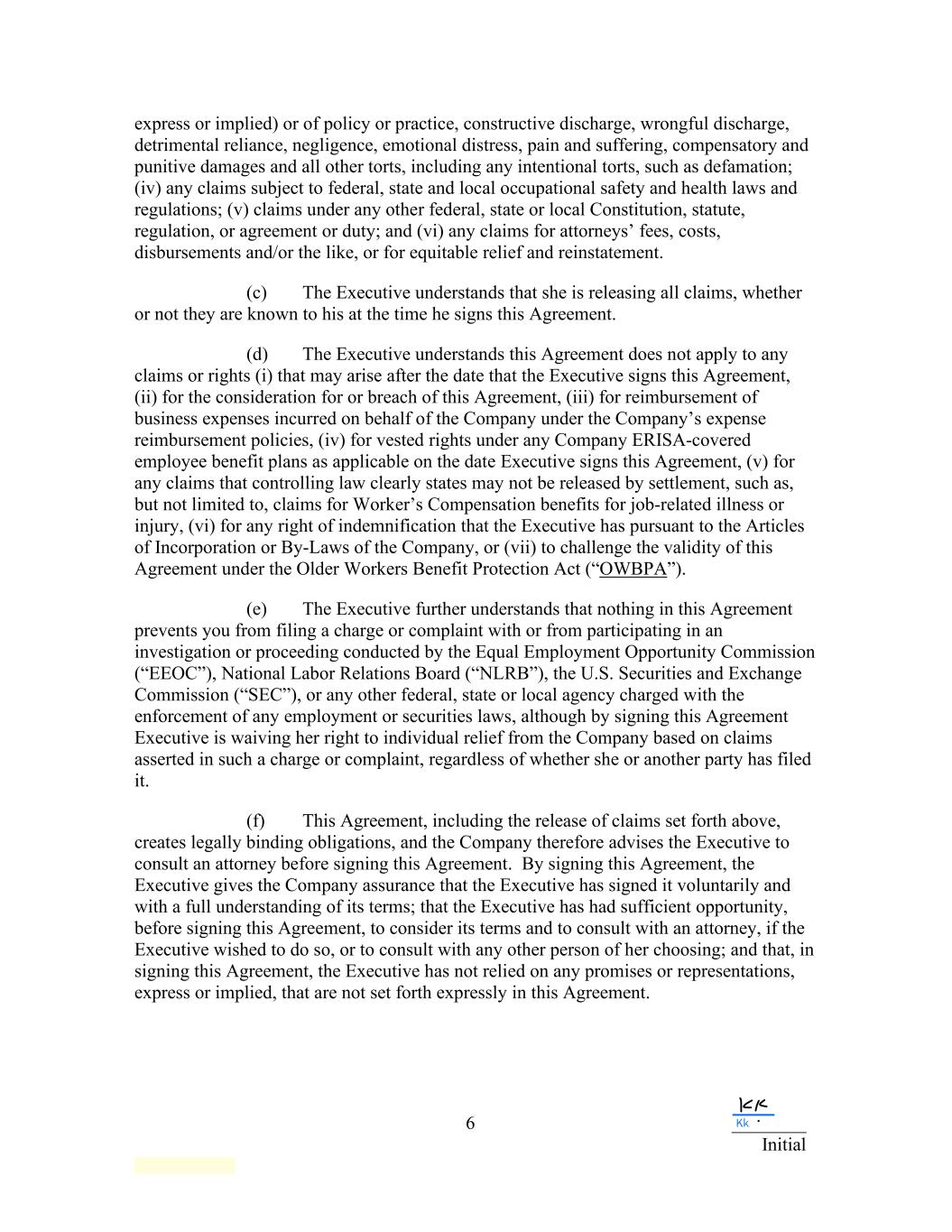 6 ________ Initial express or implied) or of policy or practice, constructive discharge, wrongful discharge, detrimental reliance, negligence, emotional distress, pain and suffering, compensatory and punitive damages and all other torts, including any intentional torts, such as defamation; (iv) any claims subject to federal, state and local occupational safety and health laws and regulations; (v) claims under any other federal, state or local Constitution, statute, regulation, or agreement or duty; and (vi) any claims for attorneys’ fees, costs, disbursements and/or the like, or for equitable relief and reinstatement. (c) The Executive understands that she is releasing all claims, whether or not they are known to his at the time he signs this Agreement. (d) The Executive understands this Agreement does not apply to any claims or rights (i) that may arise after the date that the Executive signs this Agreement, (ii) for the consideration for or breach of this Agreement, (iii) for reimbursement of business expenses incurred on behalf of the Company under the Company’s expense reimbursement policies, (iv) for vested rights under any Company ERISA-covered employee benefit plans as applicable on the date Executive signs this Agreement, (v) for any claims that controlling law clearly states may not be released by settlement, such as, but not limited to, claims for Worker’s Compensation benefits for job-related illness or injury, (vi) for any right of indemnification that the Executive has pursuant to the Articles of Incorporation or By-Laws of the Company, or (vii) to challenge the validity of this Agreement under the Older Workers Benefit Protection Act (“OWBPA”). (e) The Executive further understands that nothing in this Agreement prevents you from filing a charge or complaint with or from participating in an investigation or proceeding conducted by the Equal Employment Opportunity Commission (“EEOC”), National Labor Relations Board (“NLRB”), the U.S. Securities and Exchange Commission (“SEC”), or any other federal, state or local agency charged with the enforcement of any employment or securities laws, although by signing this Agreement Executive is waiving her right to individual relief from the Company based on claims asserted in such a charge or complaint, regardless of whether she or another party has filed it. (f) This Agreement, including the release of claims set forth above, creates legally binding obligations, and the Company therefore advises the Executive to consult an attorney before signing this Agreement. By signing this Agreement, the Executive gives the Company assurance that the Executive has signed it voluntarily and with a full understanding of its terms; that the Executive has had sufficient opportunity, before signing this Agreement, to consider its terms and to consult with an attorney, if the Executive wished to do so, or to consult with any other person of her choosing; and that, in signing this Agreement, the Executive has not relied on any promises or representations, express or implied, that are not set forth expressly in this Agreement.