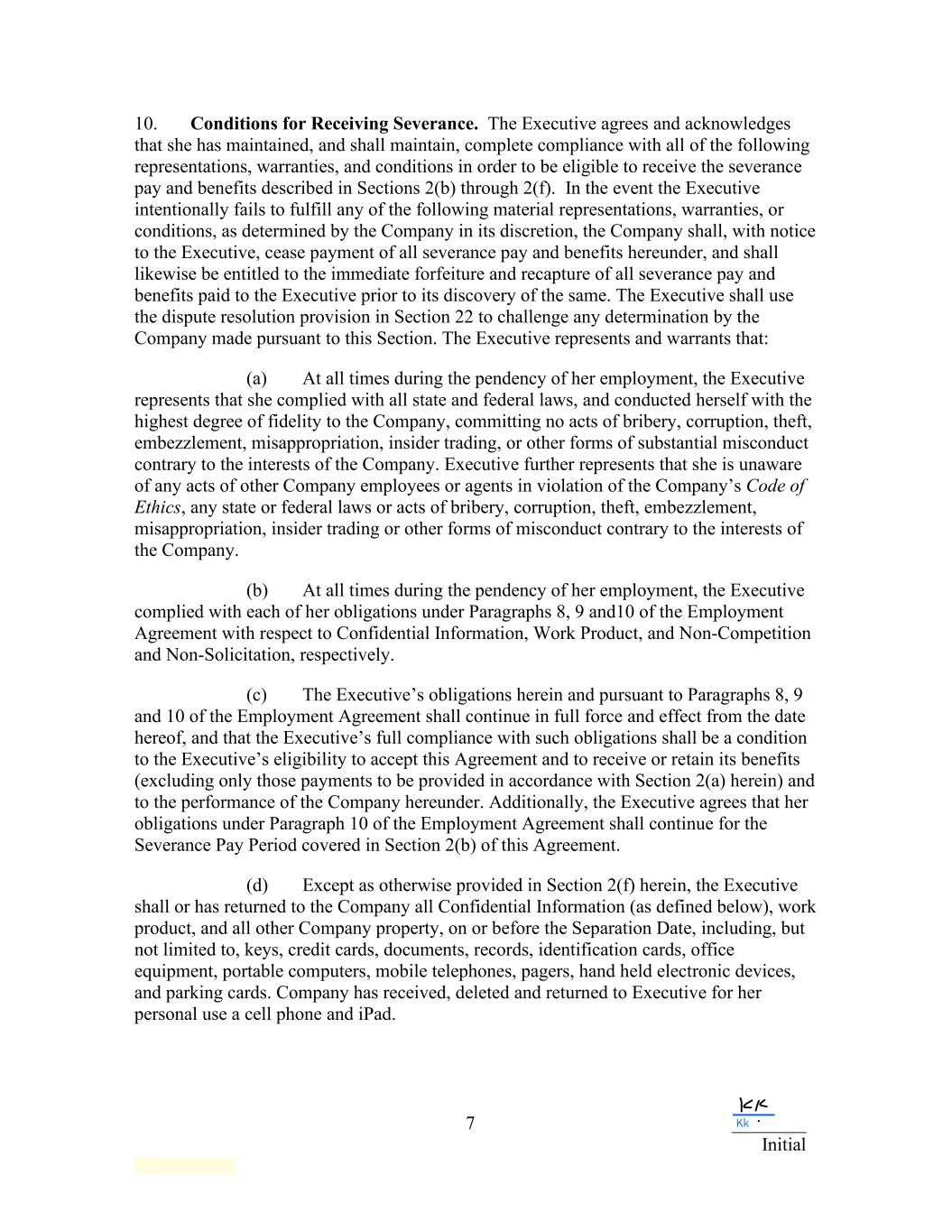 7 ________ Initial 10. Conditions for Receiving Severance. The Executive agrees and acknowledges that she has maintained, and shall maintain, complete compliance with all of the following representations, warranties, and conditions in order to be eligible to receive the severance pay and benefits described in Sections 2(b) through 2(f). In the event the Executive intentionally fails to fulfill any of the following material representations, warranties, or conditions, as determined by the Company in its discretion, the Company shall, with notice to the Executive, cease payment of all severance pay and benefits hereunder, and shall likewise be entitled to the immediate forfeiture and recapture of all severance pay and benefits paid to the Executive prior to its discovery of the same. The Executive shall use the dispute resolution provision in Section 22 to challenge any determination by the Company made pursuant to this Section. The Executive represents and warrants that: (a) At all times during the pendency of her employment, the Executive represents that she complied with all state and federal laws, and conducted herself with the highest degree of fidelity to the Company, committing no acts of bribery, corruption, theft, embezzlement, misappropriation, insider trading, or other forms of substantial misconduct contrary to the interests of the Company. Executive further represents that she is unaware of any acts of other Company employees or agents in violation of the Company’s Code of Ethics, any state or federal laws or acts of bribery, corruption, theft, embezzlement, misappropriation, insider trading or other forms of misconduct contrary to the interests of the Company. (b) At all times during the pendency of her employment, the Executive complied with each of her obligations under Paragraphs 8, 9 and10 of the Employment Agreement with respect to Confidential Information, Work Product, and Non-Competition and Non-Solicitation, respectively. (c) The Executive’s obligations herein and pursuant to Paragraphs 8, 9 and 10 of the Employment Agreement shall continue in full force and effect from the date hereof, and that the Executive’s full compliance with such obligations shall be a condition to the Executive’s eligibility to accept this Agreement and to receive or retain its benefits (excluding only those payments to be provided in accordance with Section 2(a) herein) and to the performance of the Company hereunder. Additionally, the Executive agrees that her obligations under Paragraph 10 of the Employment Agreement shall continue for the Severance Pay Period covered in Section 2(b) of this Agreement. (d) Except as otherwise provided in Section 2(f) herein, the Executive shall or has returned to the Company all Confidential Information (as defined below), work product, and all other Company property, on or before the Separation Date, including, but not limited to, keys, credit cards, documents, records, identification cards, office equipment, portable computers, mobile telephones, pagers, hand held electronic devices, and parking cards. Company has received, deleted and returned to Executive for her personal use a cell phone and iPad.