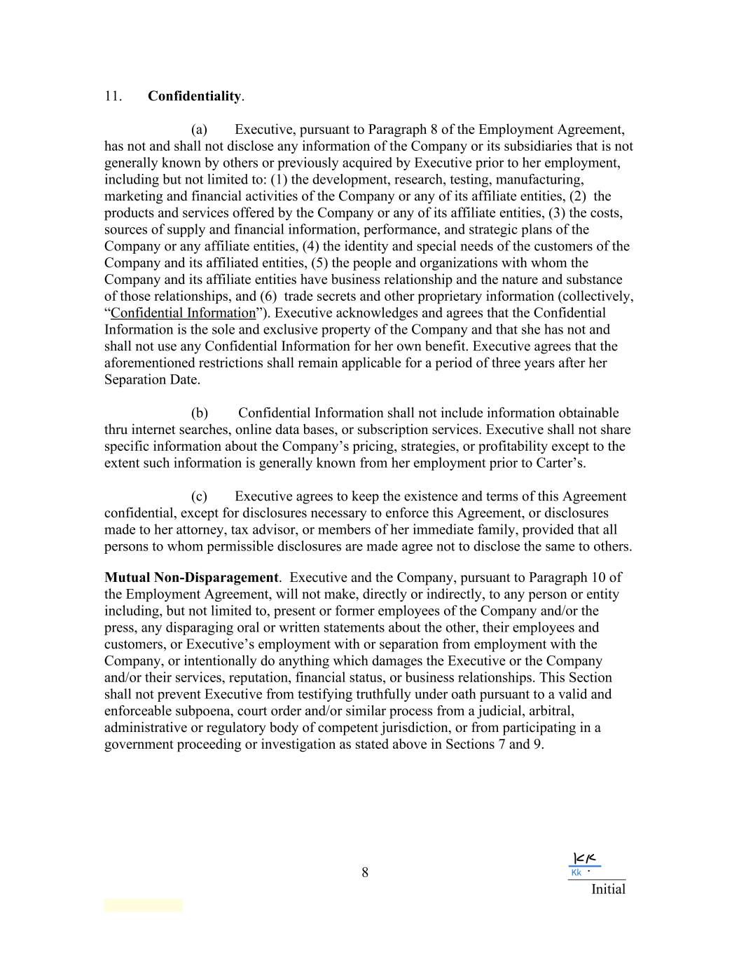 8 ________ Initial 11. Confidentiality. (a) Executive, pursuant to Paragraph 8 of the Employment Agreement, has not and shall not disclose any information of the Company or its subsidiaries that is not generally known by others or previously acquired by Executive prior to her employment, including but not limited to: (1) the development, research, testing, manufacturing, marketing and financial activities of the Company or any of its affiliate entities, (2) the products and services offered by the Company or any of its affiliate entities, (3) the costs, sources of supply and financial information, performance, and strategic plans of the Company or any affiliate entities, (4) the identity and special needs of the customers of the Company and its affiliated entities, (5) the people and organizations with whom the Company and its affiliate entities have business relationship and the nature and substance of those relationships, and (6) trade secrets and other proprietary information (collectively, “Confidential Information”). Executive acknowledges and agrees that the Confidential Information is the sole and exclusive property of the Company and that she has not and shall not use any Confidential Information for her own benefit. Executive agrees that the aforementioned restrictions shall remain applicable for a period of three years after her Separation Date. (b) Confidential Information shall not include information obtainable thru internet searches, online data bases, or subscription services. Executive shall not share specific information about the Company’s pricing, strategies, or profitability except to the extent such information is generally known from her employment prior to Carter’s. (c) Executive agrees to keep the existence and terms of this Agreement confidential, except for disclosures necessary to enforce this Agreement, or disclosures made to her attorney, tax advisor, or members of her immediate family, provided that all persons to whom permissible disclosures are made agree not to disclose the same to others. Mutual Non-Disparagement. Executive and the Company, pursuant to Paragraph 10 of the Employment Agreement, will not make, directly or indirectly, to any person or entity including, but not limited to, present or former employees of the Company and/or the press, any disparaging oral or written statements about the other, their employees and customers, or Executive’s employment with or separation from employment with the Company, or intentionally do anything which damages the Executive or the Company and/or their services, reputation, financial status, or business relationships. This Section shall not prevent Executive from testifying truthfully under oath pursuant to a valid and enforceable subpoena, court order and/or similar process from a judicial, arbitral, administrative or regulatory body of competent jurisdiction, or from participating in a government proceeding or investigation as stated above in Sections 7 and 9.