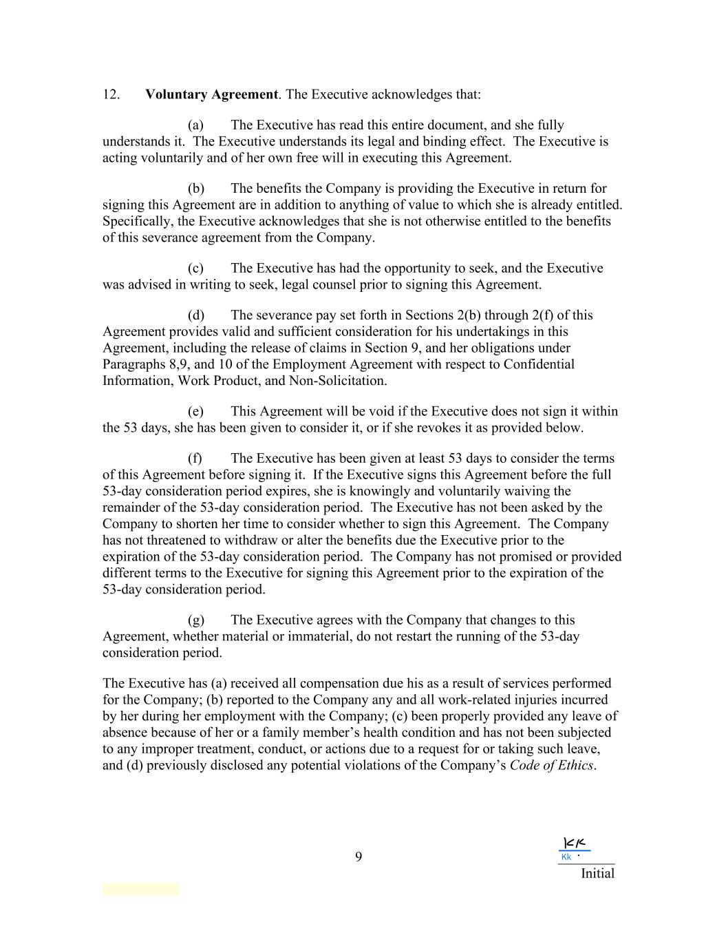 9 ________ Initial 12. Voluntary Agreement. The Executive acknowledges that: (a) The Executive has read this entire document, and she fully understands it. The Executive understands its legal and binding effect. The Executive is acting voluntarily and of her own free will in executing this Agreement. (b) The benefits the Company is providing the Executive in return for signing this Agreement are in addition to anything of value to which she is already entitled. Specifically, the Executive acknowledges that she is not otherwise entitled to the benefits of this severance agreement from the Company. (c) The Executive has had the opportunity to seek, and the Executive was advised in writing to seek, legal counsel prior to signing this Agreement. (d) The severance pay set forth in Sections 2(b) through 2(f) of this Agreement provides valid and sufficient consideration for his undertakings in this Agreement, including the release of claims in Section 9, and her obligations under Paragraphs 8,9, and 10 of the Employment Agreement with respect to Confidential Information, Work Product, and Non-Solicitation. (e) This Agreement will be void if the Executive does not sign it within the 53 days, she has been given to consider it, or if she revokes it as provided below. (f) The Executive has been given at least 53 days to consider the terms of this Agreement before signing it. If the Executive signs this Agreement before the full 53-day consideration period expires, she is knowingly and voluntarily waiving the remainder of the 53-day consideration period. The Executive has not been asked by the Company to shorten her time to consider whether to sign this Agreement. The Company has not threatened to withdraw or alter the benefits due the Executive prior to the expiration of the 53-day consideration period. The Company has not promised or provided different terms to the Executive for signing this Agreement prior to the expiration of the 53-day consideration period. (g) The Executive agrees with the Company that changes to this Agreement, whether material or immaterial, do not restart the running of the 53-day consideration period. The Executive has (a) received all compensation due his as a result of services performed for the Company; (b) reported to the Company any and all work-related injuries incurred by her during her employment with the Company; (c) been properly provided any leave of absence because of her or a family member’s health condition and has not been subjected to any improper treatment, conduct, or actions due to a request for or taking such leave, and (d) previously disclosed any potential violations of the Company’s Code of Ethics.