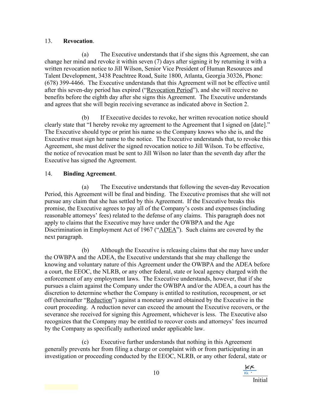 10 ________ Initial 13. Revocation. (a) The Executive understands that if she signs this Agreement, she can change her mind and revoke it within seven (7) days after signing it by returning it with a written revocation notice to Jill Wilson, Senior Vice President of Human Resources and Talent Development, 3438 Peachtree Road, Suite 1800, Atlanta, Georgia 30326, Phone: (678) 399-4466. The Executive understands that this Agreement will not be effective until after this seven-day period has expired (“Revocation Period”), and she will receive no benefits before the eighth day after she signs this Agreement. The Executive understands and agrees that she will begin receiving severance as indicated above in Section 2. (b) If Executive decides to revoke, her written revocation notice should clearly state that “I hereby revoke my agreement to the Agreement that I signed on [date].” The Executive should type or print his name so the Company knows who she is, and the Executive must sign her name to the notice. The Executive understands that, to revoke this Agreement, she must deliver the signed revocation notice to Jill Wilson. To be effective, the notice of revocation must be sent to Jill Wilson no later than the seventh day after the Executive has signed the Agreement. 14. Binding Agreement. (a) The Executive understands that following the seven-day Revocation Period, this Agreement will be final and binding. The Executive promises that she will not pursue any claim that she has settled by this Agreement. If the Executive breaks this promise, the Executive agrees to pay all of the Company’s costs and expenses (including reasonable attorneys’ fees) related to the defense of any claims. This paragraph does not apply to claims that the Executive may have under the OWBPA and the Age Discrimination in Employment Act of 1967 (“ADEA”). Such claims are covered by the next paragraph. (b) Although the Executive is releasing claims that she may have under the OWBPA and the ADEA, the Executive understands that she may challenge the knowing and voluntary nature of this Agreement under the OWBPA and the ADEA before a court, the EEOC, the NLRB, or any other federal, state or local agency charged with the enforcement of any employment laws. The Executive understands, however, that if she pursues a claim against the Company under the OWBPA and/or the ADEA, a court has the discretion to determine whether the Company is entitled to restitution, recoupment, or set off (hereinafter “Reduction”) against a monetary award obtained by the Executive in the court proceeding. A reduction never can exceed the amount the Executive recovers, or the severance she received for signing this Agreement, whichever is less. The Executive also recognizes that the Company may be entitled to recover costs and attorneys’ fees incurred by the Company as specifically authorized under applicable law. (c) Executive further understands that nothing in this Agreement generally prevents her from filing a charge or complaint with or from participating in an investigation or proceeding conducted by the EEOC, NLRB, or any other federal, state or