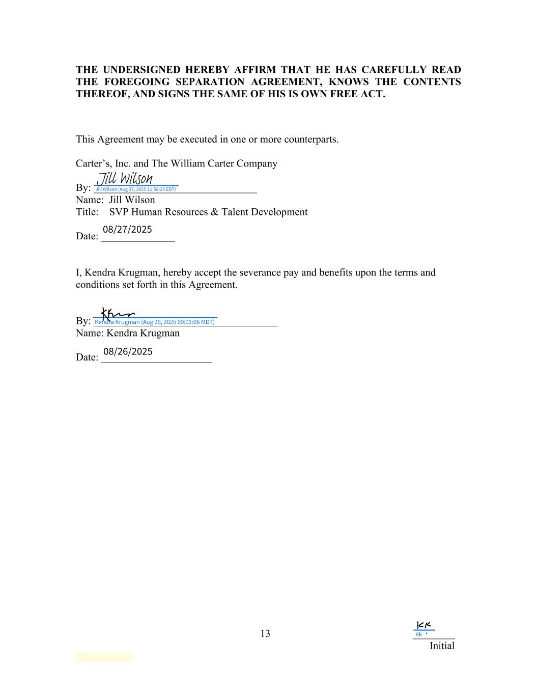 13 ________ Initial THE UNDERSIGNED HEREBY AFFIRM THAT HE HAS CAREFULLY READ THE FOREGOING SEPARATION AGREEMENT, KNOWS THE CONTENTS THEREOF, AND SIGNS THE SAME OF HIS IS OWN FREE ACT. This Agreement may be executed in one or more counterparts. Carter’s, Inc. and The William Carter Company By: _______________________________ Name: Jill Wilson Title: SVP Human Resources & Talent Development Date: ______________ I, Kendra Krugman, hereby accept the severance pay and benefits upon the terms and conditions set forth in this Agreement. By: ___________________________________ Name: Kendra Krugman Date: _____________________