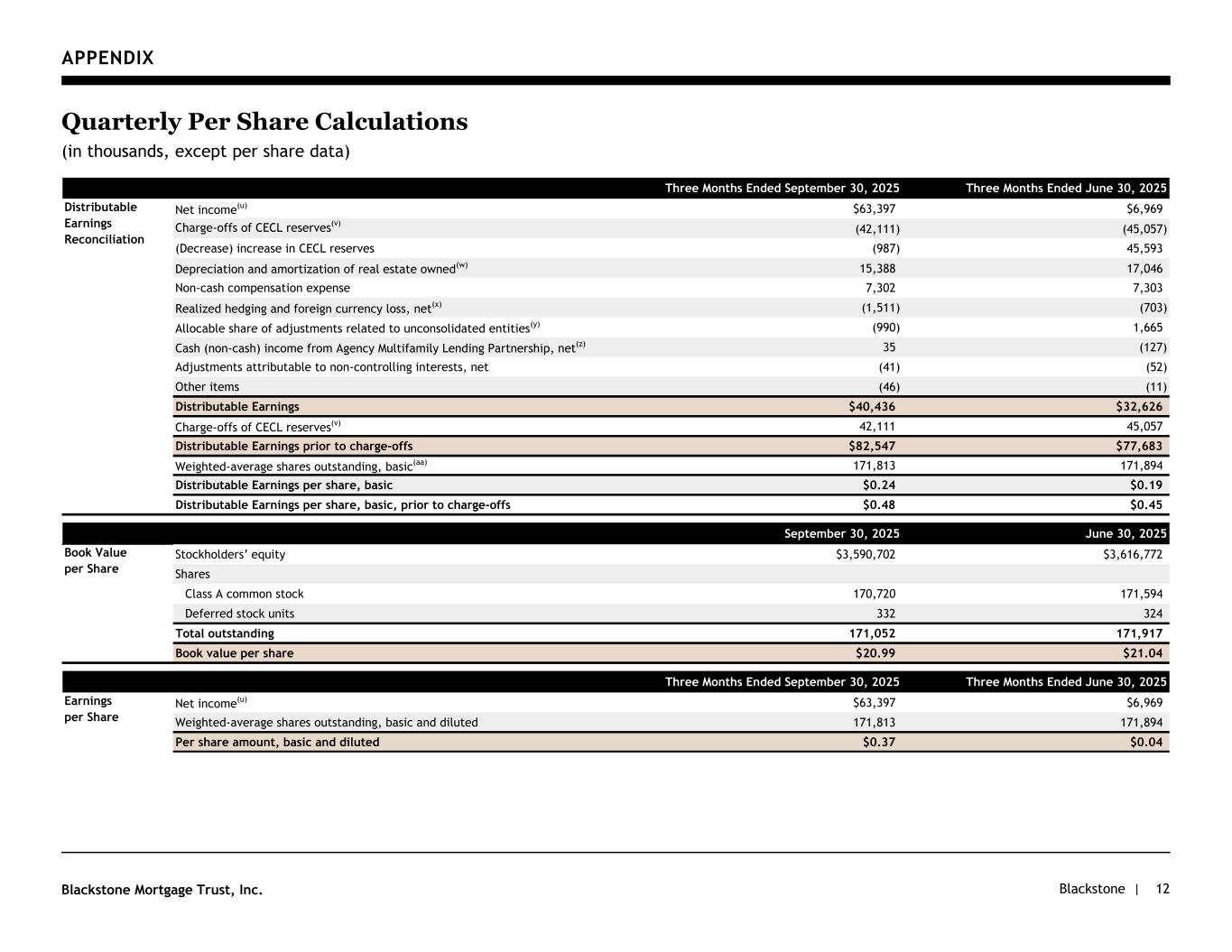 Blackstone |Blackstone Mortgage Trust, Inc. APPENDIX 12 Quarterly Per Share Calculations (in thousands, except per share data) Three Months Ended September 30, 2025 Three Months Ended June 30, 2025 Net income(u) $63,397 $6,969 Charge-offs of CECL reserves(v) (42,111) (45,057) (Decrease) increase in CECL reserves (987) 45,593 Depreciation and amortization of real estate owned(w) 15,388 17,046 Non-cash compensation expense 7,302 7,303 Realized hedging and foreign currency loss, net(x) (1,511) (703) Allocable share of adjustments related to unconsolidated entities(y) (990) 1,665 Cash (non-cash) income from Agency Multifamily Lending Partnership, net(z) 35 (127) Adjustments attributable to non-controlling interests, net (41) (52) Other items (46) (11) Distributable Earnings $40,436 $32,626 Charge-offs of CECL reserves(v) 42,111 45,057 Distributable Earnings prior to charge-offs $82,547 $77,683 Weighted-average shares outstanding, basic(aa) 171,813 171,894 Distributable Earnings per share, basic $0.24 $0.19 Distributable Earnings per share, basic, prior to charge-offs $0.48 $0.45 September 30, 2025 June 30, 2025 Stockholders’ equity $3,590,702 $3,616,772 Shares Class A common stock 170,720 171,594 Deferred stock units 332 324 Total outstanding 171,052 171,917 Book value per share $20.99 $21.04 Three Months Ended September 30, 2025 Three Months Ended June 30, 2025 Net income(u) $63,397 $6,969 Weighted-average shares outstanding, basic and diluted 171,813 171,894 Per share amount, basic and diluted $0.37 $0.04 Distributable Earnings Reconciliation Book Value per Share Earnings per Share