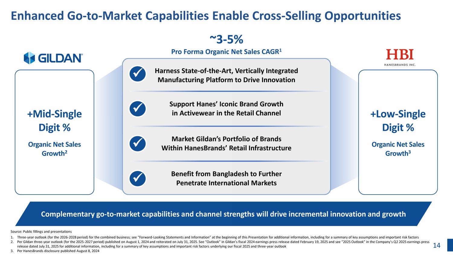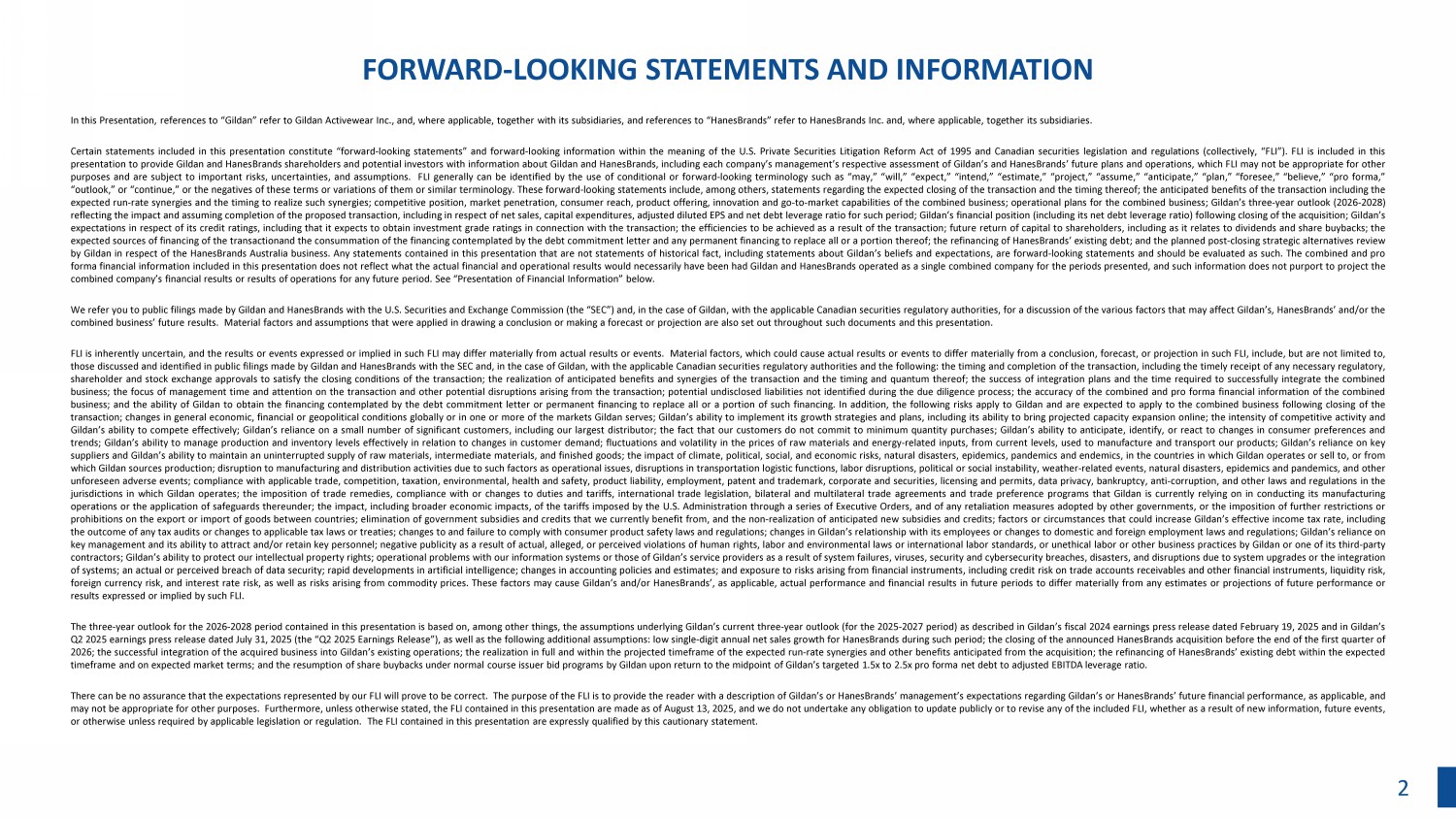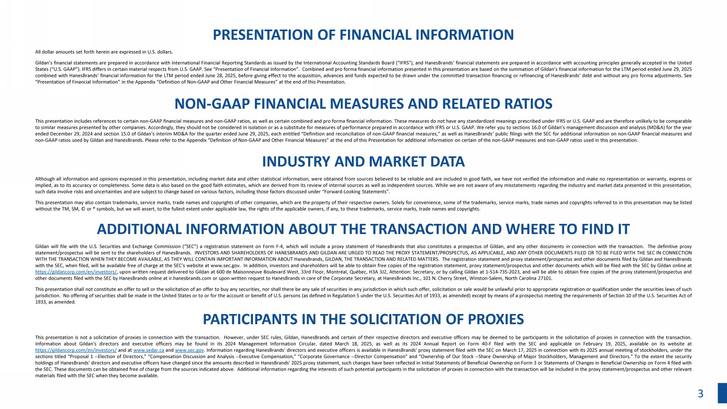 2 In this Presentation, references to “Gildan” refer to Gildan Activewear Inc . , and, where applicable, together with its subsidiaries, and references to “ HanesBrands ” refer to HanesBrands Inc . and, where applicable, together its subsidiaries . Certain statements included in this presentation constitute “forward - looking statements” and forward - looking information within the meaning of the U . S . Private Securities Litigation Reform Act of 1995 and Canadian securities legislation and regulations (collectively, “FLI”) . FLI is included in this presentation to provide Gildan and HanesBrands shareholders and potential investors with information about Gildan and HanesBrands , including each company’s management’s respective assessment of Gildan’s and HanesBrands ’ future plans and operations, which FLI may not be appropriate for other purposes and are subject to important risks, uncertainties, and assumptions . FLI generally can be identified by the use of conditional or forward - looking terminology such as “may,” “will,” “expect,” “intend,” “estimate,” “project,” “assume,” “anticipate,” “plan,” “foresee,” “believe,” “pro forma,” “outlook,” or “continue,” or the negatives of these terms or variations of them or similar terminology . These forward - looking statements include, among others, statements regarding the expected closing of the transaction and the timing thereof ; the anticipated benefits of the transaction including the expected run - rate synergies and the timing to realize such synergies ; competitive position, market penetration, consumer reach, product offering, innovation and go - to - market capabilities of the combined business ; operational plans for the combined business ; Gildan’s three - year outlook ( 2026 - 2028 ) reflecting the impact and assuming completion of the proposed transaction, including in respect of net sales, capital expenditures, adjusted diluted EPS and net debt leverage ratio for such period ; Gildan’s financial position (including its net debt leverage ratio) following closing of the acquisition ; Gildan’s expectations in respect of its credit ratings, including that it expects to obtain investment grade ratings in connection with the transaction ; the efficiencies to be achieved as a result of the transaction ; future return of capital to shareholders, including as it relates to dividends and share buybacks ; the expected sources of financing of the transactionand the consummation of the financing contemplated by the debt commitment letter and any permanent financing to replace all or a portion thereof ; the refinancing of HanesBrands ’ existing debt ; and the planned post - closing strategic alternatives review by Gildan in respect of the HanesBrands Australia business . Any statements contained in this presentation that are not statements of historical fact, including statements about Gildan’s beliefs and expectations, are forward - looking statements and should be evaluated as such . The combined and pro forma financial information included in this presentation does not reflect what the actual financial and operational results would necessarily have been had Gildan and HanesBrands operated as a single combined company for the periods presented, and such information does not purport to project the combined company’s financial results or results of operations for any future period . See “Presentation of Financial Information” below . We refer you to public filings made by Gildan and HanesBrands with the U . S . Securities and Exchange Commission (the “SEC”) and, in the case of Gildan, with the applicable Canadian securities regulatory authorities, for a discussion of the various factors that may affect Gildan’s, HanesBrands ’ and/or the combined business’ future results . Material factors and assumptions that were applied in drawing a conclusion or making a forecast or projection are also set out throughout such documents and this presentation . FLI is inherently uncertain, and the results or events expressed or implied in such FLI may differ materially from actual results or events . Material factors, which could cause actual results or events to differ materially from a conclusion, forecast, or projection in such FLI, include, but are not limited to, those discussed and identified in public filings made by Gildan and HanesBrands with the SEC and, in the case of Gildan, with the applicable Canadian securities regulatory authorities and the following : the timing and completion of the transaction, including the timely receipt of any necessary regulatory, shareholder and stock exchange approvals to satisfy the closing conditions of the transaction ; the realization of anticipated benefits and synergies of the transaction and the timing and quantum thereof ; the success of integration plans and the time required to successfully integrate the combined business ; the focus of management time and attention on the transaction and other potential disruptions arising from the transaction ; potential undisclosed liabilities not identified during the due diligence process ; the accuracy of the combined and pro forma financial information of the combined business ; and the ability of Gildan to obtain the financing contemplated by the debt commitment letter or permanent financing to replace all or a portion of such financing . In addition, the following risks apply to Gildan and are expected to apply to the combined business following closing of the transaction ; changes in general economic, financial or geopolitical conditions globally or in one or more of the markets Gildan serves ; Gildan’s ability to implement its growth strategies and plans, including its ability to bring projected capacity expansion online ; the intensity of competitive activity and Gildan’s ability to compete effectively ; Gildan’s reliance on a small number of signifi