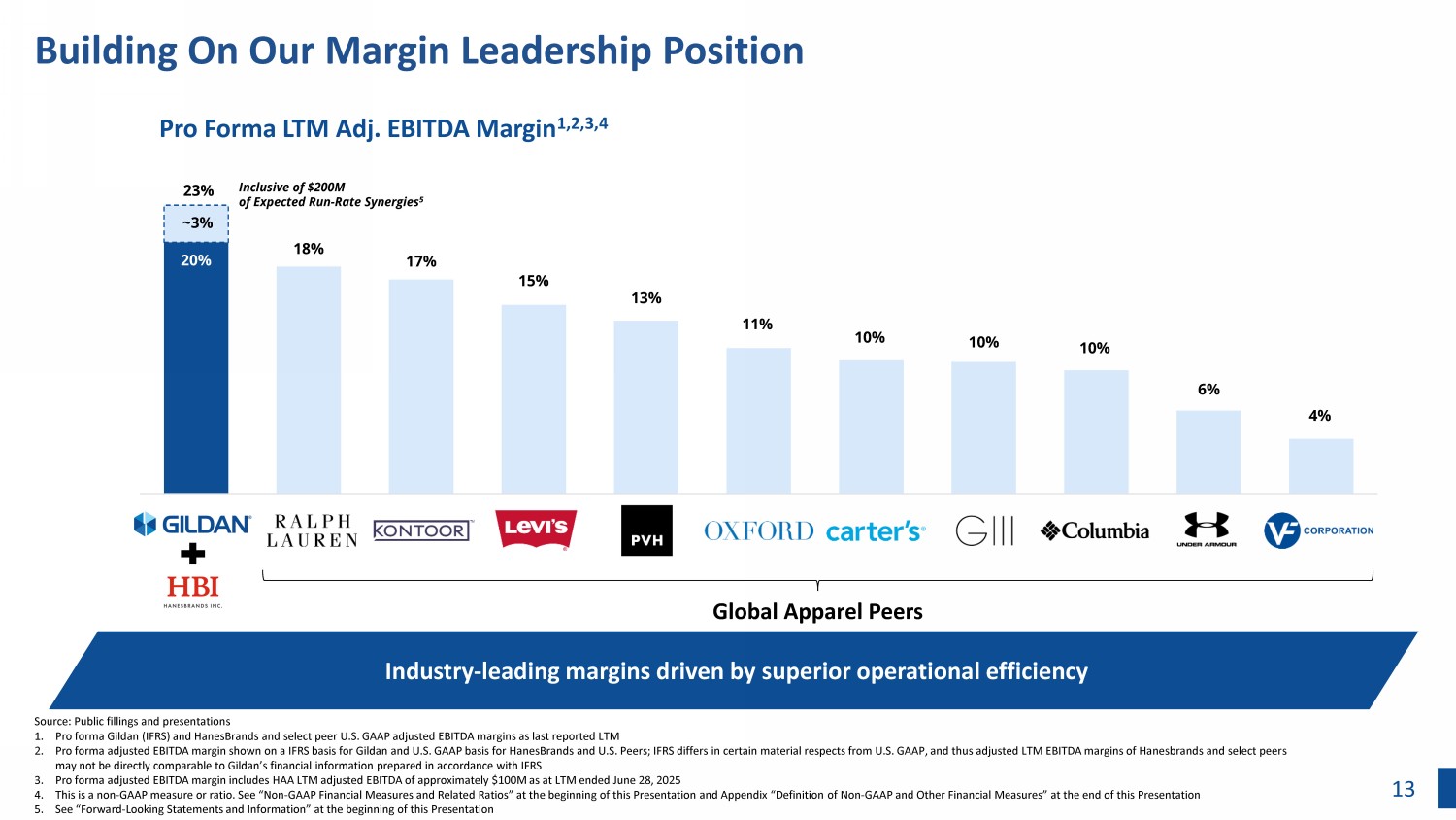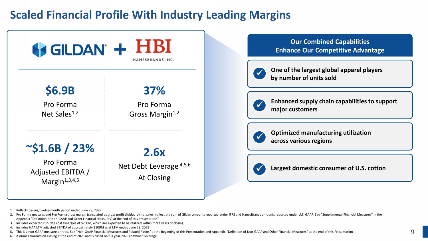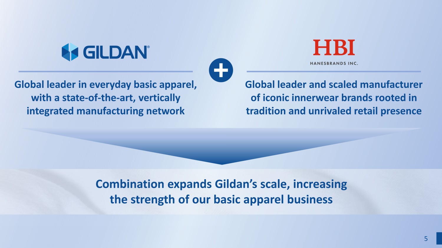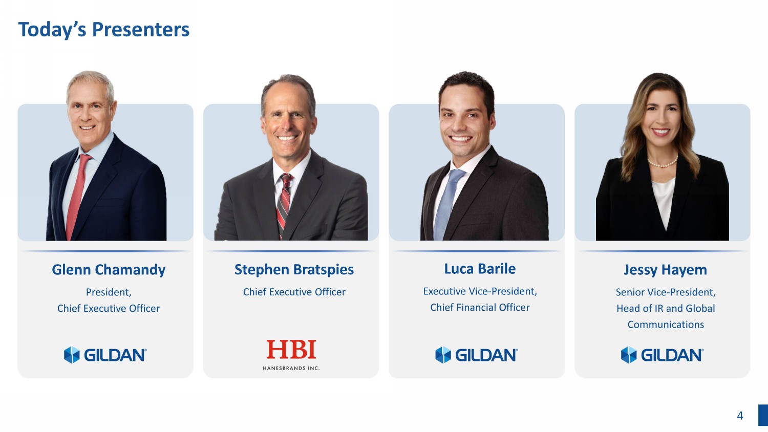 3 All dollar amounts set forth herein are expressed in U . S . dollars . Gildan’s financial statements are prepared in accordance with International Financial Reporting Standards as issued by the International Accounting Standards Board (“IFRS”), and HanesBrands ’ financial statements are prepared in accordance with accounting principles generally accepted in the United States (“U . S . GAAP”) . IFRS differs in certain material respects from U . S . GAAP . See “Presentation of Financial Information” . Combined and pro forma financial information presented in this presentation are based on the summation of Gildan’s financial information for the LTM period ended June 29 , 2025 combined with HanesBrands ’ financial information for the LTM period ended June 28 , 2025 , before giving effect to the acquisition, advances and funds expected to be drawn under the committed transaction financing or refinancing of HanesBrands ’ debt and without any pro forma adjustments . See “Presentation of Financial Information” in the Appendix “Definition of Non - GAAP and Other Financial Measures” at the end of this Presentation . PRESENTATION OF FINANCIAL INFORMATION This presentation includes references to certain non - GAAP financial measures and non - GAAP ratios, as well as certain combined and pro forma financial information . These measures do not have any standardized meanings prescribed under IFRS or U . S . GAAP and are therefore unlikely to be comparable to similar measures presented by other companies . Accordingly, they should not be considered in isolation or as a substitute for measures of performance prepared in accordance with IFRS or U . S . GAAP . We refer you to sections 16 . 0 of Gildan’s management discussion and analysis (MD&A) for the year ended December 29 , 2024 and section 15 . 0 of Gildan’s interim MD&A for the quarter ended June 29 , 2025 , each entitled “Definition and reconciliation of non - GAAP financial measures,” as well as HanesBrands ’ public filings with the SEC for additional information on non - GAAP financial measures and non - GAAP ratios used by Gildan and HanesBrands . Please refer to the Appendix “Definition of Non - GAAP and Other Financial Measures” at the end of this Presentation for additional information on certain of the non - GAAP measures and non - GAAP ratios used in this presentation . NON - GAAP FINANCIAL MEASURES AND RELATED RATIOS Although all information and opinions expressed in this presentation, including market data and other statistical information, were obtained from sources believed to be reliable and are included in good faith, we have not verified the information and make no representation or warranty, express or implied, as to its accuracy or completeness . Some data is also based on the good faith estimates, which are derived from its review of internal sources as well as independent sources . While we are not aware of any misstatements regarding the industry and market data presented in this presentation, such data involve risks and uncertainties and are subject to change based on various factors, including those factors discussed under “Forward - Looking Statements” . This presentation may also contain trademarks, service marks, trade names and copyrights of other companies, which are the property of their respective owners . Solely for convenience, some of the trademarks, service marks, trade names and copyrights referred to in this presentation may be listed without the TM, SM, © or ® symbols, but we will assert, to the fullest extent under applicable law, the rights of the applicable owners, if any, to these trademarks, service marks, trade names and copyrights . INDUSTRY AND MARKET DATA Gildan will file with the U . S . Securities and Exchange Commission (“SEC”) a registration statement on Form F - 4 , which will include a proxy statement of HanesBrands that also constitutes a prospectus of Gildan, and any other documents in connection with the transaction . The definitive proxy statement/prospectus will be sent to the shareholders of HanesBrands . INVESTORS AND SHAREHOLDERS OF HANESBRANDS AND GILDAN ARE URGED TO READ THE PROXY STATEMENT/PROSPECTUS, AS APPLICABLE, AND ANY OTHER DOCUMENTS FILED OR TO BE FILED WITH THE SEC IN CONNECTION WITH THE TRANSACTION WHEN THEY BECOME AVAILABLE, AS THEY WILL CONTAIN IMPORTANT INFORMATION ABOUT HanesBrands , GILDAN, THE TRANSACTION AND RELATED MATTERS . The registration statement and proxy statement/prospectus and other documents filed by Gildan and HanesBrands with the SEC, when filed, will be available free of charge at the SEC’s website at www . sec . gov . In addition, investors and shareholders will be able to obtain free copies of the registration statement, proxy statement/prospectus and other documents which will be filed with the SEC by Gildan online at https : //gildancorp . com/en/investors/ , upon written request delivered to Gildan at 600 de Maisonneuve Boulevard West, 33 rd Floor, Montréal, Québec, H 3 A 3 J 2 , Attention : Secretary, or by calling Gildan at 1 - 514 - 735 - 2023 , and will be able to obtain free copies of the proxy statement/prospectus and other documents filed with the SEC by HanesBrands online at ir . hanesbrands . com or upon written request to HanesBrands in care of the Corporate Secretary, at HanesBrands Inc . , 101 N . Cherry Street, Winston - Salem, North Carolina 27101 . This presentation shall not constitute an offer to sell or the solicitation of an offer to buy any securities, nor shall there be any sale of securities in any jurisdiction in which such offer, solicitation or sale would be unlawful prior to appropriate registration or qualification under the securities laws of such jurisdiction . No offering of securities shall be made in the United States or to or for the account or benefit of U . S . persons (as defined in Regulation S under the U . S . Securities Act of 1933 , as amended) except by m