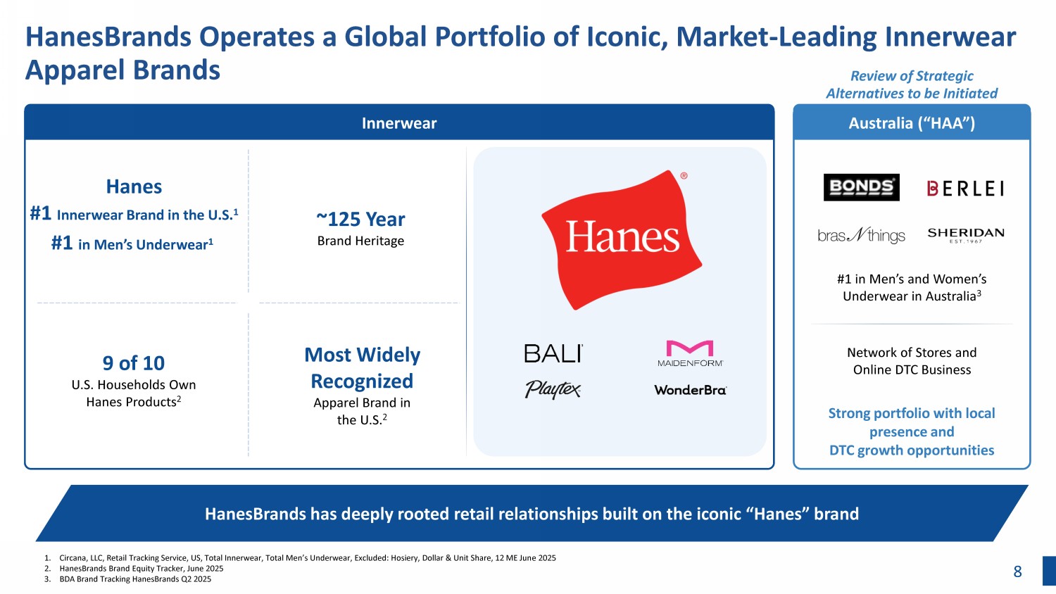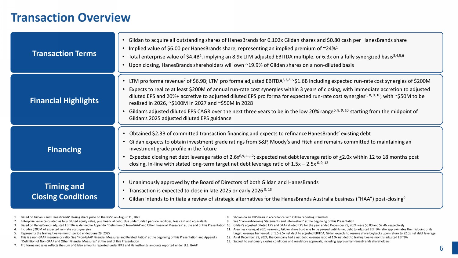 | · | Based on the closing price of Gildan and HanesBrands’ common stock on August 11, 2025, the offer implies a value of $6.00 per HanesBrands share, representing a premium of approximately 24% to HanesBrands' closing price on such date. |