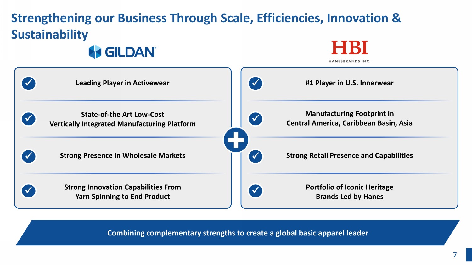 6 Transaction Overview 1. Based on Gildan’s and HanesBrands ’ closing share price on the NYSE on August 11, 2025 2. Enterprise value calculated as fully diluted equity value, plus financial debt, plus underfunded pension liabilities, less ca sh and equivalents 3. Based on HanesBrands adjusted EBITDA as defined in Appendix "Definition of Non - GAAP and Other Financial Measures" at the end of this Presentation 4. Includes $200M of expected run - rate cost synergies 5. Represents the trailing twelve - month period ended June 29, 2025 6. This is a non - GAAP measure or ratio. See “Non - GAAP Financial Measures and Related Ratios” at the beginning of this Presentation and Appendix “Definition of Non - GAAP and Other Financial Measures” at the end of this Presentation 7. Pro forma net sales reflects the sum of Gildan amounts reported under IFRS and HanesBrands amounts reported under U.S. GAAP 8. Shown on an IFRS basis in accordance with Gildan reporting standards 9. See “Forward - Looking Statements and Information” at the beginning of this Presentation 10. Gildan’s adjusted Diluted EPS and GAAP diluted EPS for the year ended December 29, 2024 were $3.00 and $2.46, respectively 11. Assumes closing at 2025 year - end; Gildan share buybacks to be paused until its net debt to adjusted EBITDA ratio approximates th e midpoint of its target leverage framework of 1.5 - 2.5x net debt to adjusted EBITDA; Gildan expects to resume share buybacks upon return to ≤2.0x net debt leverage 12. As at December 29, 2024, the Company had a net debt leverage ratio of 1.9x net debt to trailing twelve months adjusted EBITDA 13. Subject to customary closing conditions and regulatory approvals, including approval by HanesBrands shareholders • LTM pro forma revenue 7 of $6.9B; LTM pro forma adjusted EBITDA 5,6,8 ~$1.6B including expected run - rate cost synergies of $200M • Expects to realize at least $200M of annual run - rate cost synergies within 3 years of closing, with immediate accretion to adjus ted diluted EPS and 20%+ accretive to adjusted diluted EPS pro forma for expected run - rate cost synergies 6, 8, 9, 10 , with ~$50M to be realized in 2026, ~$100M in 2027 and ~$50M in 2028 • Gildan’s adjusted diluted EPS CAGR over the next three years to be in the low 20% range 6, 8, 9, 10 starting from the midpoint of Gildan’s 2025 adjusted diluted EPS guidance • Gildan to acquire all outstanding shares of HanesBrands for 0.102x Gildan shares and $0.80 cash per HanesBrands share • Implied value of $6.00 per HanesBrands share, representing an implied premium of ~24% 1 • Total enterprise value of $4.4B 2 , implying an 8.9x LTM adjusted EBITDA multiple, or 6.3x on a fully synergized basis 3,4,5,6 • Upon closing, HanesBrands shareholders will own ~19.9% of Gildan shares on a non - diluted basis • Obtained $2.3B of committed transaction financing and expects to refinance HanesBrands ’ existing debt • Gildan expects to obtain investment grade ratings from S&P, Moody’s and Fitch and remains committed to maintaining an investment grade profile in the future • Expected closing net debt leverage ratio of 2.6x 6,9,11,12 ; expected net debt leverage ratio of < 2.0x within 12 to 18 months post closing, in - line with stated long - term target net debt leverage ratio of 1.5x – 2.5x 6, 9, 12 • Unanimously approved by the Board of Directors of both Gildan and HanesBrands • Transaction is expected to close in late 2025 or early 2026 9, 13 • Gildan intends to initiate a review of strategic alternatives for the HanesBrands Australia business (“HAA”) post - closing 9 Financial Highlights Transaction Terms Timing and Closing Conditions Financing