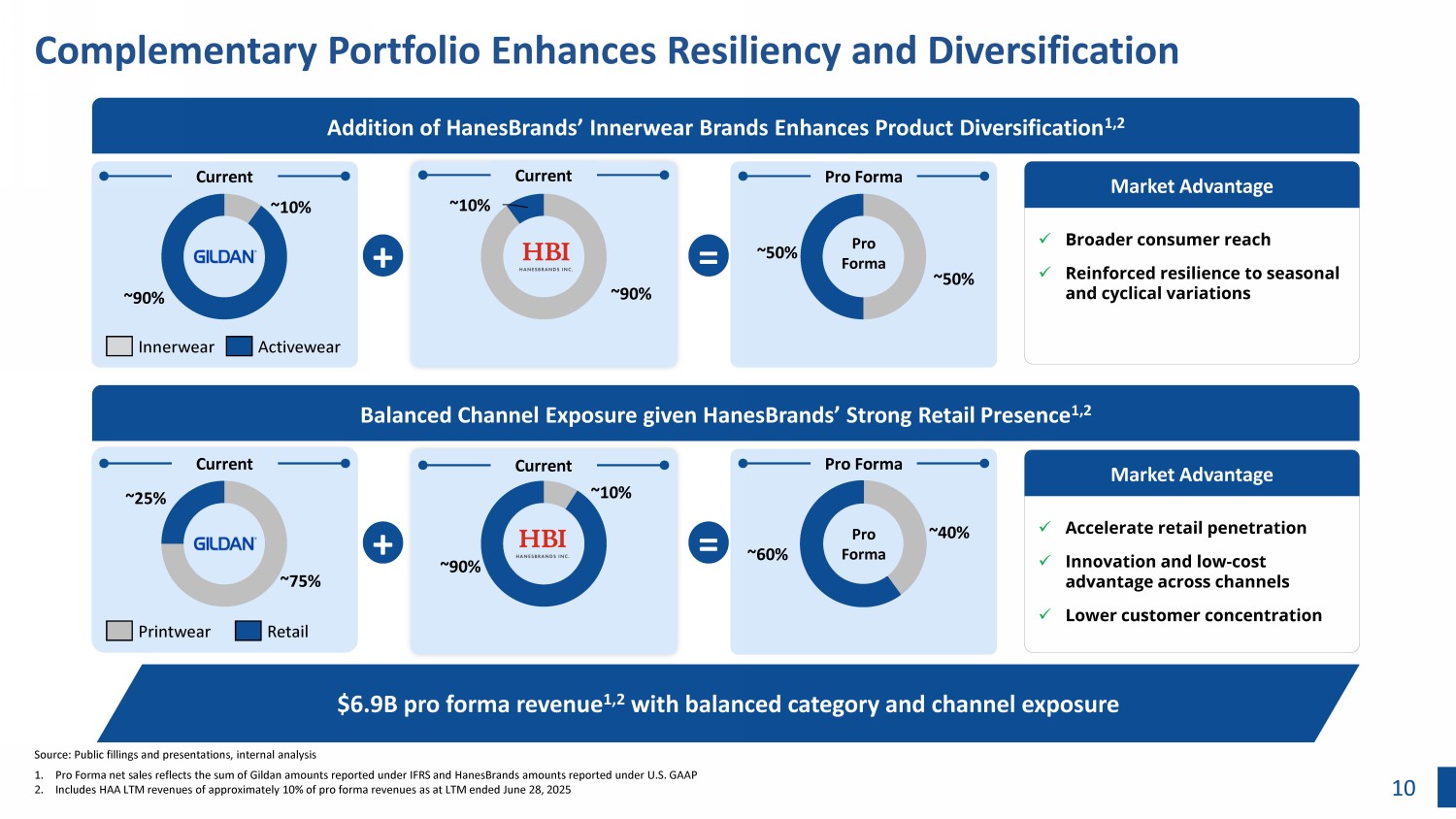 9 ] Scaled Financial Profile With Industry Leading Margins 1. Reflects trailing twelve - month period ended June 29, 2025 2. Pro Forma net sales and Pro Forma gross margin (calculated as gross profit divided by net sales) reflect the sum of Gildan am oun ts reported under IFRS and HanesBrands amounts reported under U.S. GAAP. See “Supplemental Financial Measures” in the Appendix “Definition of Non - GAAP and Other Financial Measures” at the end of this Presentation” 3. Includes expected run - rate cost synergies of $200M, which are expected to be realized within three years of closing 4. Includes HAA LTM adjusted EBITDA of approximately $100M as at LTM ended June 28, 2025 5. This is a non - GAAP measure or ratio. See “Non - GAAP Financial Measures and Related Ratios” at the beginning of this Presentation and Appendix “Definition of Non - GAAP and Other Financial Measures” at the end of this Presentation 6. Assumes transaction closing at the end of 2025 and is based on full year 2025 combined leverage $6.9B Pro Forma Net Sales 1,2 ~$1.6B / 23% Pro Forma Adjusted EBITDA / Margin 1,3,4,5 2.6x Net Debt Leverage 4,5,6 At Closing 37% Pro Forma Gross Margin 1,2 One of the largest global apparel players by number of units sold Enhanced supply chain capabilities to support major customers Optimized manufacturing utilization across various regions Largest domestic consumer of U.S. cotton x x x x Our Combined Capabilities Enhance Our Competitive Advantage