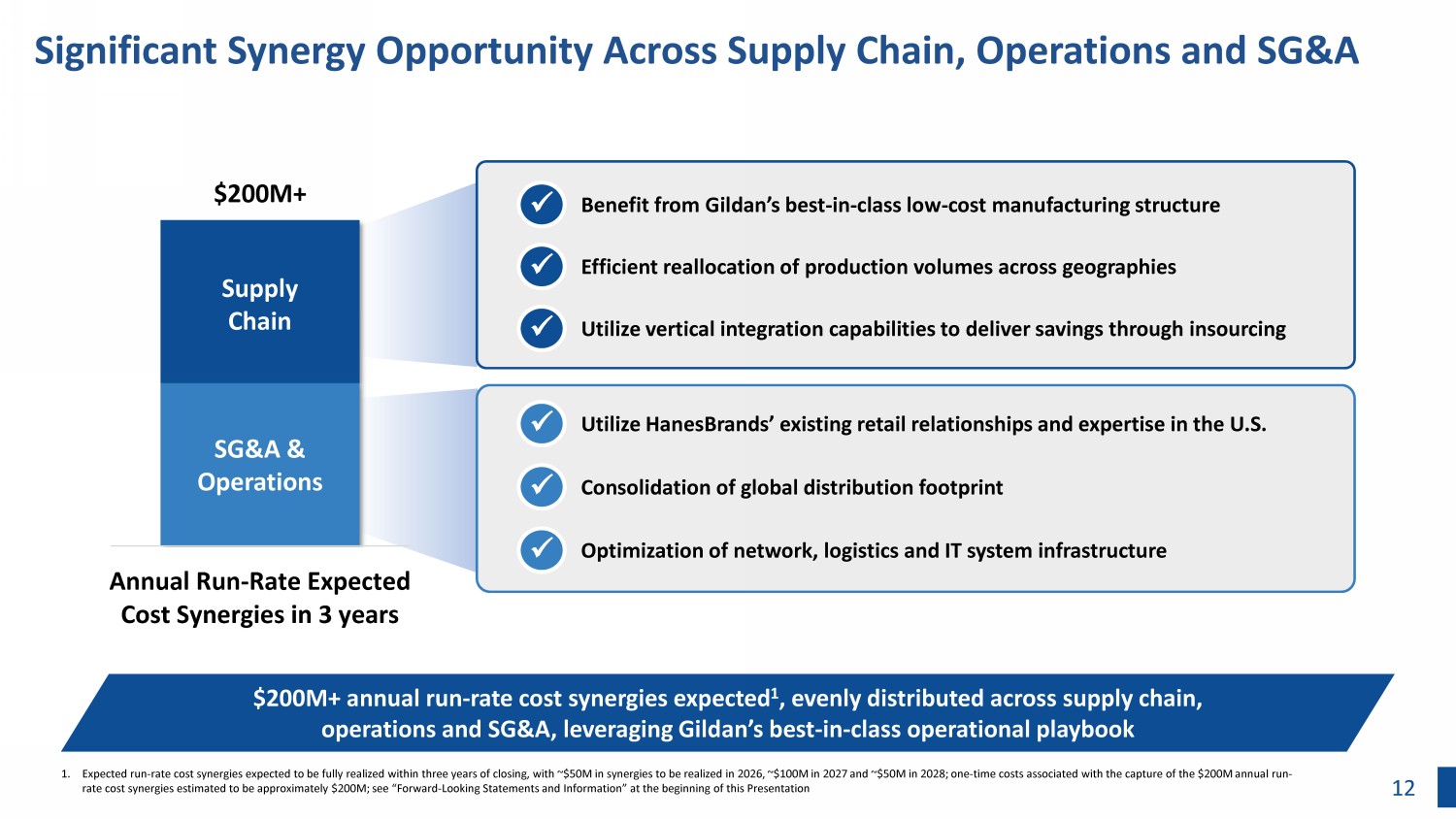 | · | Significant synergy opportunity. Gildan has identified at least $200 million in expected annual run-rate cost synergies across supply chain, operations and SG&A that it expects to realize within three years, with ~$50 million to be realized in 2026, ~$100 million in 2027 and ~$50 million in 2028. Inclusive of these synergies, the pro forma adjusted EBITDA1 of the combined business would have been approximately $1.6 billion for the trailing twelve months ended June 29, 2025. |