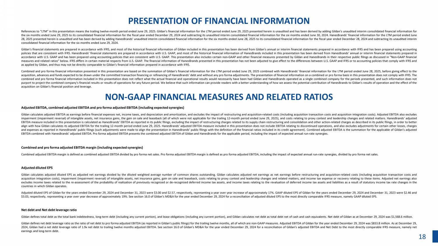 This press release includes references to certain non-GAAP financial measures and non-GAAP ratios, as well as certain combined and pro forma financial information, as described below. These measures do not have any standardized meanings prescribed by IFRS or U.S. GAAP and are therefore unlikely to be comparable to similar measures presented by other companies. Accordingly, they should not be considered in isolation or as a substitute for measures of performance prepared in accordance with IFRS or U.S. GAAP. We refer you to sections 16.0 of Gildan’s MD&A for the year ended December 29, 2024 and section 15.0 of Gildan’s interim MD&A for the quarter ended June 29, 2025, each entitled “Definition and reconciliation of non-GAAP financial measures”, for additional information on certain of the non-GAAP financial measures and ratios used in this press release, including for a description of the usefulness of such measures, which sections are incorporated by reference herein and which filings are available on SEDAR+ at www.sedarplus.ca. HanesBrands prepares and presents financial statements in accordance with U.S. GAAP; refer to HanesBrands’ public filings with the SEC for additional information. Please refer to “Presentation of financial information” above.