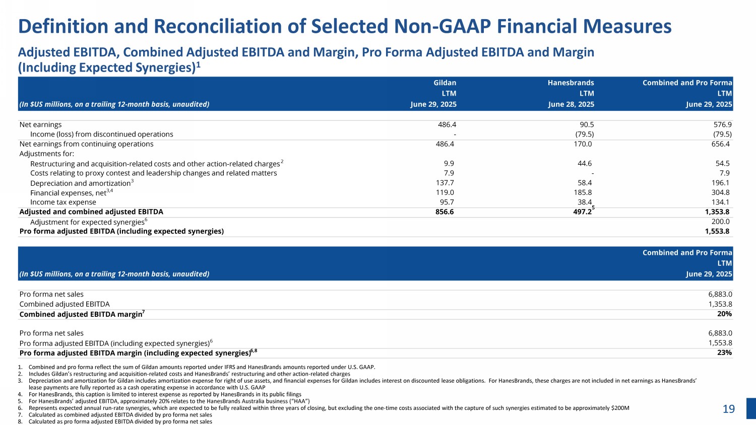 18 References to “LTM” in this presentation means the trailing twelve - month period ended June 29 , 2025 . Gildan’s financial information for the LTM period ended June 29 , 2025 presented herein is unaudited and has been derived by adding Gildan’s unaudited interim consolidated financial information for the six months ended June 29 , 2025 to its consolidated financial information for the fiscal year ended December 29 , 2024 and subtracting its unaudited interim consolidated financial information for the six months ended June 30 , 2024 . HanesBrands ’ financial information for the LTM period ended June 28 , 2025 presented herein is unaudited and has been derived by adding HanesBrands ’ unaudited interim consolidated financial information for the six months ended June 28 , 2025 to its consolidated financial information for the fiscal year ended December 28 , 2024 and subtracting its unaudited interim consolidated financial information for the six months ended June 29 , 2024 . Gildan’s financial statements are prepared in accordance with IFRS, and most of the historical financial information of Gildan included in this presentation has been derived from Gildan’s annual or interim financial statements prepared in accordance with IFRS and has been prepared using accounting policies that are consistent with IFRS . HanesBrands ’ financial statements are prepared in accordance with U . S . GAAP, and most of the historical financial information of HanesBrands included in this presentation has been derived from HanesBrands ’ annual or interim financial statements prepared in accordance with U . S . GAAP and has been prepared using accounting policies that are consistent with U . S . GAAP . This presentation also includes certain non - GAAP and other financial measures presented by Gildan and HanesBrands in their respective public filings as discussed in “Non - GAAP financial measures and related ratios” below . IFRS differs in certain material respects from U . S . GAAP . The financial information of HanesBrands presented in this presentation has not been adjusted to give effect to the differences between U . S . GAAP and IFRS or to accounting policies that comply with IFRS and as applied by Gildan, and thus may not be directly comparable to Gildan’s financial information prepared in accordance with IFRS . Combined and pro forma financial information presented in this presentation are based on the summation of Gildan’s financial information for the LTM period ended June 29 , 2025 combined with HanesBrands ’ financial information for the LTM period ended June 28 , 2025 , before giving effect to the acquisition, advances and funds expected to be drawn under the committed transaction financing or refinancing of HanesBrands ’ debt and without any pro forma adjustments . The presentation of financial information on a combined or pro forma basis in this presentation does not comply with IFRS . The combined and pro forma financial information included in this presentation does not reflect what the actual financial and operational results would necessarily have been had Gildan and HanesBrands operated as a single combined company for the periods presented, and such information does not purport to project the combined company’s financial results or results of operations for any future period . We believe that such information can provide readers with a better understanding of how we assess the potential contribution of HanesBrands to Gildan’s results of operation and the effect of the acquisition on Gildan’s financial position and leverage . PRESENTATION OF FINANCIAL INFORMATION Adjusted EBITDA, combined adjusted EBITDA and pro forma adjusted EBITDA (including expected synergies) Gildan calculates adjusted EBITDA as earnings before financial expenses net, income taxes, and depreciation and amortization, and excludes the impact of restructuring and acquisition - related costs (including acquisition transaction costs and acquisition integration costs) . Adjusted EBITDA also excludes impairment (impairment reversal) of intangible assets, net insurance gains, the gain on sale and leaseback (all of which were not applicable for the trailing 12 - month period ended June 29 , 2025 ), and costs relating to proxy contest and leadership changes and related matters . HanesBrands ’ adjusted EBITDA measure included in this presentation is calculated as HanesBrands ’ EBITDA as reported in its public filings, excluding the impact of restructuring charges related to its supply chain restructuring and consolidation and other action - related charges as described in its public filings, in order to better align with how Gildan calculates its adjusted EBITDA for the trailing 12 - month period ended June 29 , 2025 . HanesBrands ’ adjusted EBITDA measure included in this presentation does not include EBITDA relating to discontinued operations, and also excludes adjustments for certain other losses, charges and expenses as reported in HanesBrands ’ public filings (such adjustments were made to align the presentation in HanesBrands ’ public filings with the definition of the financial ratios included in its credit agreement) . Combined adjusted EBITDA is the summation for the applicable of Gildan’s adjusted EBITDA combined with HanesBrands ’ adjusted EBITDA . Pro forma adjusted EBITDA presents the combined adjusted EBITDA of Gildan and HanesBrands for the applicable period, including the impact of expected annual run - rate synergies . Combined and pro forma adjusted EBITDA margin (including expected synergies) Combined adjusted EBITDA margin is defined as combined adjusted EBITDA divided by pro forma net sales . Pro forma adjusted EBITDA margin is defined as pro forma adjusted EBITDA, including the impact of expected annual run - rate synergies, divided by pro forma net sales . Adjusted diluted EPS Gildan calculates adjusted diluted EPS as adjusted net earnings divided by the d
