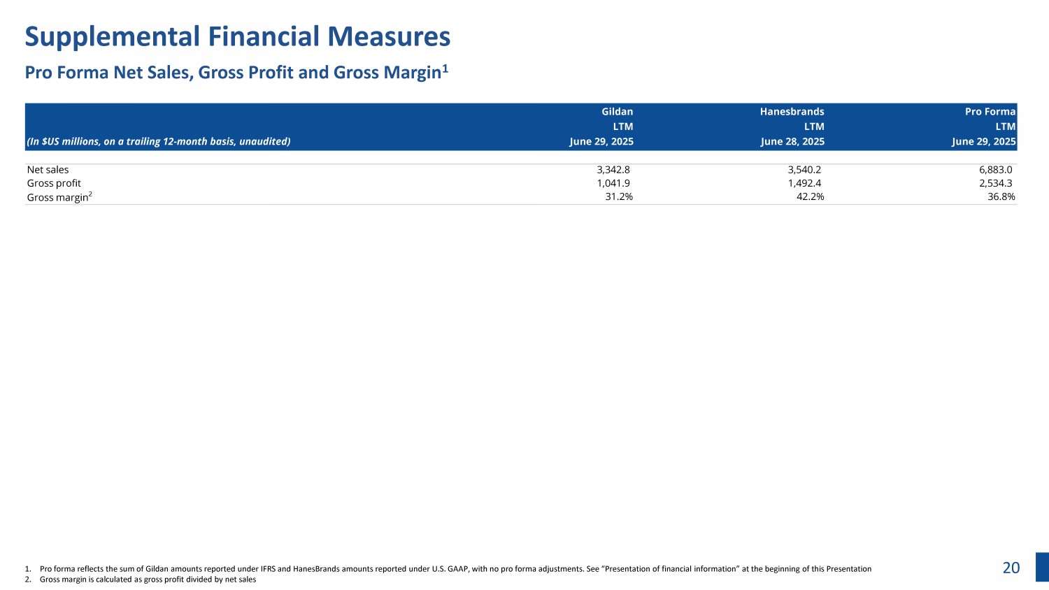 19 Definition and Reconciliation of Selected Non - GAAP Financial Measures 1. Combined and pro forma reflect the sum of Gildan amounts reported under IFRS and HanesBrands amounts reported under U.S. GAAP. 2. Includes Gildan’s restructuring and acquisition - related costs and HanesBrands ’ restructuring and other action - related charges 3. Depreciation and amortization for Gildan includes amortization expense for right of use assets, and financial expenses for Gi lda n includes interest on discounted lease obligations. For HanesBrands , these charges are not included in net earnings as HanesBrands ’ lease payments are fully reported as a cash operating expense in accordance with U.S. GAAP 4. For HanesBrands , this caption is limited to interest expense as reported by HanesBrands in its public filings 5. For HanesBrands ’ adjusted EBITDA, approximately 20% relates to the HanesBrands Australia business (“HAA”) 6. Represents expected annual run - rate synergies, which are expected to be fully realized within three years of closing, but exclud ing the one - time costs associated with the capture of such synergies estimated to be approximately $200M 7. Calculated as combined adjusted EBITDA divided by pro forma net sales 8. Calculated as pro forma adjusted EBITDA divided by pro forma net sales Adjusted EBITDA, Combined Adjusted EBITDA and Margin, Pro Forma Adjusted EBITDA and Margin (Including Expected Synergies) 1 5 Net earnings 486.4 90.5 576.9 Income (loss) from discontinued operations - (79.5) (79.5) Net earnings from continuing operations 486.4 170.0 656.4 Adjustments for: Restructuring and acquisition - related costs and other action - related charges 2 9.9 44.6 54.5 Costs relating to proxy contest and leadership changes and related matters 7.9 - 7.9 Depreciation and amortization 3 137.7 58.4 196.1 Financial expenses, net 3,4 119.0 185.8 304.8 Income tax expense 95.7 38.4 134.1 Adjusted and combined adjusted EBITDA 856.6 497.2 1,353.8 Adjustment for expected synergies 6 200.0 Pro forma adjusted EBITDA (including expected synergies) 1,553.8 Pro forma net sales 6,883.0 Combined adjusted EBITDA 1,353.8 Combined adjusted EBITDA margin 7 20% Pro forma net sales 6,883.0 Pro forma adjusted EBITDA (including expected synergies) 6 1,553.8 Pro forma adjusted EBITDA margin (including expected synergies) 6,8 23% (In $US millions, on a trailing 12 - month basis, unaudited) Combined and Pro Forma LTM June 29, 2025 Gildan LTM June 29, 2025 Hanesbrands LTM June 28, 2025 Combined and Pro Forma LTM June 29, 2025 (In $US millions, on a trailing 12 - month basis, unaudited)