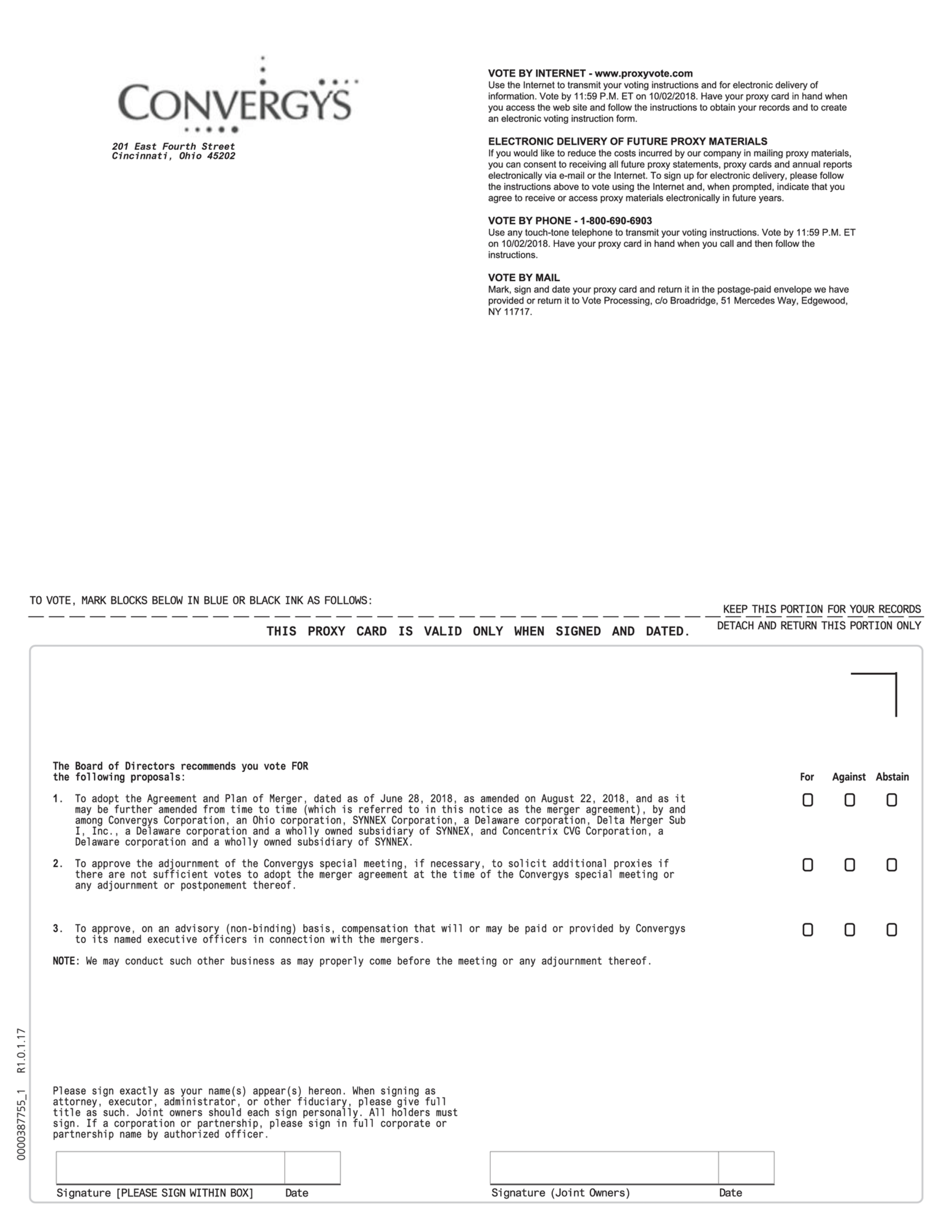 | 1. | to consider and vote on a proposal to approve the issuance of shares of SYNNEX common stock, par value $0.001 per share, in connection with the first of the two mergers contemplated by the Agreement and Plan of Merger, dated as of June 28, 2018, as amended by Amendment No. 1 to the Agreement and Plan of Merger, dated as of August 22, 2018, and as it may be amended from time to time (which is referred to in this notice as the merger agreement), among SYNNEX, Delta Merger Sub I, Inc., a Delaware corporation and wholly owned subsidiary of SYNNEX, Concentrix CVG Corporation, a Delaware corporation and wholly owned subsidiary of SYNNEX, and Convergys Corporation, an Ohio corporation (a copy of the merger agreement is attached as Annex A to the accompanying joint proxy statement/prospectus); and |