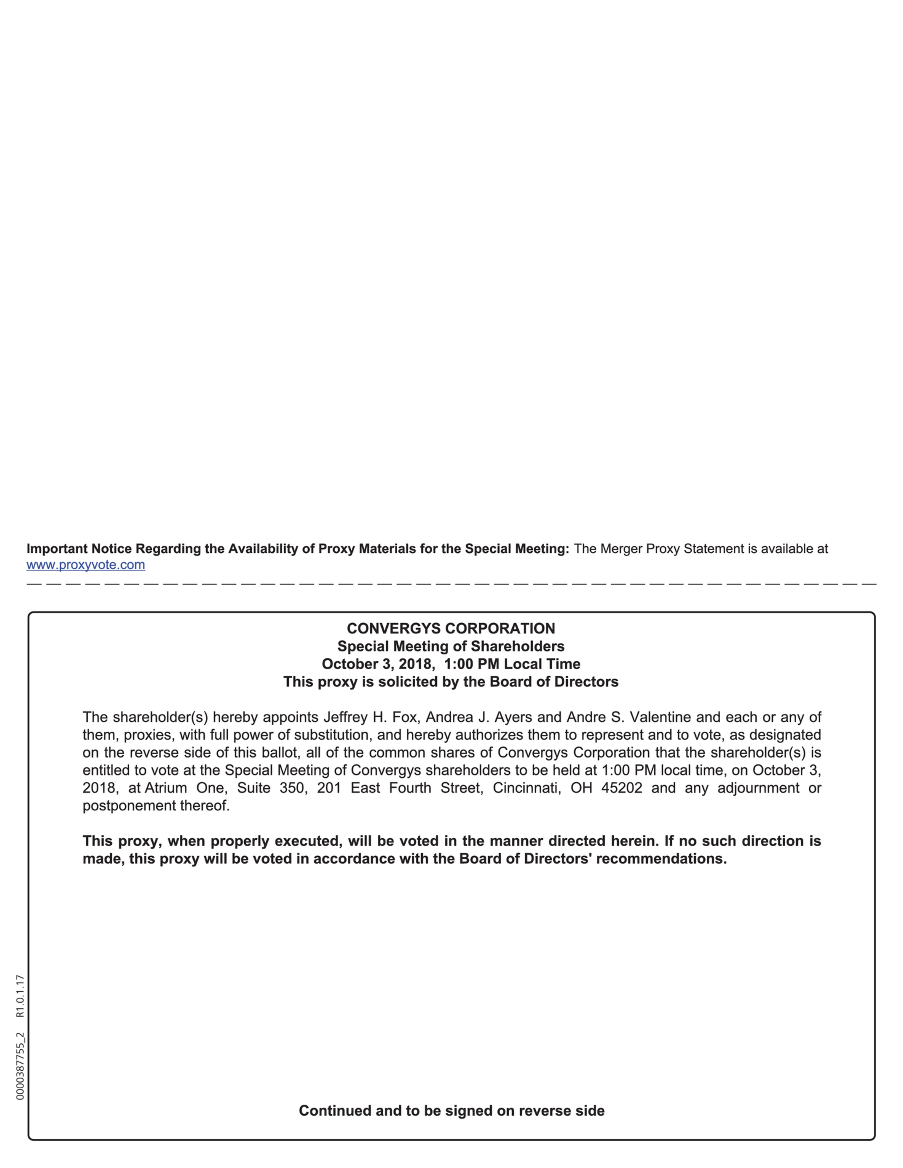 At the special meeting of shareholders of Convergys, Convergys shareholders will be asked to vote on (i) a proposal to adopt the merger agreement, (ii) a proposal to adjourn from time to time the Convergys special meeting if necessary to solicit additional proxies if there are not sufficient votes at the time of the special meeting, or any adjournment or postponement thereof, to adopt the merger agreement, and (iii) a proposal to approve, on an advisory (non-binding) basis, compensation that will or may be paid or provided by Convergys to its named executive officers in connection with the mergers.