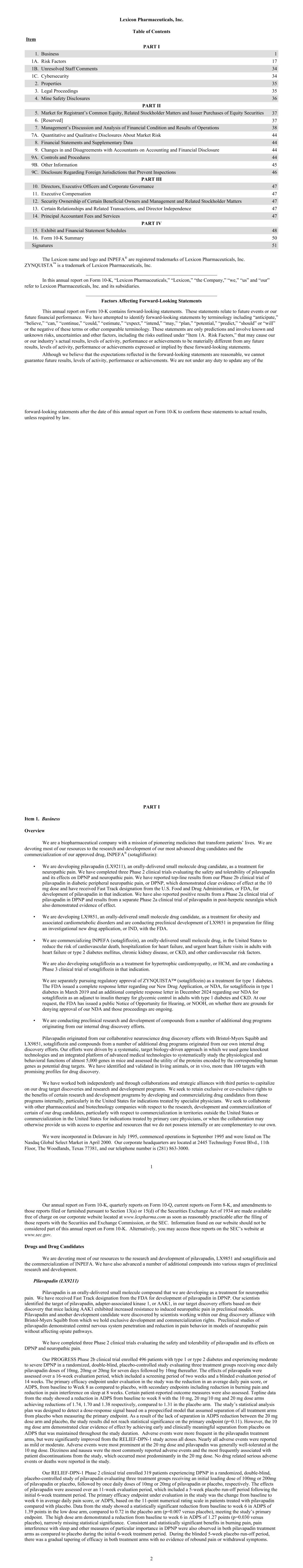 Lexicon Pharmaceuticals, Inc. Table of Contents Item PART I 1. Business 1 1A. Risk Factors 17 1B. Unresolved Staff Comments 34 1C. Cybersecurity 34 2. Properties 35 3. Legal Proceedings 35 4. Mine Safety Disclosures 36 PART II 5. Market for Registrant’s Common Equity, Related Stockholder Matters and Issuer Purchases of Equity Securities 37 6. [Reserved] 37 7. Management’s Discussion and Analysis of Financial Condition and Results of Operations 38 7A. Quantitative and Qualitative Disclosures About Market Risk 44 8. Financial Statements and Supplementary Data 44 9. Changes in and Disagreements with Accountants on Accounting and Financial Disclosure 44 9A. Controls and Procedures 44 9B. Other Information 45 9C. Disclosure Regarding Foreign Jurisdictions that Prevent Inspections 46 PART III 10. Directors, Executive Officers and Corporate Governance 47 11. Executive Compensation 47 12. Security Ownership of Certain Beneficial Owners and Management and Related Stockholder Matters 47 13. Certain Relationships and Related Transactions, and Director Independence 47 14. Principal Accountant Fees and Services 47 PART IV 15. Exhibit and Financial Statement Schedules 48 16. Form 10-K Summary 50 Signatures 51 The Lexicon name and logo and INPEFA® are registered trademarks of Lexicon Pharmaceuticals, Inc. ZYNQUISTA™ is a trademark of Lexicon Pharmaceuticals, Inc. _____________________________________________________ In this annual report on Form 10-K, “Lexicon Pharmaceuticals,” “Lexicon,” “the Company,” “we,” “us” and “our” refer to Lexicon Pharmaceuticals, Inc. and its subsidiaries. _____________________________________________________ Factors Affecting Forward-Looking Statements This annual report on Form 10-K contains forward-looking statements. These statements relate to future events or our future financial performance. We have attempted to identify forward-looking statements by terminology including “anticipate,” “believe,” “can,” “continue,” “could,” “estimate,” “expect,” “intend,” “may,” “plan,” “potential,” “predict,” “should” or “will” or the negative of these terms or other comparable terminology. These statements are only predictions and involve known and unknown risks, uncertainties and other factors, including the risks outlined under “Item 1A. Risk Factors,” that may cause our or our industry’s actual results, levels of activity, performance or achievements to be materially different from any future results, levels of activity, performance or achievements expressed or implied by these forward-looking statements. Although we believe that the expectations reflected in the forward-looking statements are reasonable, we cannot guarantee future results, levels of activity, performance or achievements. We are not under any duty to update any of the forward-looking statements after the date of this annual report on Form 10-K to conform these statements to actual results, unless required by law. PART I Item 1. Business Overview We are a biopharmaceutical company with a mission of pioneering medicines that transform patients’ lives. We are devoting most of our resources to the research and development of our most advanced drug candidates and the commercialization of our approved drug, INPEFA® (sotagliflozin): • We are developing pilavapadin (LX9211), an orally-delivered small molecule drug candidate, as a treatment for neuropathic pain. We have completed three Phase 2 clinical trials evaluating the safety and tolerability of pilavapadin and its effects on DPNP and neuropathic pain. We have reported top-line results from our Phase 2b clinical trial of pilavapadin in diabetic peripheral neuropathic pain, or DPNP, which demonstrated clear evidence of effect at the 10 mg dose and have received Fast Track designation from the U.S. Food and Drug Administration, or FDA, for development of pilavapadin in that indication. We have also reported positive results from a Phase 2a clinical trial of pilavapadin in DPNP and results from a separate Phase 2a clinical trial of pilavapadin in post-herpetic neuralgia which also demonstrated evidence of effect. • We are developing LX9851, an orally-delivered small molecule drug candidate, as a treatment for obesity and associated cardiometabolic disorders and are conducting preclinical development of LX9851 in preparation for filing an investigational new drug application, or IND, with the FDA. • We are commercializing INPEFA (sotagliflozin), an orally-delivered small molecule drug, in the United States to reduce the risk of cardiovascular death, hospitalization for heart failure, and urgent heart failure visits in adults with heart failure or type 2 diabetes mellitus, chronic kidney disease, or CKD, and other cardiovascular risk factors. We are also developing sotagliflozin as a treatment for hypertrophic cardiomyopathy, or HCM, and are conducting a Phase 3 clinical trial of sotagliflozin in that indication. We are separately pursuing regulatory approval of ZYNQUISTA™ (sotagliflozin) as a treatment for type 1 diabetes. The FDA issued a complete response letter regarding our New Drug Application, or NDA, for sotagliflozin in type 1 diabetes in March 2019 and an additional complete response letter in December 2024 regarding our NDA for sotagliflozin as an adjunct to insulin therapy for glycemic control in adults with type 1 diabetes and CKD. At our request, the FDA has issued a public Notice of Opportunity for Hearing, or NOOH, on whether there are grounds for denying approval of our NDA and those proceedings are ongoing. • We are conducting preclinical research and development of compounds from a number of additional drug programs originating from our internal drug discovery efforts. Pilavapadin originated from our collaborative neuroscience drug discovery efforts with Bristol-Myers Squibb and LX9851, sotagliflozin and compounds from a number of additional drug pro