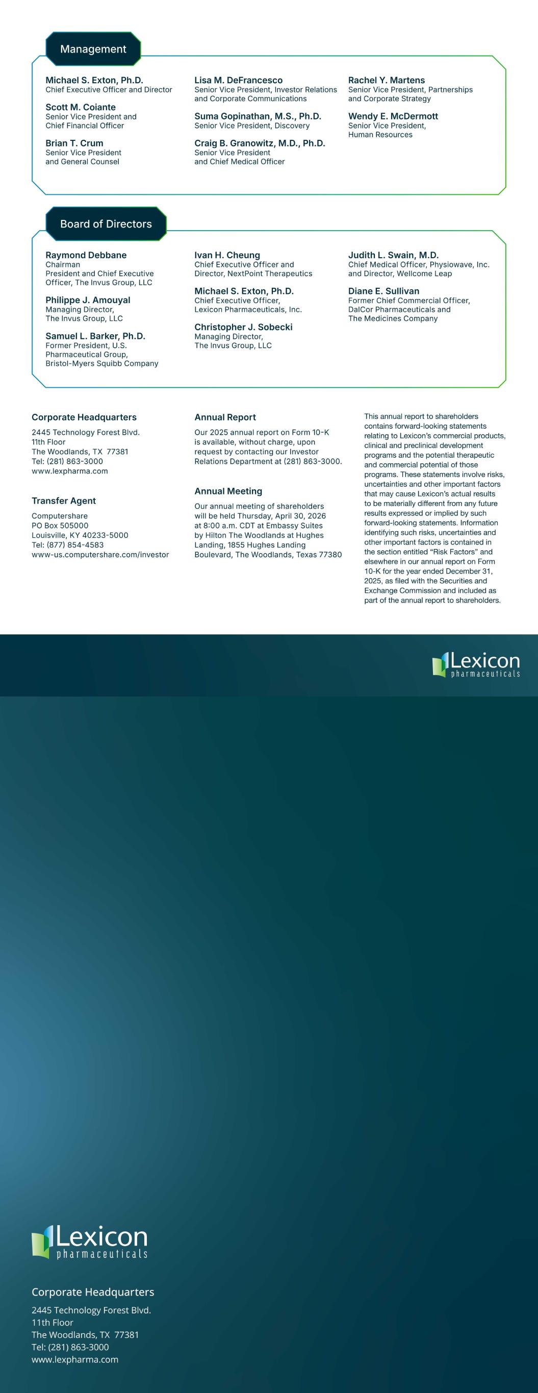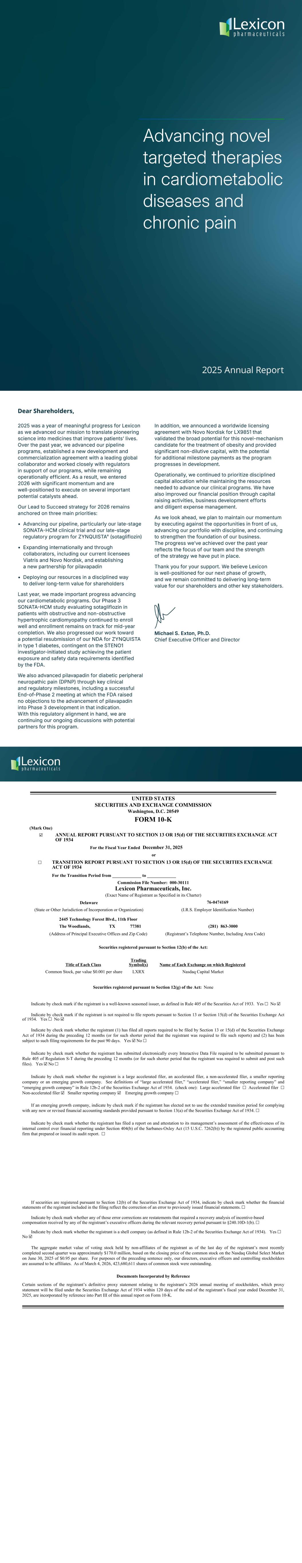 UNITED STATES SECURITIES AND EXCHANGE COMMISSION Washington, D.C. 20549 FORM 10-K (Mark One) ☑ ANNUAL REPORT PURSUANT TO SECTION 13 OR 15(d) OF THE SECURITIES EXCHANGE ACT OF 1934 For the Fiscal Year Ended December 31, 2025 or ☐ TRANSITION REPORT PURSUANT TO SECTION 13 OR 15(d) OF THE SECURITIES EXCHANGE ACT OF 1934 For the Transition Period from _____________ to _____________ Commission File Number: 000-30111 Lexicon Pharmaceuticals, Inc. (Exact Name of Registrant as Specified in its Charter) Delaware 76-0474169 (State or Other Jurisdiction of Incorporation or Organization) (I.R.S. Employer Identification Number) 2445 Technology Forest Blvd., 11th Floor The Woodlands, TX 77381 (281) 863-3000 (Address of Principal Executive Offices and Zip Code) (Registrant’s Telephone Number, Including Area Code) Securities registered pursuant to Section 12(b) of the Act: Title of Each Class Trading Symbol(s) Name of Each Exchange on which Registered Common Stock, par value $0.001 per share LXRX Nasdaq Capital Market Securities registered pursuant to Section 12(g) of the Act: None Indicate by check mark if the registrant is a well-known seasoned issuer, as defined in Rule 405 of the Securities Act of 1933. Yes ☐ No ☑ Indicate by check mark if the registrant is not required to file reports pursuant to Section 13 or Section 15(d) of the Securities Exchange Act of 1934. Yes ☐ No ☑ Indicate by check mark whether the registrant (1) has filed all reports required to be filed by Section 13 or 15(d) of the Securities Exchange Act of 1934 during the preceding 12 months (or for such shorter period that the registrant was required to file such reports) and (2) has been subject to such filing requirements for the past 90 days. Yes ☑ No ☐ Indicate by check mark whether the registrant has submitted electronically every Interactive Data File required to be submitted pursuant to Rule 405 of Regulation S-T during the preceding 12 months (or for such shorter period that the registrant was required to submit and post such files). Yes ☑ No ☐ Indicate by check mark whether the registrant is a large accelerated filer, an accelerated filer, a non-accelerated filer, a smaller reporting company or an emerging growth company. See definitions of “large accelerated filer,” “accelerated filer,” “smaller reporting company” and “emerging growth company” in Rule 12b-2 of the Securities Exchange Act of 1934. (check one): Large accelerated filer ☐ Accelerated filer ☐ Non-accelerated filer ☑ Smaller reporting company ☑ Emerging growth company ☐ If an emerging growth company, indicate by check mark if the registrant has elected not to use the extended transition period for complying with any new or revised financial accounting standards provided pursuant to Section 13(a) of the Securities Exchange Act of 1934. ☐ Indicate by check mark whether the registrant has filed a report on and attestation to its management’s assessment of the effectiveness of its internal control over financial reporting under Section 404(b) of the Sarbanes-Oxley Act (15 U.S.C. 7262(b)) by the registered public accounting firm that prepared or issued its audit report. ☐ If securities are registered pursuant to Section 12(b) of the Securities Exchange Act of 1934, indicate by check mark whether the financial statements of the registrant included in the filing reflect the correction of an error to previously issued financial statements. ☐ Indicate by check mark whether any of those error corrections are restatements that required a recovery analysis of incentive-based compensation received by any of the registrant’s executive officers during the relevant recovery period pursuant to §240.10D-1(b). ☐ Indicate by check mark whether the registrant is a shell company (as defined in Rule 12b-2 of the Securities Exchange Act of 1934). Yes ☐ No ☑ The aggregate market value of voting stock held by non-affiliates of the registrant as of the last day of the registrant’s most recently completed second quarter was approximately $170.0 million, based on the closing price of the common stock on the Nasdaq Global Select Market on June 30, 2025 of $0.95 per share. For purposes of the preceding sentence only, our directors, executive officers and controlling stockholders are assumed to be affiliates. As of March 4, 2026, 423,680,611 shares of common stock were outstanding. Documents Incorporated by Reference Certain sections of the registrant’s definitive proxy statement relating to the registrant’s 2026 annual meeting of stockholders, which proxy statement will be filed under the Securities Exchange Act of 1934 within 120 days of the end of the registrant’s fiscal year ended December 31, 2025, are incorporated by reference into Part III of this annual report on Form 10-K.