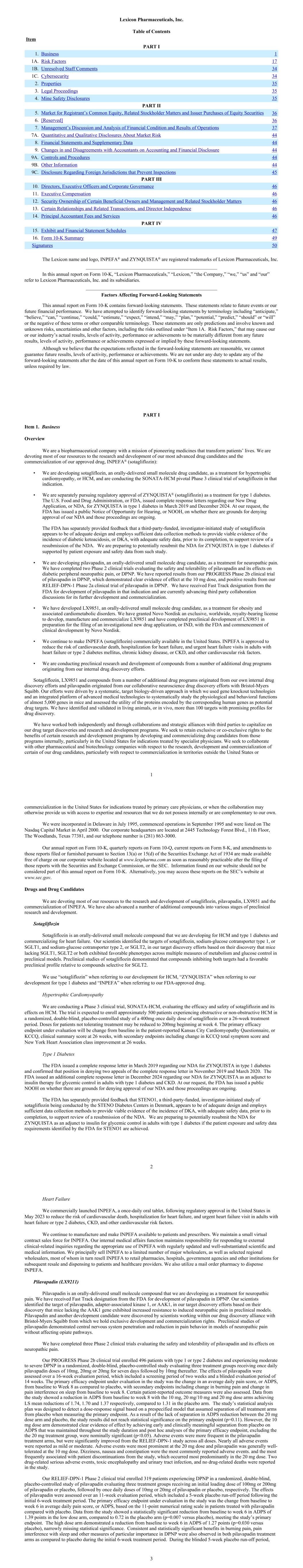 Lexicon Pharmaceuticals, Inc. Table of Contents Item PART I 1. Business 1 1A. Risk Factors 17 1B. Unresolved Staff Comments 34 1C. Cybersecurity 34 2. Properties 35 3. Legal Proceedings 35 4. Mine Safety Disclosures 35 PART II 5. Market for Registrant’s Common Equity, Related Stockholder Matters and Issuer Purchases of Equity Securities 36 6. [Reserved] 36 7. Management’s Discussion and Analysis of Financial Condition and Results of Operations 37 7A. Quantitative and Qualitative Disclosures About Market Risk 44 8. Financial Statements and Supplementary Data 44 9. Changes in and Disagreements with Accountants on Accounting and Financial Disclosure 44 9A. Controls and Procedures 44 9B. Other Information 44 9C. Disclosure Regarding Foreign Jurisdictions that Prevent Inspections 45 PART III 10. Directors, Executive Officers and Corporate Governance 46 11. Executive Compensation 46 12. Security Ownership of Certain Beneficial Owners and Management and Related Stockholder Matters 46 13. Certain Relationships and Related Transactions, and Director Independence 46 14. Principal Accountant Fees and Services 46 PART IV 15. Exhibit and Financial Statement Schedules 47 16. Form 10-K Summary 49 Signatures 50 The Lexicon name and logo, INPEFA® and ZYNQUISTA® are registered trademarks of Lexicon Pharmaceuticals, Inc. _____________________________________________________ In this annual report on Form 10-K, “Lexicon Pharmaceuticals,” “Lexicon,” “the Company,” “we,” “us” and “our” refer to Lexicon Pharmaceuticals, Inc. and its subsidiaries. _____________________________________________________ Factors Affecting Forward-Looking Statements This annual report on Form 10-K contains forward-looking statements. These statements relate to future events or our future financial performance. We have attempted to identify forward-looking statements by terminology including “anticipate,” “believe,” “can,” “continue,” “could,” “estimate,” “expect,” “intend,” “may,” “plan,” “potential,” “predict,” “should” or “will” or the negative of these terms or other comparable terminology. These statements are only predictions and involve known and unknown risks, uncertainties and other factors, including the risks outlined under “Item 1A. Risk Factors,” that may cause our or our industry’s actual results, levels of activity, performance or achievements to be materially different from any future results, levels of activity, performance or achievements expressed or implied by these forward-looking statements. Although we believe that the expectations reflected in the forward-looking statements are reasonable, we cannot guarantee future results, levels of activity, performance or achievements. We are not under any duty to update any of the forward-looking statements after the date of this annual report on Form 10-K to conform these statements to actual results, unless required by law. PART I Item 1. Business Overview We are a biopharmaceutical company with a mission of pioneering medicines that transform patients’ lives. We are devoting most of our resources to the research and development of our most advanced drug candidates and the commercialization of our approved drug, INPEFA® (sotagliflozin): • We are developing sotagliflozin, an orally-delivered small molecule drug candidate, as a treatment for hypertrophic cardiomyopathy, or HCM, and are conducting the SONATA-HCM pivotal Phase 3 clinical trial of sotagliflozin in that indication. • We are separately pursuing regulatory approval of ZYNQUISTA® (sotagliflozin) as a treatment for type 1 diabetes. The U.S. Food and Drug Administration, or FDA, issued complete response letters regarding our New Drug Application, or NDA, for ZYNQUISTA in type 1 diabetes in March 2019 and December 2024. At our request, the FDA has issued a public Notice of Opportunity for Hearing, or NOOH, on whether there are grounds for denying approval of our NDA and those proceedings are ongoing. The FDA has separately provided feedback that a third-party-funded, investigator-initiated study of sotagliflozin appears to be of adequate design and employs sufficient data collection methods to provide viable evidence of the incidence of diabetic ketoacidosis, or DKA, with adequate safety data, prior to its completion, to support review of a resubmission of the NDA. We are preparing to potentially resubmit the NDA for ZYNQUISTA in type 1 diabetes if supported by patient exposure and safety data from such study. • We are developing pilavapadin, an orally-delivered small molecule drug candidate, as a treatment for neuropathic pain. We have completed two Phase 2 clinical trials evaluating the safety and tolerability of pilavapadin and its effects on diabetic peripheral neuropathic pain, or DPNP. We have reported results from our PROGRESS Phase 2b clinical trial of pilavapadin in DPNP, which demonstrated clear evidence of effect at the 10 mg dose, and positive results from our RELIEF-DPN-1 Phase 2a clinical trial of pilavapadin in DPNP. We have received Fast Track designation from the FDA for development of pilavapadin in that indication and are currently advancing third party collaboration discussions for its further development and commercialization. • We have developed LX9851, an orally-delivered small molecule drug candidate, as a treatment for obesity and associated cardiometabolic disorders. We have granted Novo Nordisk an exclusive, worldwide, royalty-bearing license to develop, manufacture and commercialize LX9851 and have completed preclinical development of LX9851 in preparation for the filing of an investigational new drug application, or IND, with the FDA and commencement of clinical development by Novo Nordisk. • We continue to make INPEFA (sotagliflozin) commercially available in the United States. INPEFA is approved to reduce the risk of cardiovascular death, hospitalization for heart failure, and urge