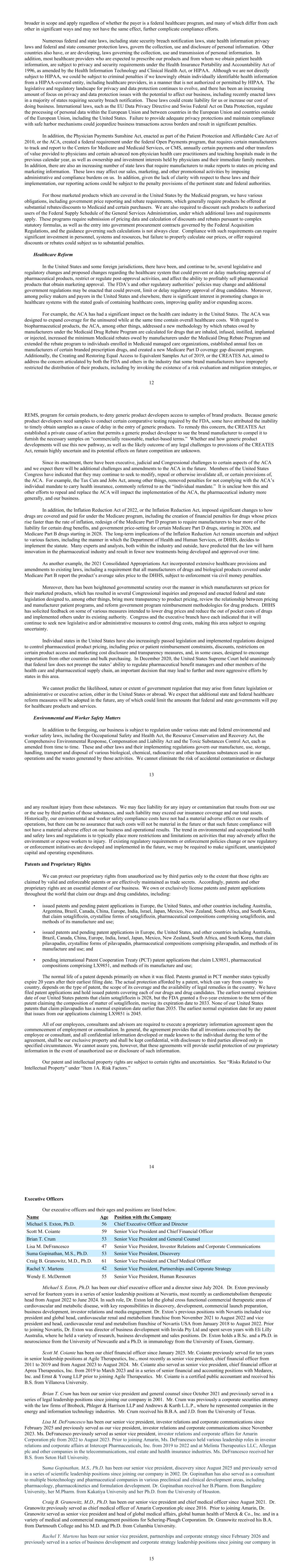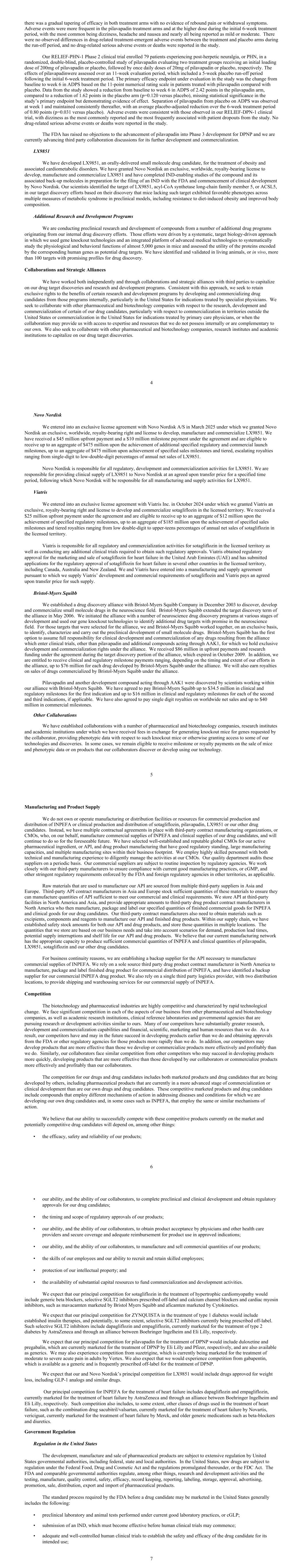 there was a gradual tapering of efficacy in both treatment arms with no evidence of rebound pain or withdrawal symptoms. Adverse events were more frequent in the pilavapadin treatment arms and at the higher dose during the initial 6-week treatment period, with the most common being dizziness, headache and nausea and nearly all being reported as mild or moderate. There were no observed differences in drug-related treatment-emergent adverse events between the treatment and placebo arms during the run-off period, and no drug-related serious adverse events or deaths were reported in the study. Our RELIEF-PHN-1 Phase 2 clinical trial enrolled 79 patients experiencing post-herpetic neuralgia, or PHN, in a randomized, double-blind, placebo-controlled study of pilavapadin evaluating two treatment groups receiving an initial loading dose of 200mg of pilavapadin or placebo, followed by once daily doses of 20mg of pilavapadin or placebo, respectively. The effects of pilavapadinwere assessed over an 11-week evaluation period, which included a 5-week placebo run-off period following the initial 6-week treatment period. The primary efficacy endpoint under evaluation in the study was the change from baseline to week 6 in ADPS based on the 11-point numerical rating scale in patients treated with pilavapadin compared with placebo. Data from the study showed a reduction from baseline to week 6 in ADPS of 2.42 points in the pilavapadin arm, compared to a reduction of 1.62 points in the placebo arm (p=0.120 versus placebo), missing statistical significance in the study’s primary endpoint but demonstrating evidence of effect. Separation of pilavapadin from placebo on ADPS was observed at week 1 and maintained consistently thereafter, with an average placebo-adjusted reduction over the 6-week treatment period of 0.80 points (p=0.031 versus placebo). Adverse events were consistent with those observed in our RELIEF-DPN-1 clinical trial, with dizziness as the most commonly reported and the most frequently associated with patient dropouts from the study. No drug-related serious adverse events or deaths were reported in the study. The FDA has raised no objections to the advancement of pilavapadin into Phase 3 development for DPNP and we are currently advancing third party collaboration discussions for its further development and commercialization. LX9851 We have developed LX9851, an orally-delivered small molecule drug candidate, for the treatment of obesity and associated cardiometabolic disorders. We have granted Novo Nordisk an exclusive, worldwide, royalty-bearing license to develop, manufacture and commercialize LX9851 and have completed IND-enabling studies of the compound and its associated back-up molecules in preparation for the filing of an IND with the FDA and commencement of clinical development by Novo Nordisk. Our scientists identified the target of LX9851, acyl-CoA synthetase long-chain family member 5, or ACSL5, in our target discovery efforts based on their discovery that mice lacking such target exhibited favorable phenotypes across multiple measures of metabolic syndrome in preclinical models, including resistance to diet-induced obesity and improved body composition. Additional Research and Development Programs We are conducting preclinical research and development of compounds from a number of additional drug programs originating from our internal drug discovery efforts. Those efforts were driven by a systematic, target biology-driven approach in which we used gene knockout technologies and an integrated platform of advanced medical technologies to systematically study the physiological and behavioral functions of almost 5,000 genes in mice and assessed the utility of the proteins encoded by the corresponding human genes as potential drug targets. We have identified and validated in living animals, or in vivo, more than 100 targets with promising profiles for drug discovery. Collaborations and Strategic Alliances We have worked both independently and through collaborations and strategic alliances with third parties to capitalize on our drug target discoveries and research and development programs. Consistent with this approach, we seek to retain exclusive rights to the benefits of certain research and development programs by developing and commercializing drug candidates from those programs internally, particularly in the United States for indications treated by specialist physicians. We seek to collaborate with other pharmaceutical and biotechnology companies with respect to the research, development and commercialization of certain of our drug candidates, particularly with respect to commercialization in territories outside the United States or commercialization in the United States for indications treated by primary care physicians, or when the collaboration may provide us with access to expertise and resources that we do not possess internally or are complementary to our own. We also seek to collaborate with other pharmaceutical and biotechnology companies, research institutes and academic institutions to capitalize on our drug target discoveries. 4 Novo Nordisk We entered into an exclusive license agreement with Novo Nordisk A/S in March 2025 under which we granted Novo Nordisk an exclusive, worldwide, royalty-bearing right and license to develop, manufacture and commercialize LX9851. We have received a $45 million upfront payment and a $10 million milestone payment under the agreement and are eligible to receive up to an aggregate of $475 million upon the achievement of additional specified regulatory and commercial launch milestones, up to an aggregate of $475 million upon achievement of specified sales milestones and tiered, escalating royalties ranging from single-digit to low-double-digit percentages of annual net sales of LX9851. Novo Nordisk is responsible for all regulatory, development and commercialization activities for LX9851. We are responsible for providing clinical supply