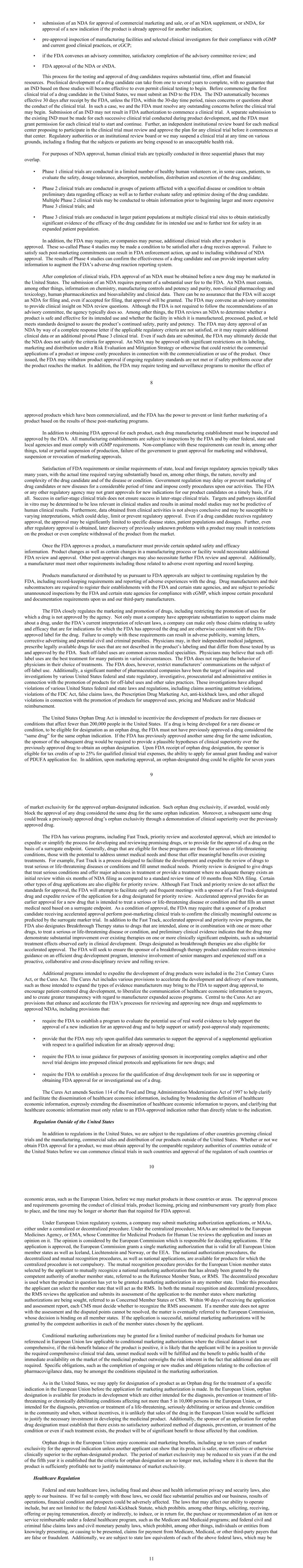 • submission of an NDA for approval of commercial marketing and sale, or of an NDA supplement, or sNDA, for approval of a new indication if the product is already approved for another indication; • pre-approval inspection of manufacturing facilities and selected clinical investigators for their compliance with cGMP and current good clinical practices, or cGCP; • if the FDA convenes an advisory committee, satisfactory completion of the advisory committee review; and • FDA approval of the NDA or sNDA. This process for the testing and approval of drug candidates requires substantial time, effort and financial resources. Preclinical development of a drug candidate can take from one to several years to complete, with no guarantee that an IND based on those studies will become effective to even permit clinical testing to begin. Before commencing the first clinical trial of a drug candidate in the United States, we must submit an IND to the FDA. The IND automatically becomes effective 30 days after receipt by the FDA, unless the FDA, within the 30-day time period, raises concerns or questions about the conduct of the clinical trial. In such a case, we and the FDA must resolve any outstanding concerns before the clinical trial may begin. Submission of an IND may not result in FDA authorization to commence a clinical trial. A separate submission to the existing IND must be made for each successive clinical trial conducted during product development, and the FDA must grant permission for each clinical trial to start and continue. Further, an independent institutional review board for each medical center proposing to participate in the clinical trial must review and approve the plan for any clinical trial before it commences at that center. Regulatory authorities or an institutional review board or we may suspend a clinical trial at any time on various grounds, including a finding that the subjects or patients are being exposed to an unacceptable health risk. For purposes of NDA approval, human clinical trials are typically conducted in three sequential phases that may overlap. • Phase 1 clinical trials are conducted in a limited number of healthy human volunteers or, in some cases, patients, to evaluate the safety, dosage tolerance, absorption, metabolism, distribution and excretion of the drug candidate; • Phase 2 clinical trials are conducted in groups of patients afflicted with a specified disease or condition to obtain preliminary data regarding efficacy as well as to further evaluate safety and optimize dosing of the drug candidate. Multiple Phase 2 clinical trials may be conducted to obtain information prior to beginning larger and more expensive Phase 3 clinical trials; and • Phase 3 clinical trials are conducted in larger patient populations at multiple clinical trial sites to obtain statistically significant evidence of the efficacy of the drug candidate for its intended use and to further test for safety in an expanded patient population. In addition, the FDA may require, or companies may pursue, additional clinical trials after a product is approved. These so-called Phase 4 studies may be made a condition to be satisfied after a drug receives approval. Failure to satisfy such post-marketing commitments can result in FDA enforcement action, up and to including withdrawal of NDA approval. The results of Phase 4 studies can confirm the effectiveness of a drug candidate and can provide important safety information to augment the FDA’s adverse drug reaction reporting system. After completion of clinical trials, FDA approval of an NDA must be obtained before a new drug may be marketed in the United States. The submission of an NDA requires payment of a substantial user fee to the FDA. An NDA must contain, among other things, information on chemistry, manufacturing controls and potency and purity, non-clinical pharmacology and toxicology, human pharmacokinetics and bioavailability and clinical data. There can be no assurance that the FDA will accept an NDA for filing and, even if accepted for filing, that approval will be granted. The FDA may convene an advisory committee to provide clinical insight on NDA review questions. Although the FDA is not required to follow the recommendations of an advisory committee, the agency typically does so. Among other things, the FDA reviews an NDA to determine whether a product is safe and effective for its intended use and whether the facility in which it is manufactured, processed, packed, or held meets standards designed to assure the product’s continued safety, purity and potency. The FDA may deny approval of an NDA by way of a complete response letter if the applicable regulatory criteria are not satisfied, or it may require additional clinical data or an additional pivotal Phase 3 clinical trial. Even if such data are submitted, the FDA may ultimately decide that the NDA does not satisfy the criteria for approval. An NDA may be approved with significant restrictions on its labeling, marketing and distribution under a Risk Evaluation and Mitigation Strategy or otherwise that could restrict the commercial applications of a product or impose costly procedures in connection with the commercialization or use of the product. Once issued, the FDA may withdraw product approval if ongoing regulatory standards are not met or if safety problems occur after the product reaches the market. In addition, the FDA may require testing and surveillance programs to monitor the effect of 8 approved products which have been commercialized, and the FDA has the power to prevent or limit further marketing of a product based on the results of these post-marketing programs. In addition to obtaining FDA approval for each product, each drug manufacturing establishment must be inspected and approved by the FDA. All manufacturing establishments are subject to inspections by the FDA and by other federal, state and local agencies and must comply with cGMP requirement