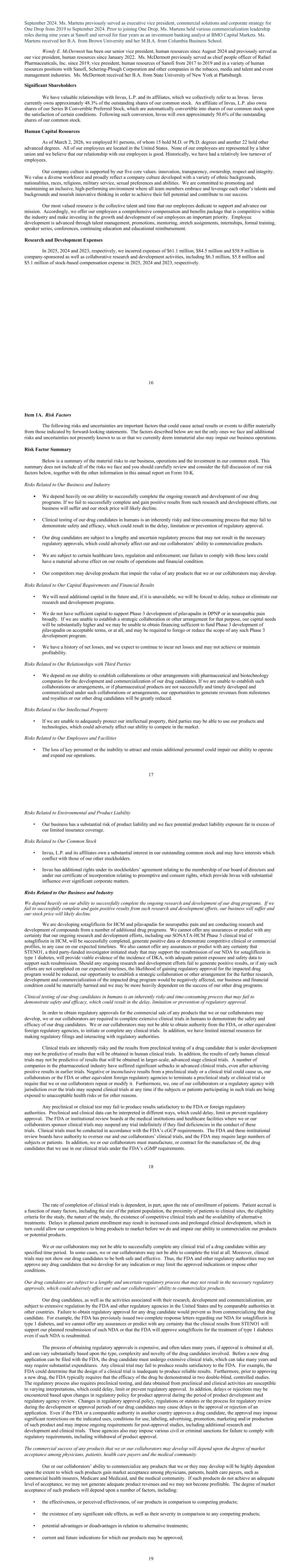 September 2024. Ms. Martens previously served as executive vice president, commercial solutions and corporate strategy for One Drop from 2019 to September 2024. Prior to joining One Drop, Ms. Martens held various commercialization leadership roles during nine years at Sanofi and served for four years as an investment banking analyst at BMO Capital Markets. Ms. Martens received her B.A. from Brown University and her M.B.A. from Columbia Business School. Wendy E. McDermott has been our senior vice president, human resources since August 2024 and previously served as our vice president, human resources since January 2022. Ms. McDermott previously served as chief people officer of Rafael Pharmaceuticals, Inc. since 2019, vice president, human resources of Sanofi from 2017 to 2019 and in a variety of human resources positions with Sanofi, Schering-Plough Corporation and other companies in the tobacco, media and talent and event management industries. Ms. McDermott received her B.A. from State University of New York at Plattsburgh. Significant Shareholders We have valuable relationships with Invus, L.P. and its affiliates, which we collectively refer to as Invus. Invus currently owns approximately 48.3% of the outstanding shares of our common stock. An affiliate of Invus, L.P. also owns shares of our Series B Convertible Preferred Stock, which are automatically convertible into shares of our common stock upon the satisfaction of certain conditions. Following such conversion, Invus will own approximately 50.6% of the outstanding shares of our common stock. Human Capital Resources As of March 2, 2026, we employed 81 persons, of whom 15 hold M.D. or Ph.D. degrees and another 22 hold other advanced degrees. All of our employees are located in the United States. None of our employees are represented by a labor union and we believe that our relationship with our employees is good. Historically, we have had a relatively low turnover of employees. Our company culture is supported by our five core values: innovation, transparency, ownership, respect and integrity. We value a diverse workforce and proudly reflect a company culture developed with a variety of ethnic backgrounds, nationalities, races, religions, military service, sexual preferences and abilities. We are committed to promoting and maintaining an inclusive, high-performing environment where all team members embrace and leverage each other’s talents and backgrounds and nourish innovative thinking in order to achieve their full potential and contribute to our success. Our most valued resource is the collective talent and time that our employees dedicate to support and advance our mission. Accordingly, we offer our employees a comprehensive compensation and benefits package that is competitive within the industry and make investing in the growth and development of our employees an important priority. Employee development is advanced through talent management, promotions, mentoring, stretch assignments, internships, formal training, speaker series, conferences, continuing education and educational reimbursement. Research and Development Expenses In 2025, 2024 and 2023, respectively, we incurred expenses of $61.1 million, $84.5 million and $58.9 million in company-sponsored as well as collaborative research and development activities, including $6.3 million, $5.8 million and $5.1 million of stock-based compensation expense in 2025, 2024 and 2023, respectively. 16 Item 1A. Risk Factors The following risks and uncertainties are important factors that could cause actual results or events to differ materially from those indicated by forward-looking statements. The factors described below are not the only ones we face and additional risks and uncertainties not presently known to us or that we currently deem immaterial also may impair our business operations. Risk Factor Summary Below is a summary of the material risks to our business, operations and the investment in our common stock. This summary does not include all of the risks we face and you should carefully review and consider the full discussion of our risk factors below, together with the other information in this annual report on Form 10-K. Risks Related to Our Business and Industry • We depend heavily on our ability to successfully complete the ongoing research and development of our drug programs. If we fail to successfully complete and gain positive results from such research and development efforts, our business will suffer and our stock price will likely decline. • Clinical testing of our drug candidates in humans is an inherently risky and time-consuming process that may fail to demonstrate safety and efficacy, which could result in the delay, limitation or prevention of regulatory approval. • Our drug candidates are subject to a lengthy and uncertain regulatory process that may not result in the necessary regulatory approvals, which could adversely affect our and our collaborators’ ability to commercialize products. • We are subject to certain healthcare laws, regulation and enforcement; our failure to comply with those laws could have a material adverse effect on our results of operations and financial condition. • Our competitors may develop products that impair the value of any products that we or our collaborators may develop. Risks Related to Our Capital Requirements and Financial Results • We will need additional capital in the future and, if it is unavailable, we will be forced to delay, reduce or eliminate our research and development programs. • We do not have sufficient capital to support Phase 3 development of pilavapadin in DPNP or in neuropathic pain broadly. If we are unable to establish a strategic collaboration or other arrangement for that purpose, our capital needs will be substantially higher and we may be unable to obtain financing sufficient to fund Phase 3 development of pilavapadin on acceptable terms, or at all, and may be required to forego o