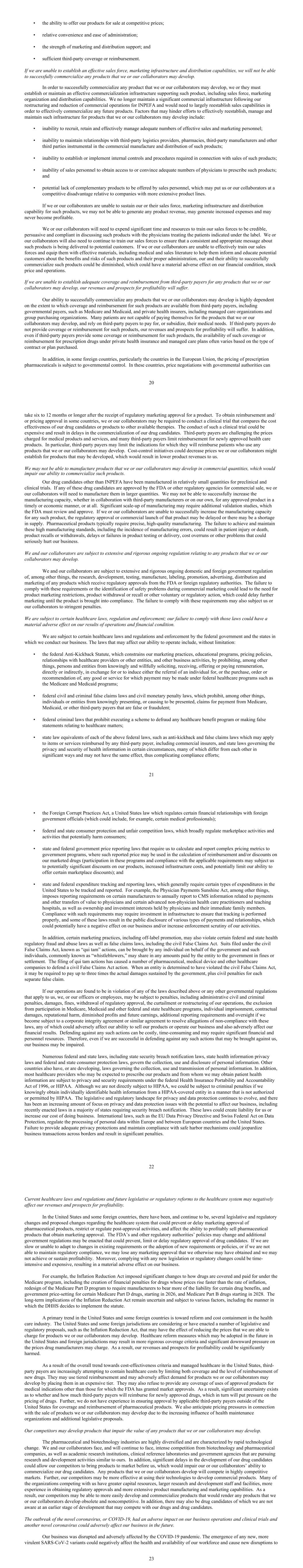 • the ability to offer our products for sale at competitive prices; • relative convenience and ease of administration; • the strength of marketing and distribution support; and • sufficient third-party coverage or reimbursement. If we are unable to establish an effective sales force, marketing infrastructure and distribution capabilities, we will not be able to successfully commercialize any products that we or our collaborators may develop. In order to successfully commercialize any product that we or our collaborators may develop, we or they must establish or maintain an effective commercialization infrastructure supporting such product, including sales force, marketing organization and distribution capabilities. We no longer maintain a significant commercial infrastructure following our restructuring and reduction of commercial operations for INPEFA and would need to largely reestablish sales capabilities in order to effectively commercialize any future products. Factors that may hinder efforts to effectively reestablish, manage and maintain such infrastructure for products that we or our collaborators may develop include: • inability to recruit, retain and effectively manage adequate numbers of effective sales and marketing personnel; • inability to maintain relationships with third-party logistics providers, pharmacies, third-party manufacturers and other third parties instrumental in the commercial manufacture and distribution of such products; • inability to establish or implement internal controls and procedures required in connection with sales of such products; • inability of sales personnel to obtain access to or convince adequate numbers of physicians to prescribe such products; and • potential lack of complementary products to be offered by sales personnel, which may put us or our collaborators at a competitive disadvantage relative to companies with more extensive product lines. If we or our collaborators are unable to sustain our or their sales force, marketing infrastructure and distribution capability for such products, we may not be able to generate any product revenue, may generate increased expenses and may never become profitable. We or our collaborators will need to expend significant time and resources to train our sales forces to be credible, persuasive and compliant in discussing such products with the physicians treating the patients indicated under the label. We or our collaborators will also need to continue to train our sales forces to ensure that a consistent and appropriate message about such products is being delivered to potential customers. If we or our collaborators are unable to effectively train our sales forces and equip them with effective materials, including medical and sales literature to help them inform and educate potential customers about the benefits and risks of such products and their proper administration, our and their ability to successfully commercialize such products could be diminished, which could have a material adverse effect on our financial condition, stock price and operations. If we are unable to establish adequate coverage and reimbursement from third-party payers for any products that we or our collaborators may develop, our revenues and prospects for profitability will suffer. Our ability to successfully commercialize any products that we or our collaborators may develop is highly dependent on the extent to which coverage and reimbursement for such products are available from third-party payers, including governmental payers, such as Medicare and Medicaid, and private health insurers, including managed care organizations and group purchasing organizations. Many patients are not capable of paying themselves for the products that we or our collaborators may develop, and rely on third-party payers to pay for, or subsidize, their medical needs. If third-party payers do not provide coverage or reimbursement for such products, our revenues and prospects for profitability will suffer. In addition, even if third-party payers provide some coverage or reimbursement for such products, the availability of such coverage or reimbursement for prescription drugs under private health insurance and managed care plans often varies based on the type of contract or plan purchased. In addition, in some foreign countries, particularly the countries in the European Union, the pricing of prescription pharmaceuticals is subject to governmental control. In these countries, price negotiations with governmental authorities can 20 take six to 12 months or longer after the receipt of regulatory marketing approval for a product. To obtain reimbursement and/ or pricing approval in some countries, we or our collaborators may be required to conduct a clinical trial that compares the cost effectiveness of our drug candidates or products to other available therapies. The conduct of such a clinical trial could be expensive and result in delays in the commercialization of our drug candidates. Third-party payers are challenging the prices charged for medical products and services, and many third-party payers limit reimbursement for newly approved health care products. In particular, third-party payers may limit the indications for which they will reimburse patients who use any products that we or our collaborators may develop. Cost-control initiatives could decrease prices we or our collaborators might establish for products that may be developed, which would result in lower product revenues to us. We may not be able to manufacture products that we or our collaborators may develop in commercial quantities, which would impair our ability to commercialize such products. Our drug candidates other than INPEFA have been manufactured in relatively small quantities for preclinical and clinical trials. If any of these drug candidates are approved by the FDA or other regulatory agencies for commercial sale, we or our collaborators will need to manufactur