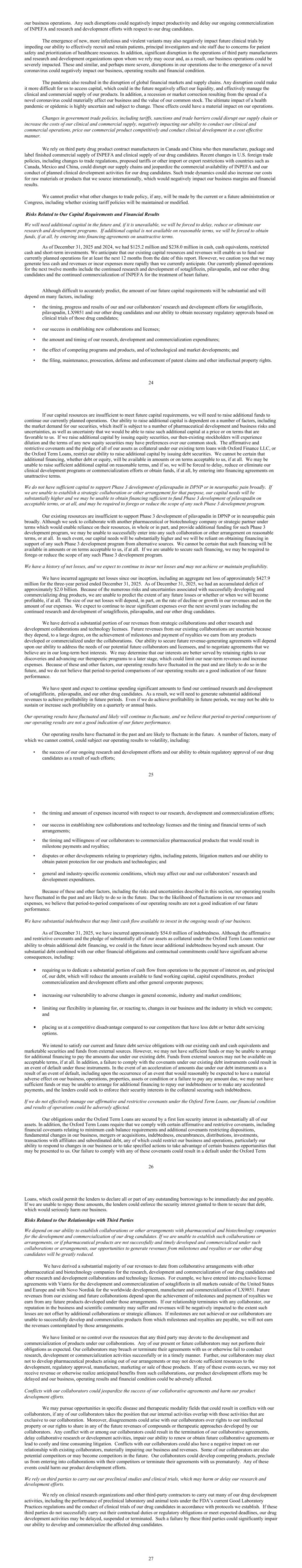 our business operations. Any such disruptions could negatively impact productivity and delay our ongoing commercialization of INPEFA and research and development efforts with respect to our drug candidates. The emergence of new, more infectious and virulent variants may also negatively impact future clinical trials by impeding our ability to effectively recruit and retain patients, principal investigators and site staff due to concerns for patient safety and prioritization of healthcare resources. In addition, significant disruption in the operations of third party manufacturers and research and development organizations upon whom we rely may occur and, as a result, our business operations could be severely impacted. These and similar, and perhaps more severe, disruptions in our operations due to the emergence of a novel coronavirus could negatively impact our business, operating results and financial condition. The pandemic also resulted in the disruption of global financial markets and supply chains. Any disruption could make it more difficult for us to access capital, which could in the future negatively affect our liquidity, and effectively manage the clinical and commercial supply of our products. In addition, a recession or market correction resulting from the spread of a novel coronavirus could materially affect our business and the value of our common stock. The ultimate impact of a health pandemic or epidemic is highly uncertain and subject to change. These effects could have a material impact on our operations. Changes in government trade policies, including tariffs, sanctions and trade barriers could disrupt our supply chain or increase the costs of our clinical and commercial supply, negatively impacting our ability to conduct our clinical and commercial operations, price our commercial product competitively and conduct clinical development in a cost effective manner. We rely on third party drug product contract manufacturers in Canada and China who then manufacture, package and label finished commercial supply of INPEFA and clinical supply of our drug candidates. Recent changes in U.S. foreign trade policies, including changes to trade regulations, proposed tariffs or other import or export restrictions with countries such as Canada, Mexico and China, could disrupt our supply chains and jeopardize the commercial availability of INPEFA and our conduct of planned clinical development activities for our drug candidates. Such trade dynamics could also increase our costs for raw materials or products that we source internationally, which would negatively impact our business margins and financial results. We cannot predict what other changes to trade policy, if any, will be made by the current or a future administration or Congress, including whether existing tariff policies will be maintained or modified. Risks Related to Our Capital Requirements and Financial Results We will need additional capital in the future and, if it is unavailable, we will be forced to delay, reduce or eliminate our research and development programs. If additional capital is not available on reasonable terms, we will be forced to obtain funds, if at all, by entering into financing agreements on unattractive terms. As of December 31, 2025 and 2024, we had $125.2 million and $238.0 million in cash, cash equivalents, restricted cash and short-term investments. We anticipate that our existing capital resources and revenues will enable us to fund our currently planned operations for at least the next 12 months from the date of this report. However, we caution you that we may generate less cash and revenues or incur expenses more rapidly than we currently anticipate. Our currently planned operations for the next twelve months include the continued research and development of sotagliflozin, pilavapadin, and our other drug candidates and the continued commercialization of INPEFA for the treatment of heart failure. Although difficult to accurately predict, the amount of our future capital requirements will be substantial and will depend on many factors, including: • the timing, progress and results of our and our collaborators’ research and development efforts for sotagliflozin, pilavapadin, LX9851 and our other drug candidates and our ability to obtain necessary regulatory approvals based on clinical trials of those drug candidates; • our success in establishing new collaborations and licenses; • the amount and timing of our research, development and commercialization expenditures; • the effect of competing programs and products, and of technological and market developments; and • the filing, maintenance, prosecution, defense and enforcement of patent claims and other intellectual property rights. 24 If our capital resources are insufficient to meet future capital requirements, we will need to raise additional funds to continue our currently planned operations. Our ability to raise additional capital is dependent on a number of factors, including the market demand for our securities, which itself is subject to a number of pharmaceutical development and business risks and uncertainties, as well as uncertainty that we would be able to raise such additional capital at a price or on terms that are favorable to us. If we raise additional capital by issuing equity securities, our then-existing stockholders will experience dilution and the terms of any new equity securities may have preferences over our common stock. The affirmative and restrictive covenants and the pledge of all of our assets as collateral under our existing term loans with Oxford Finance LLC, or the Oxford Term Loans, restrict our ability to raise additional capital by issuing debt securities. We cannot be certain that additional financing, whether debt or equity, will be available in amounts or on terms acceptable to us, if at all. We may be unable to raise sufficient additional capital on reasonable terms, and if so, we will be forced to